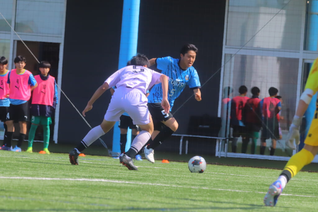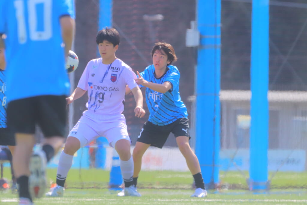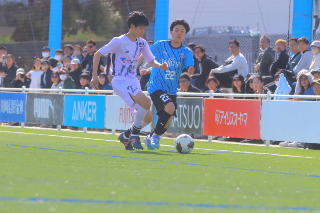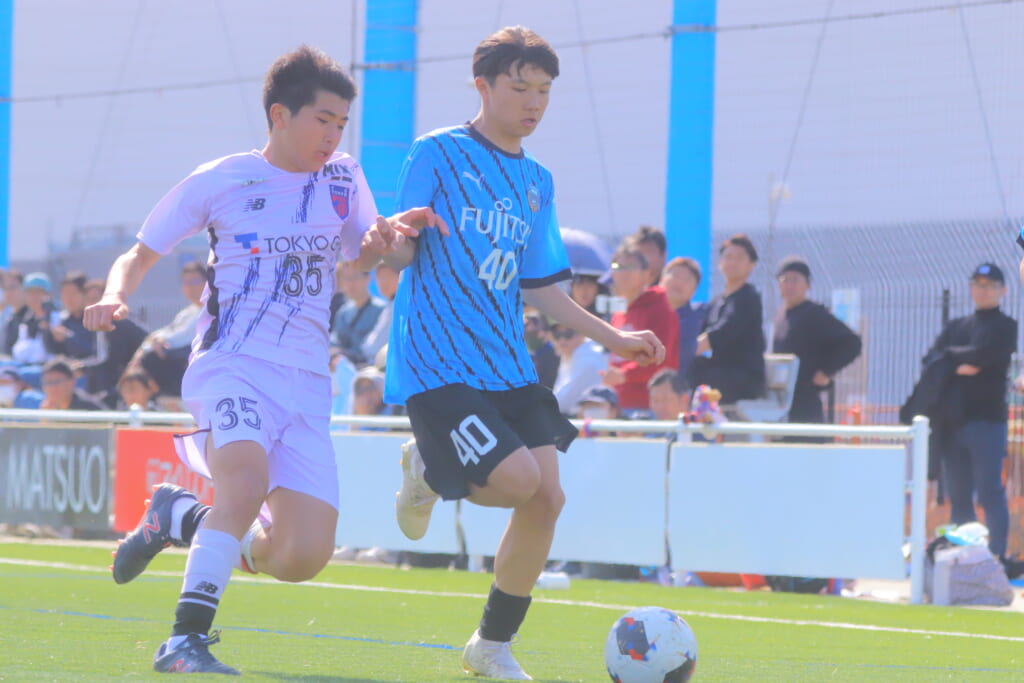 後ろから組み立てを図るFC東京深川に対し、佐藤や吉澤がプレス。前から連動して奪いに行くフロンターレ生田。
