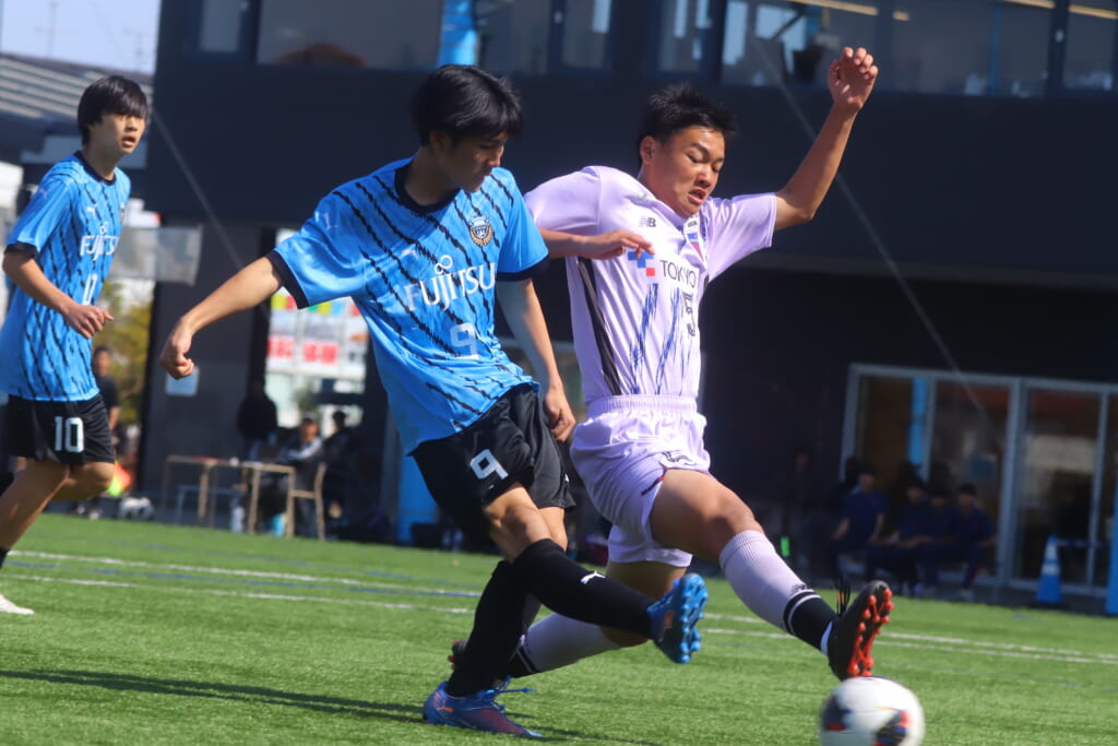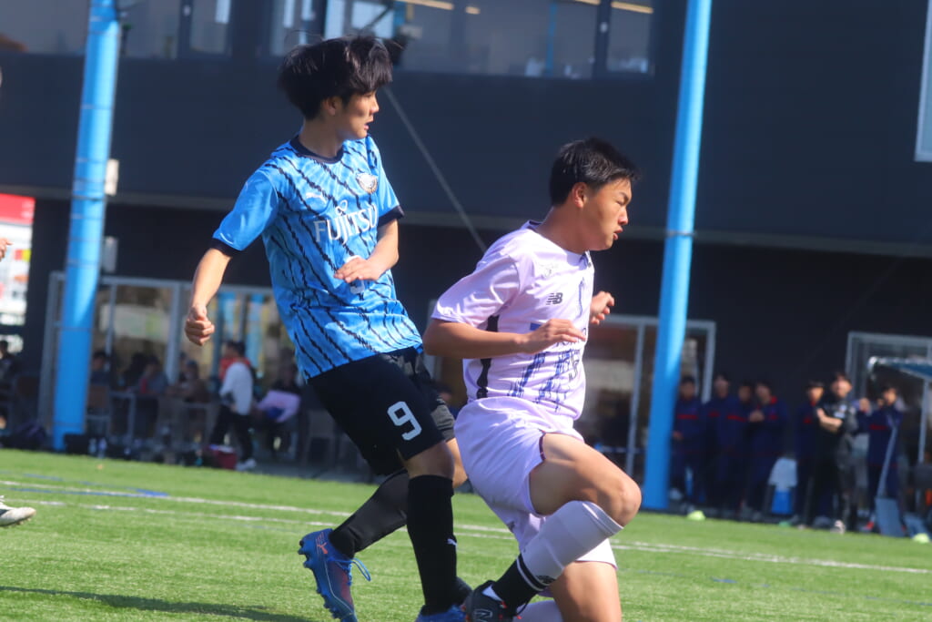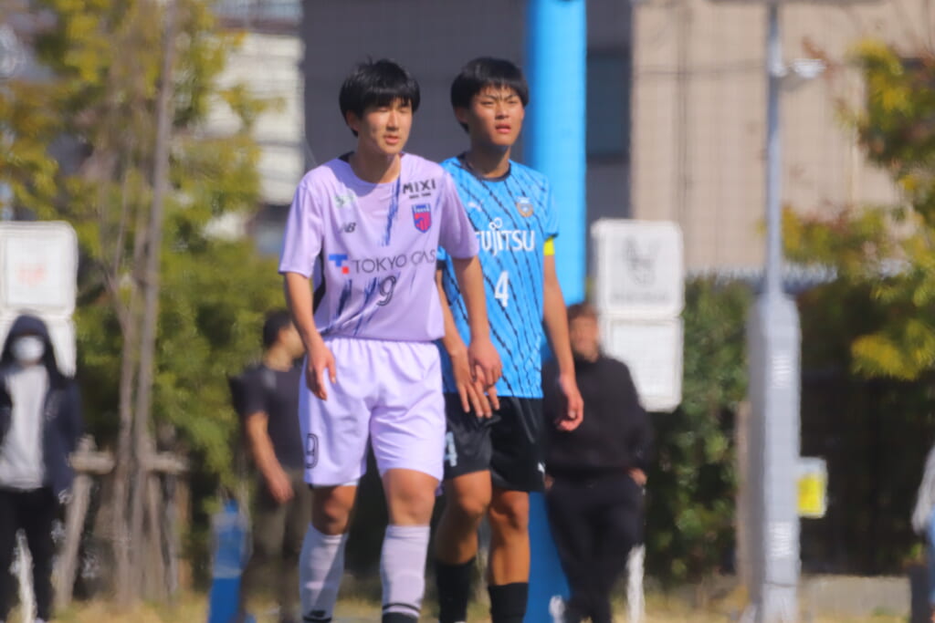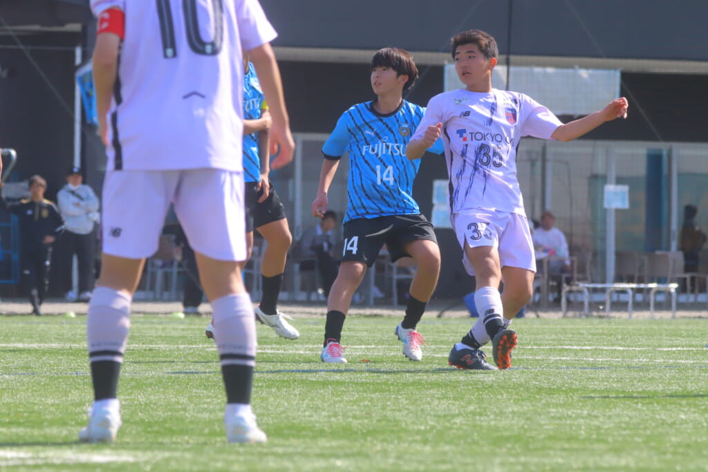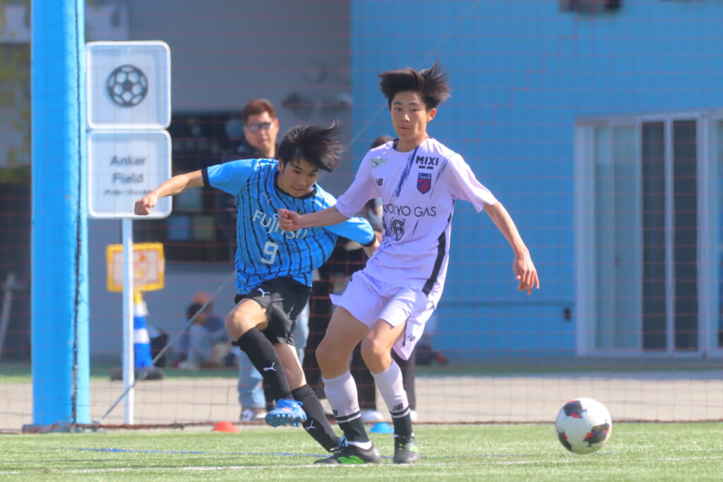後ろから組み立てを図るFC東京深川に対し、佐藤や吉澤がプレス。前から連動して奪いに行くフロンターレ生田。