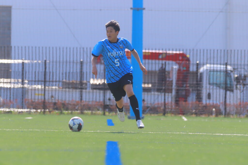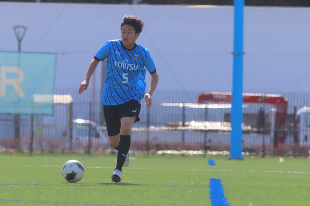 FC東京深川が左サイドへ持ち込んできたところ、都島が体を入れ、マイボールに。再びそこから自分たちでボールを動かす姿勢を見せていくフロンターレ生田。