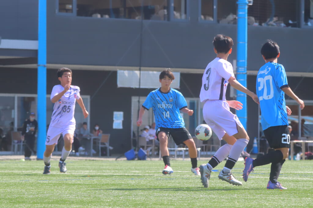 後ろからボールをつないでいくフロンターレ生田に対し、FC東京深川はカット。それに対し、コンパクトに対応。