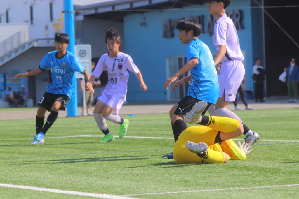 さらにつないでいこうとするFC東京深川。しかし、フロンターレ生田はカット。21分には、左サイド、新堀のクロスに佐藤が正面へ。