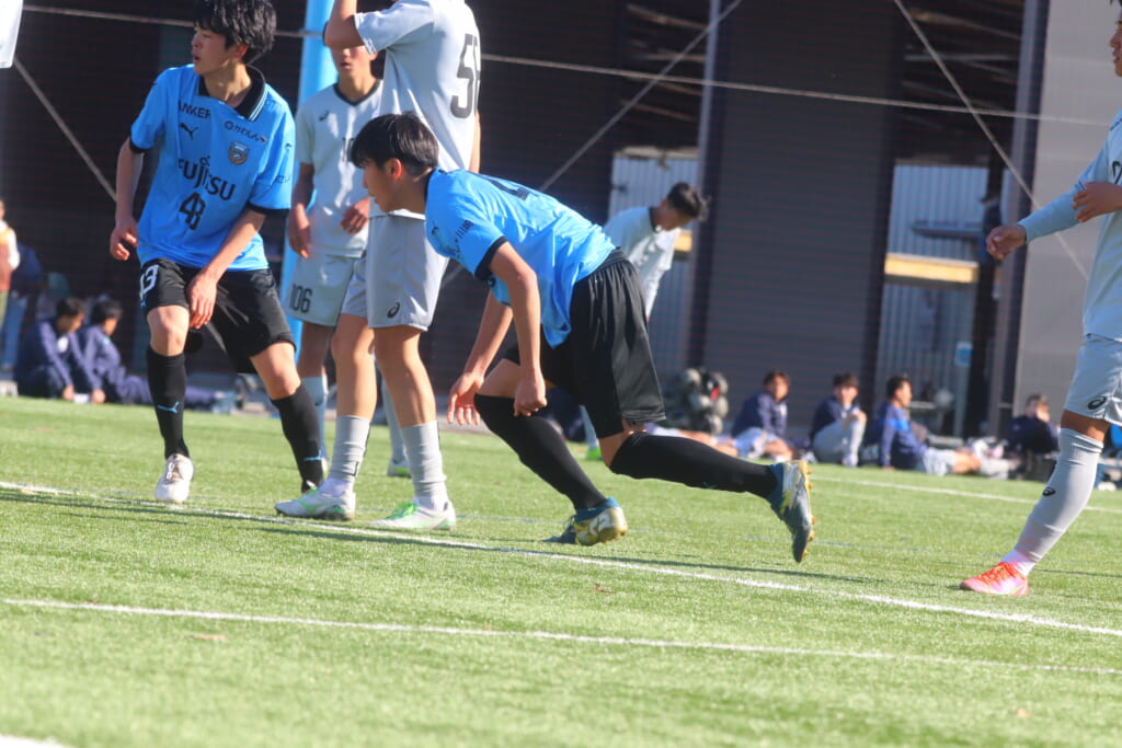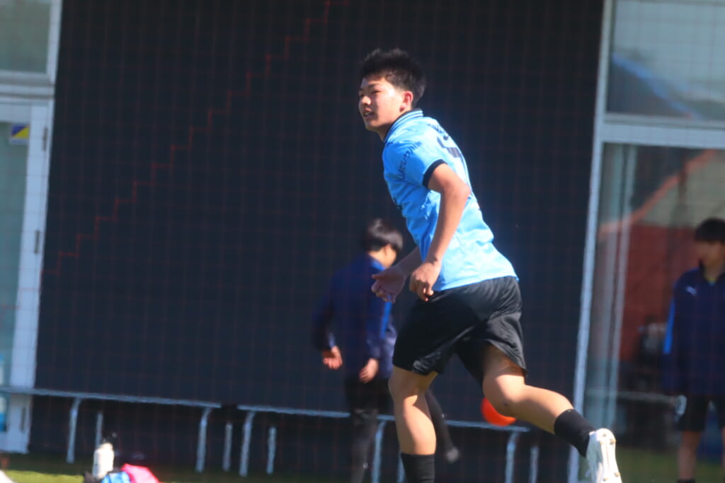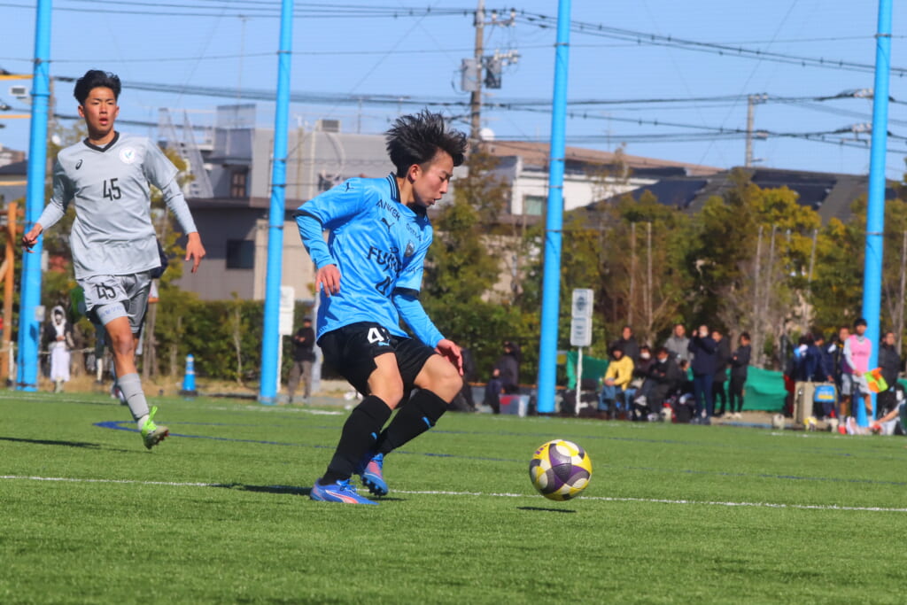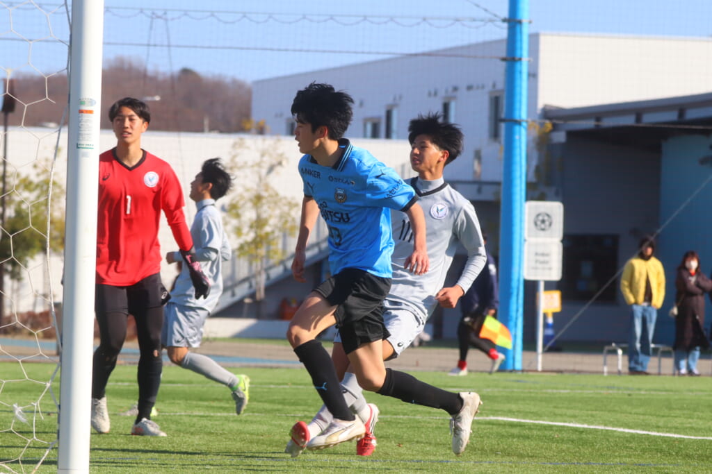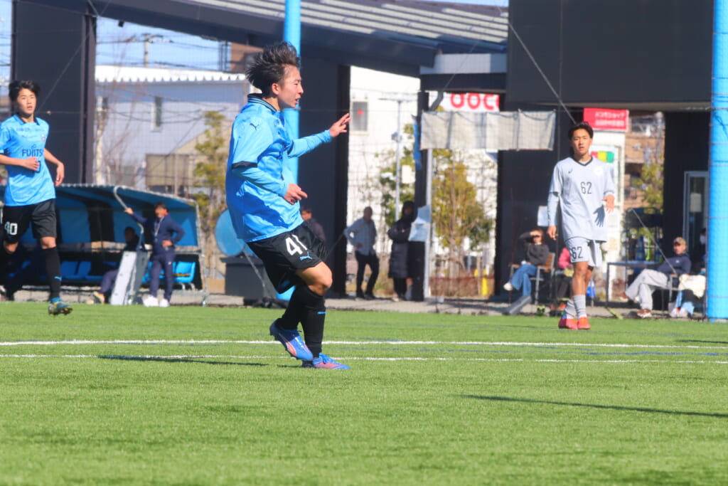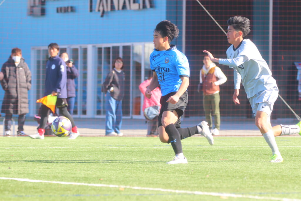 フロンターレは、長崎や猪又が後ろで動かしていき、5分には、長崎のフィードに全が正面への動き出し。ここも山梨学院高校の対応に遭い、シュートを打つことはできませんでしたが、長いボールを交え、いい動き出しも見せながら、チャンスをつくろうとしていきます。