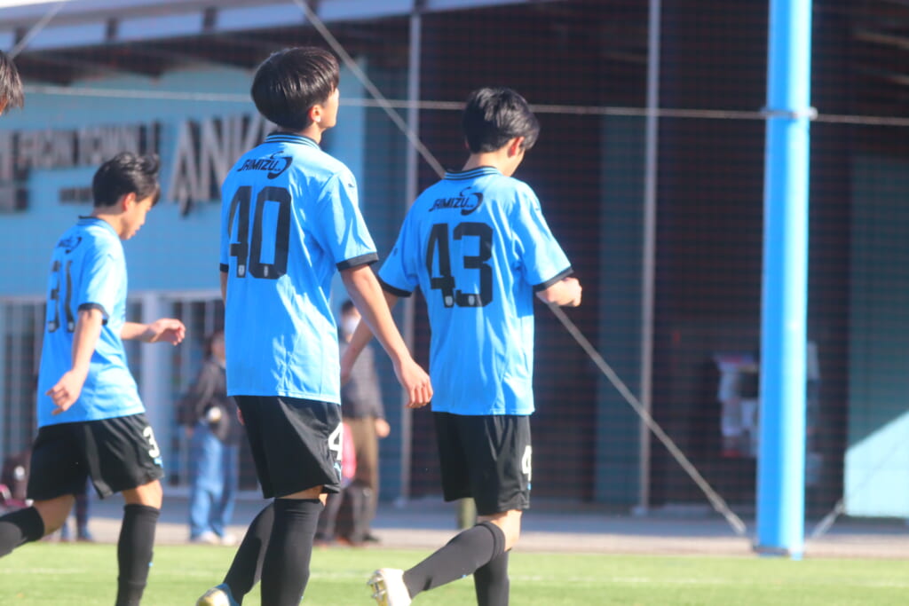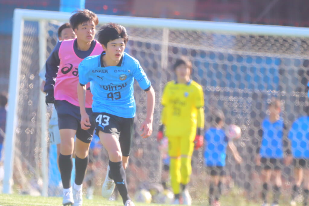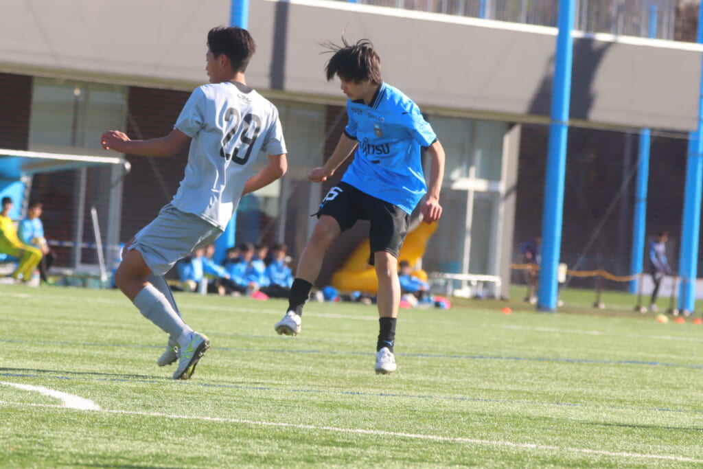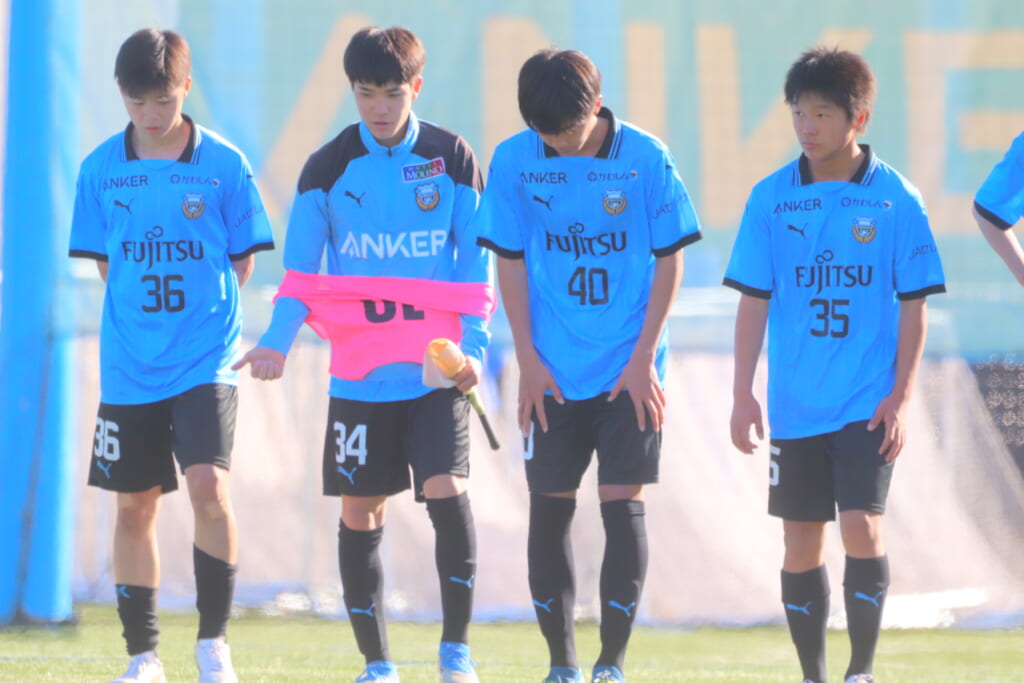 2本目、フロンターレはGKにフロンターレ生田から昇格の1年21小村風人、FPは1本目から引き続き、最終ラインは右から7小川翔太、28猪又聖生、5長崎亘佑、30吉田琉海、ボランチは23坂井暉絃、34中野大虎、右MF14全天海、左MF27武内勇人、前線には41初音虎次郎、45吉澤映杜。