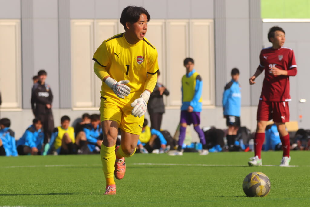 尚志高校は、川崎フロンターレU-15生田出身のGK1髙橋壱梛が出場。ボールをしっかり後ろからつないでいくサッカーを尚志が志向するなか、髙橋もボールを積極的に受け、ビルドアップに参加。