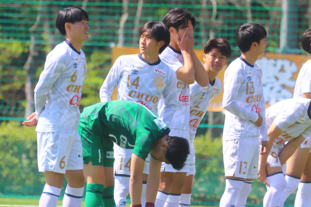 再び追いかける中央大。直後には、右サイドでスローインを得ると、常藤のロングスローから新がバイシクルシュート。しかし、左に。