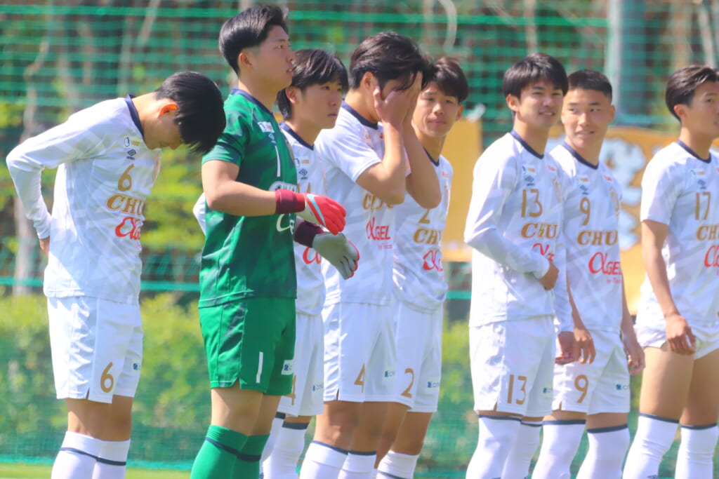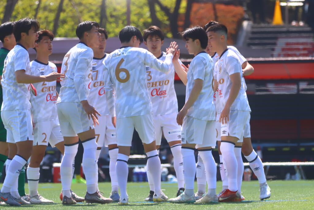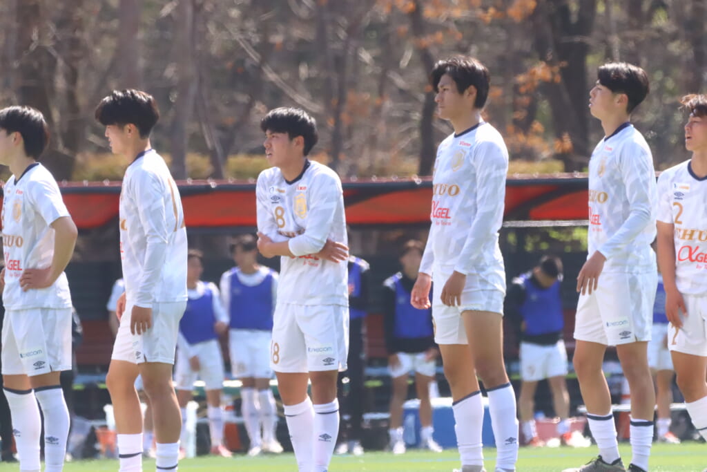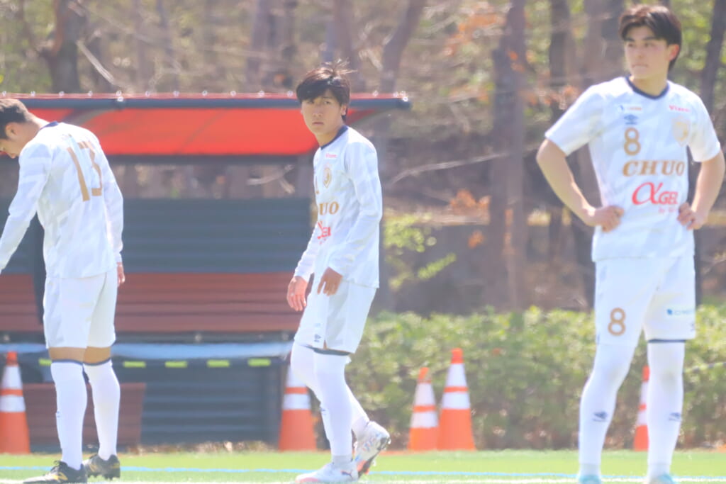 中央大の先発は、GK1磯村颯、最終ラインは右からキャプテンの3常藤奏、4中光叶多、2鷹取駿也、ボランチは8長田叶羽、13岡崎大智、右のウイングバックに6牧嶋波亜斗、左のウイングバックに17中野裕唯、2シャドーに9古川大洋、14尾川丈、前線には10北浜琉星。