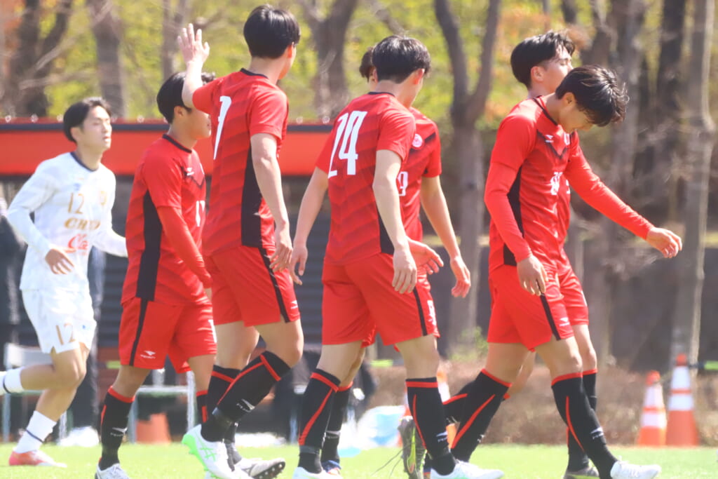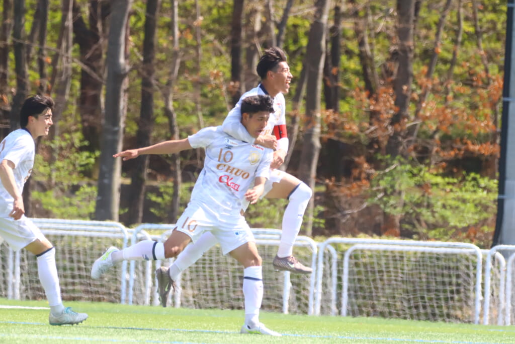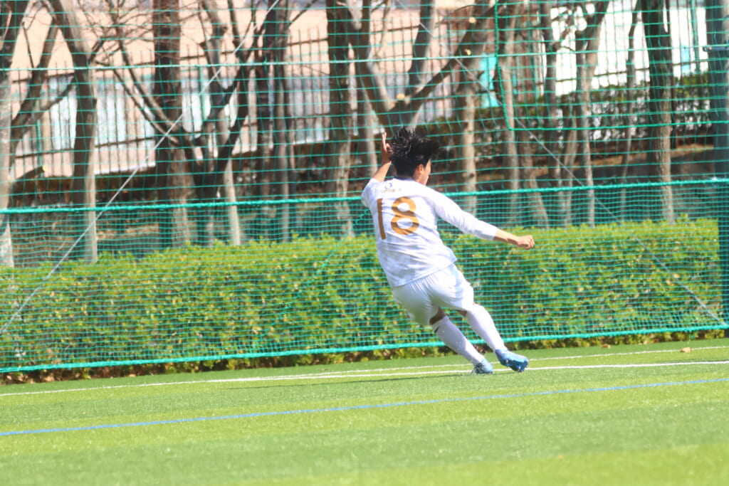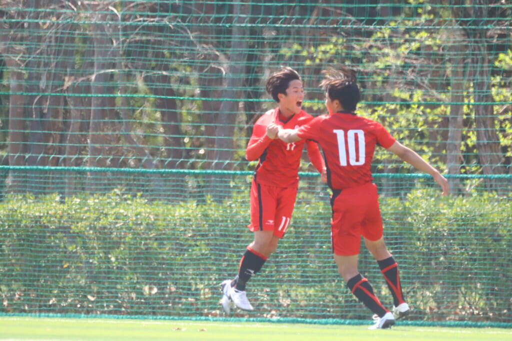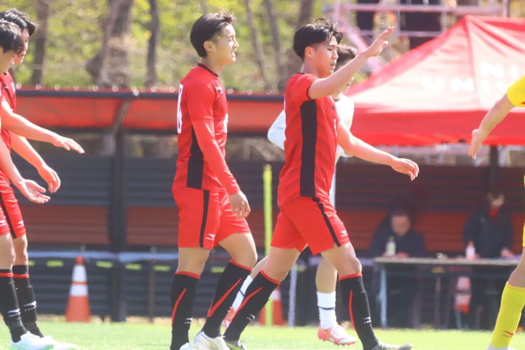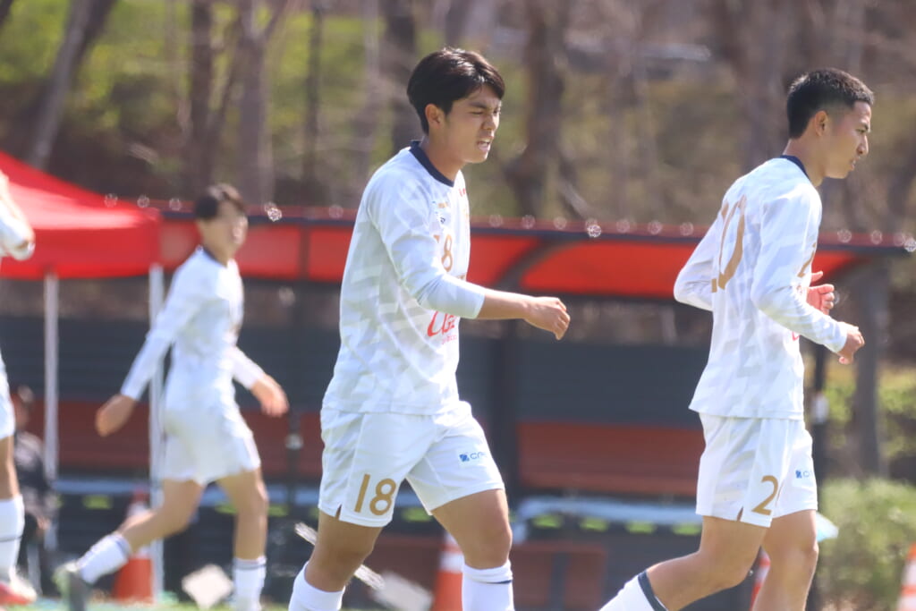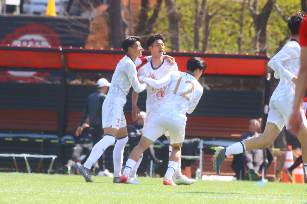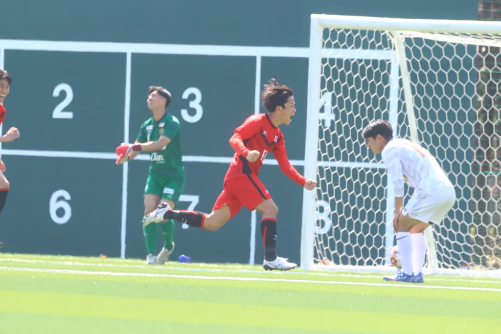 すると6分には、中央大、左サイドで岡野一、鷹取がかかわってボールを動かし、鷹取が左クロス。頭で合わせたのは北浜。これが決まり、1-1。