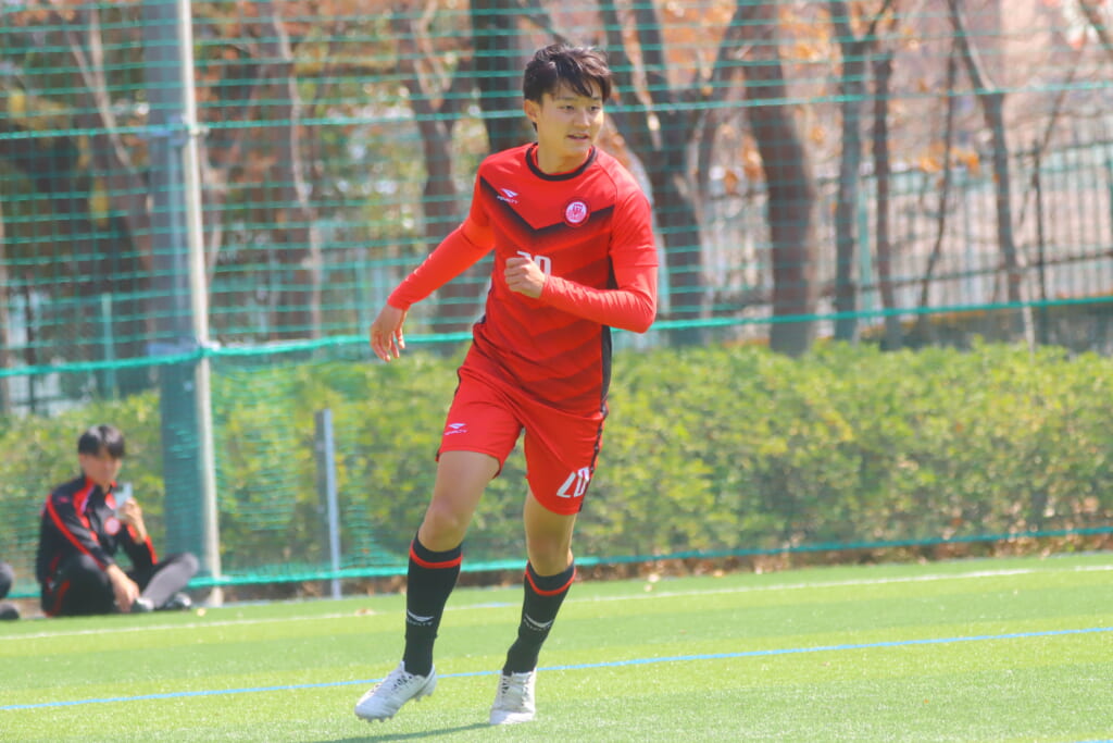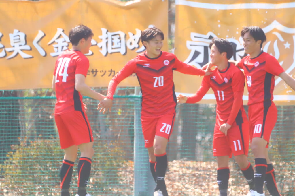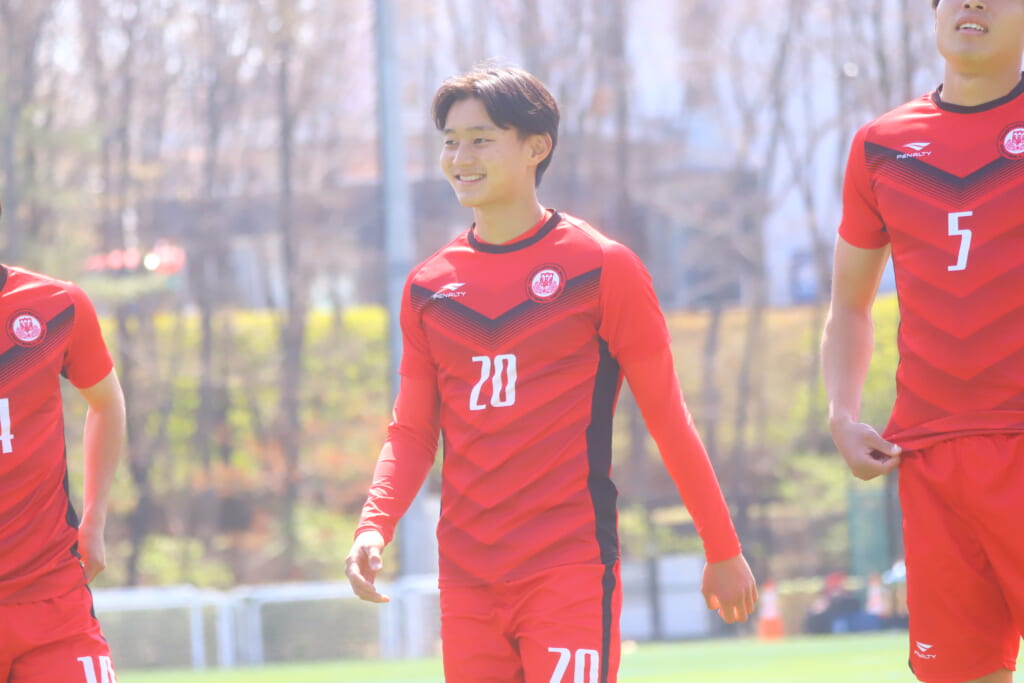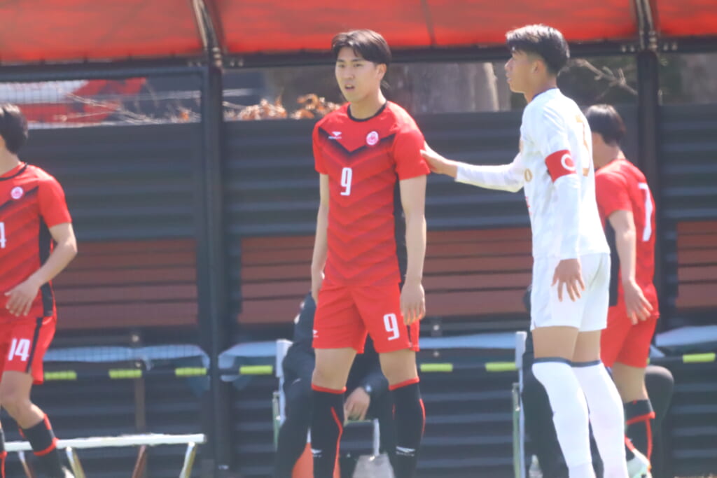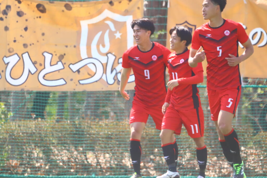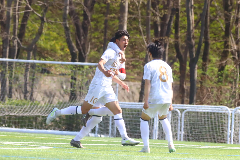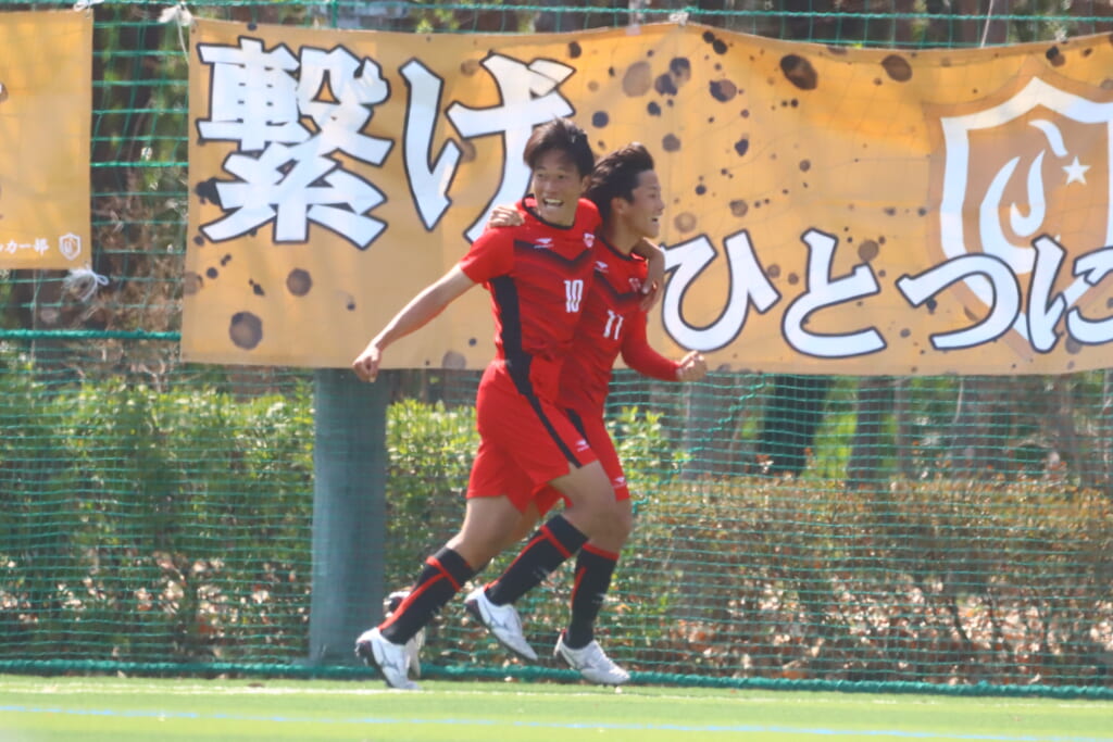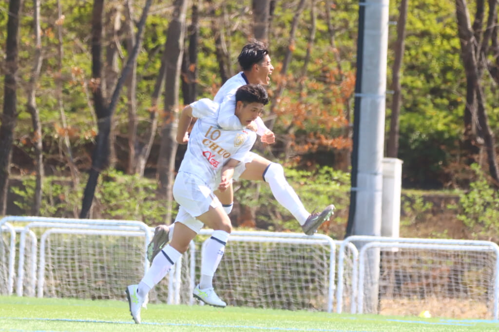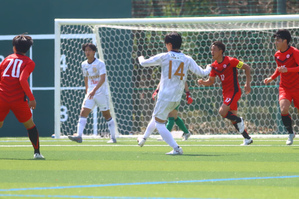 すると6分には、中央大、左サイドで岡野一、鷹取がかかわってボールを動かし、鷹取が左クロス。頭で合わせたのは北浜。これが決まり、1-1。