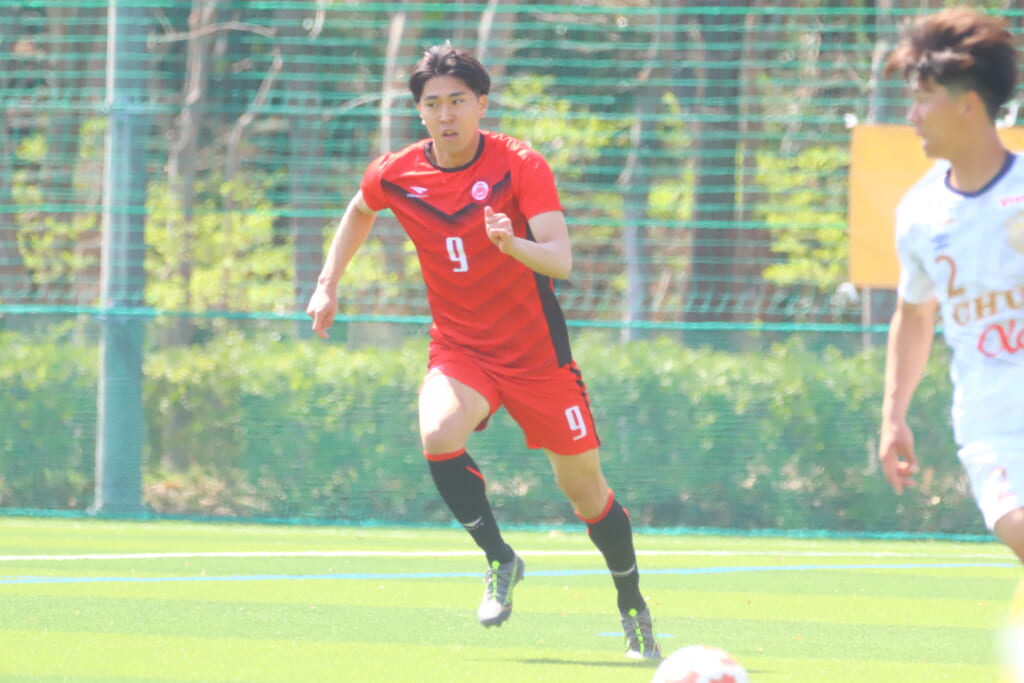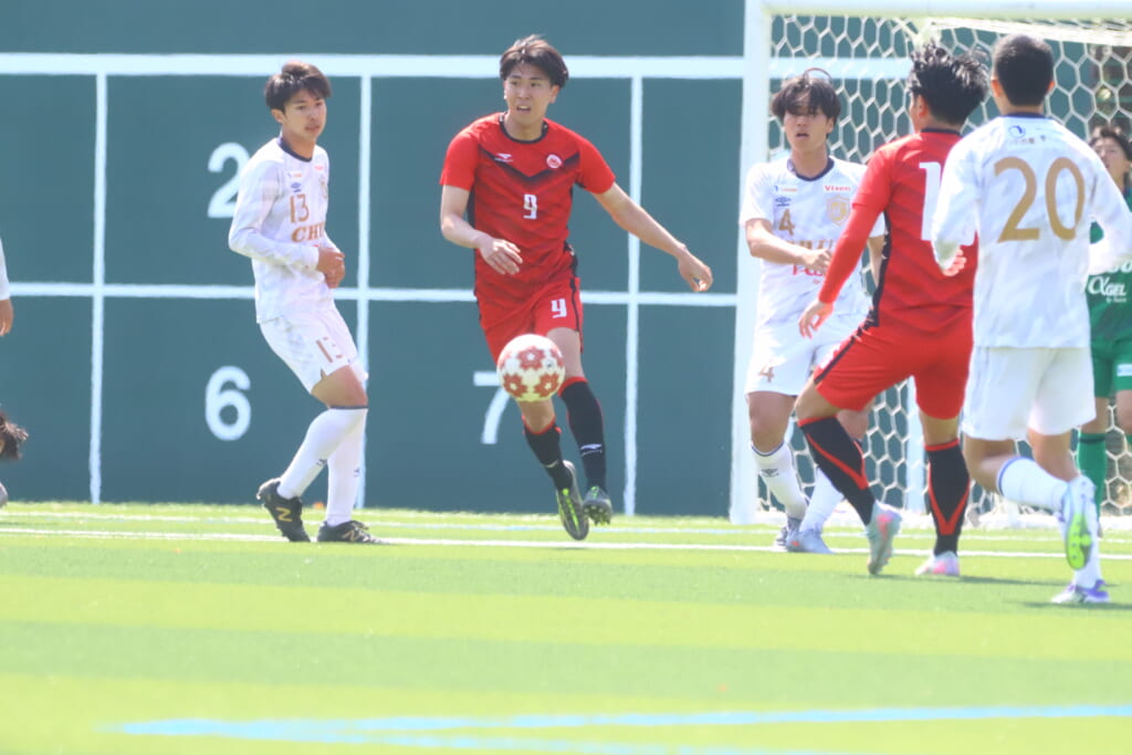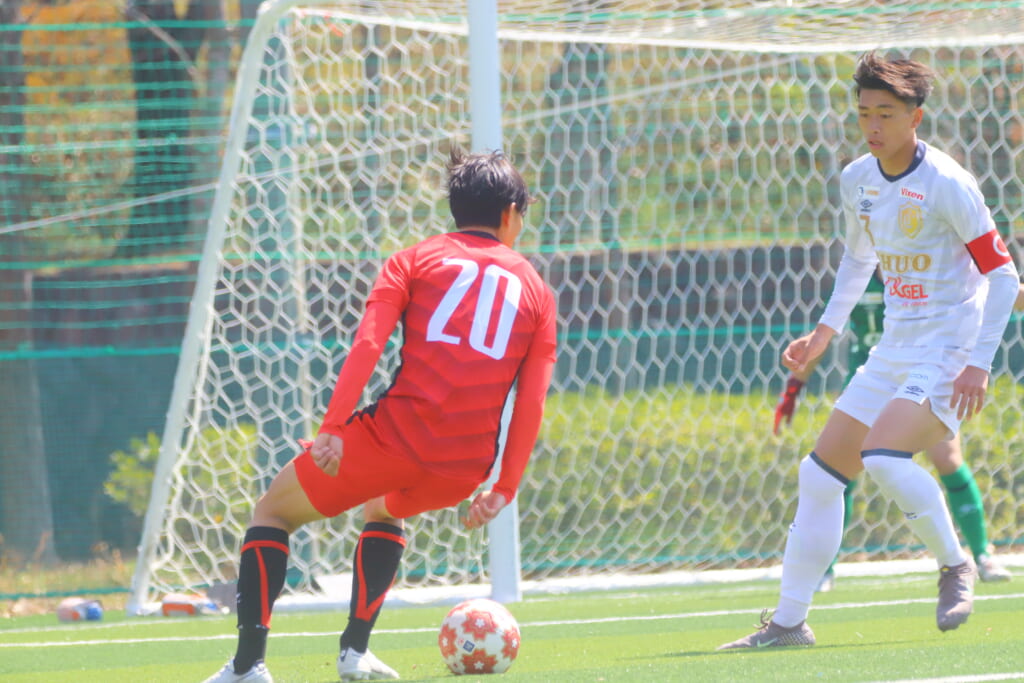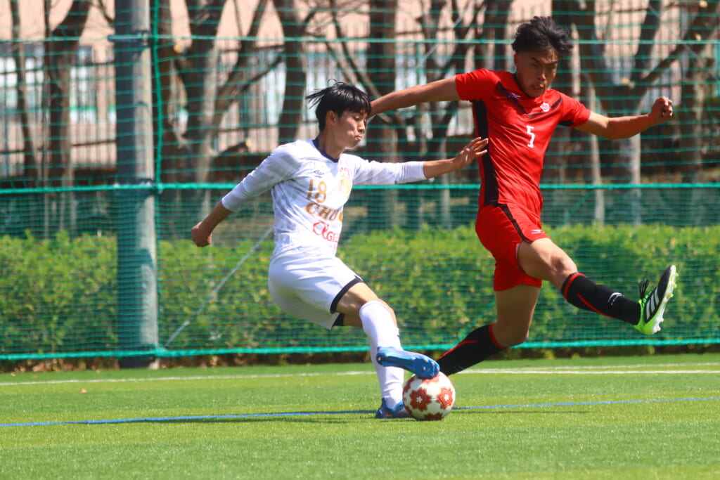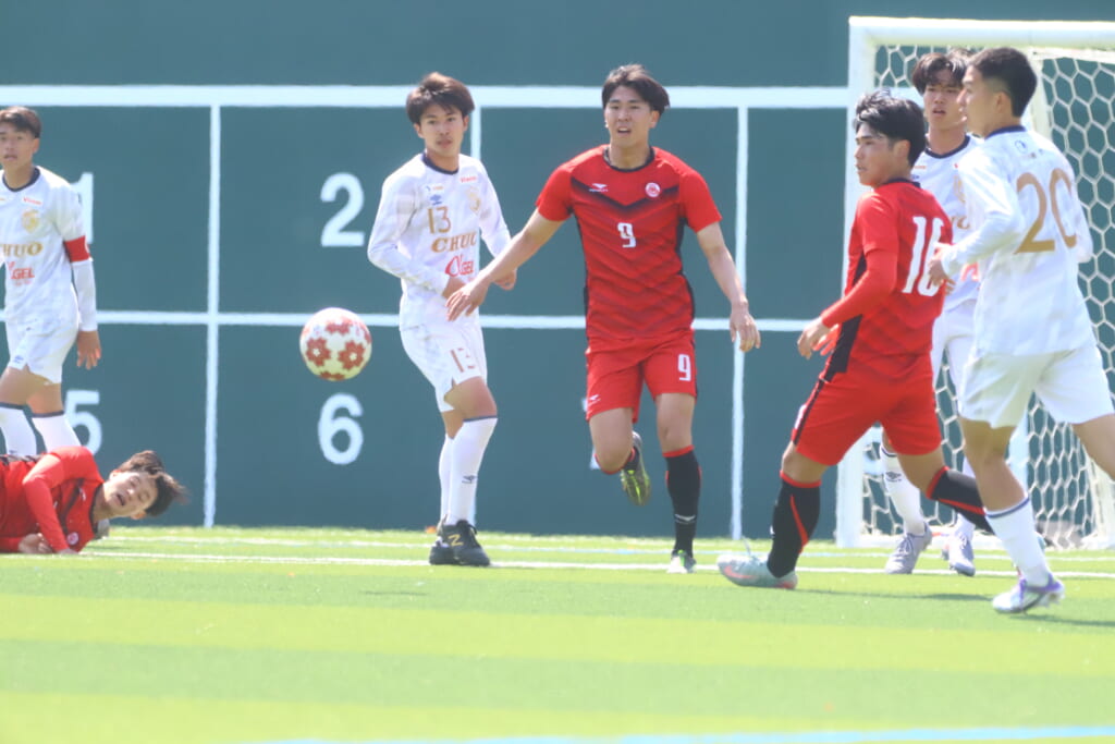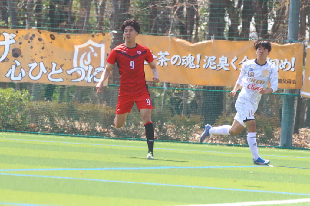 中央大も、組み立てを図る日本大に対し、北浜らが前からプレス。左サイドでスローインを得ると、フィードに古川が正面への動き出し。