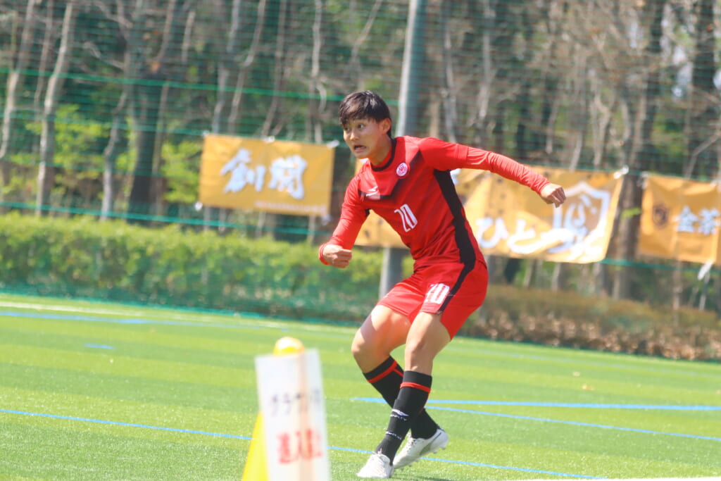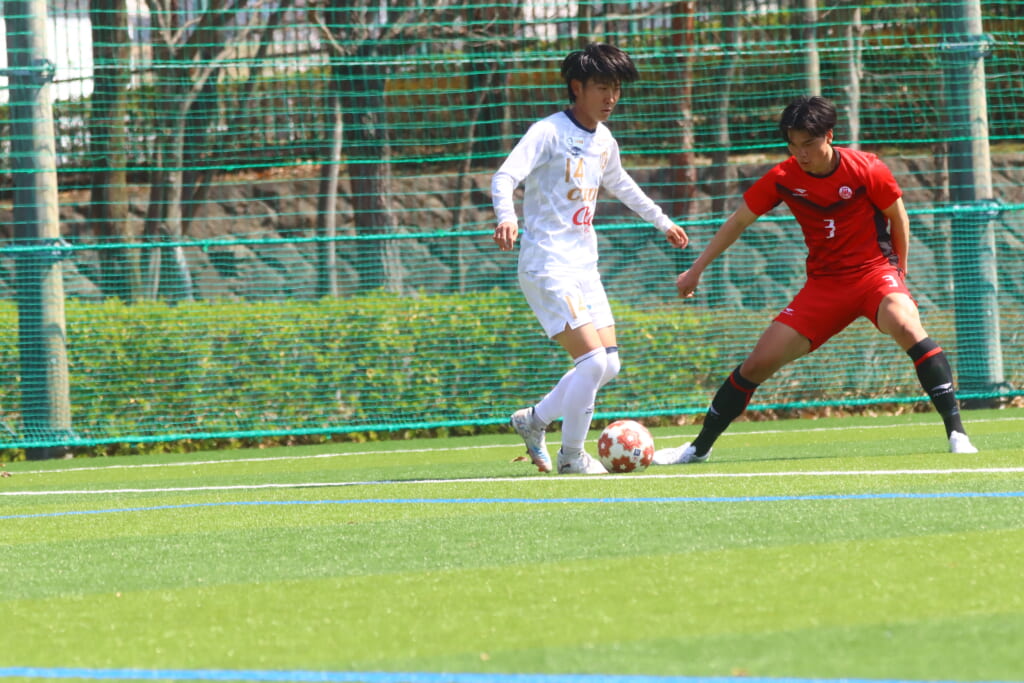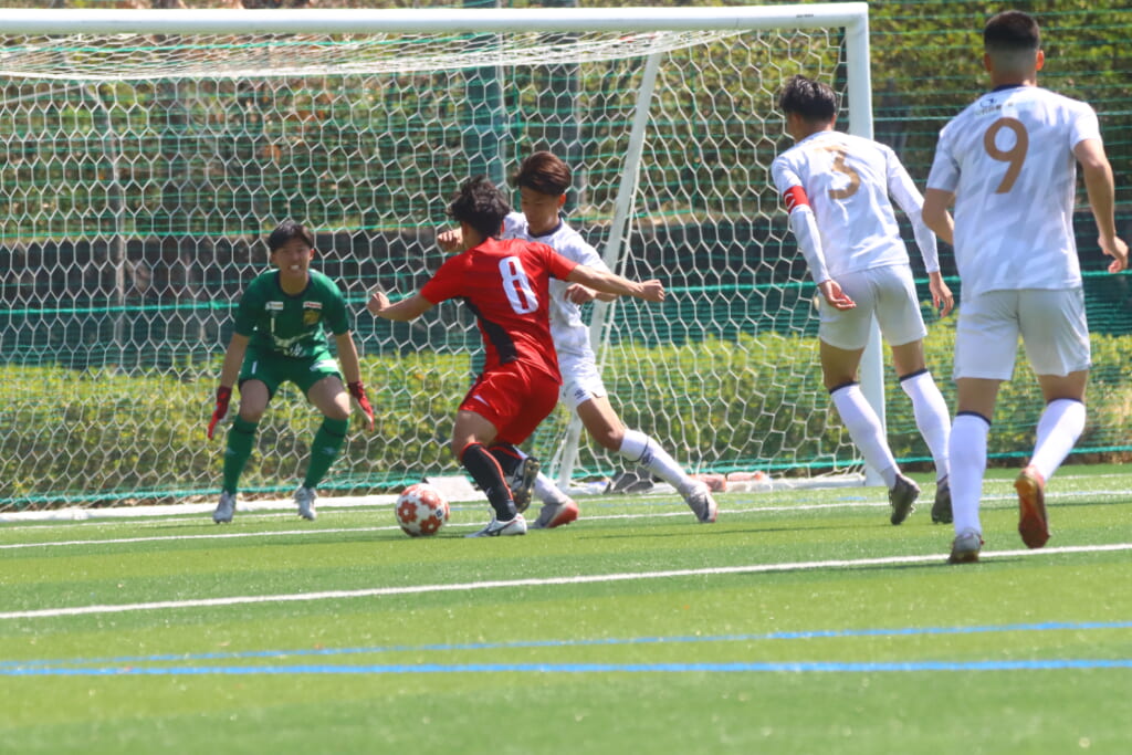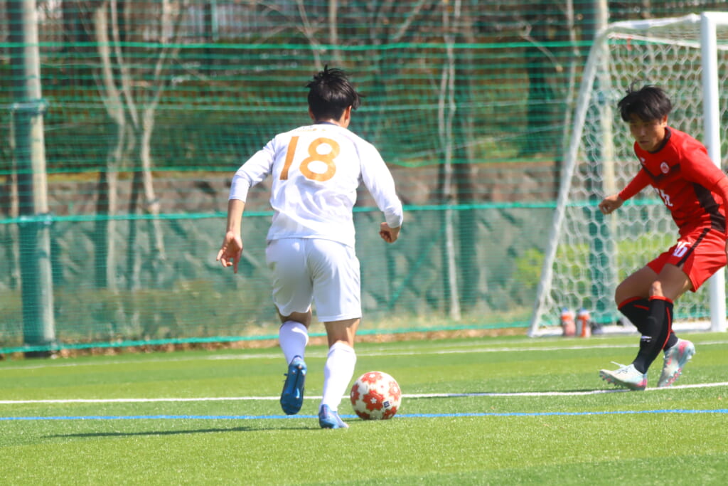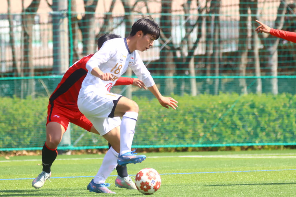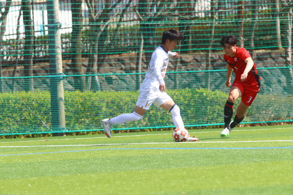 オフサイドを取られたものの、そこから日本大の陣内でプレーする時間をつくっていくと、43分には、右サイドで牧嶋、古川、長田がかかわって動かしていき、長田のパスに尾川がエリア右へ。ここは日本大の対応に遭い、シュートを打つことはできませんでしたが、しっかりつなぎながら、ゴール前での時間をつくっていきます。
