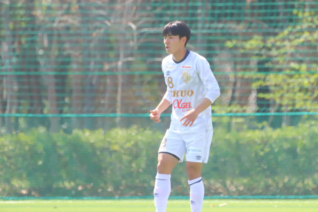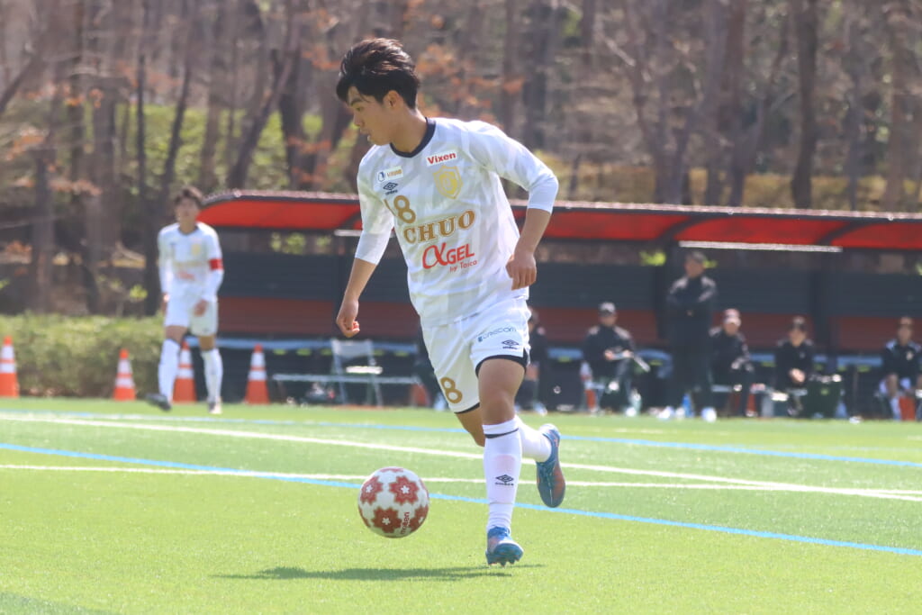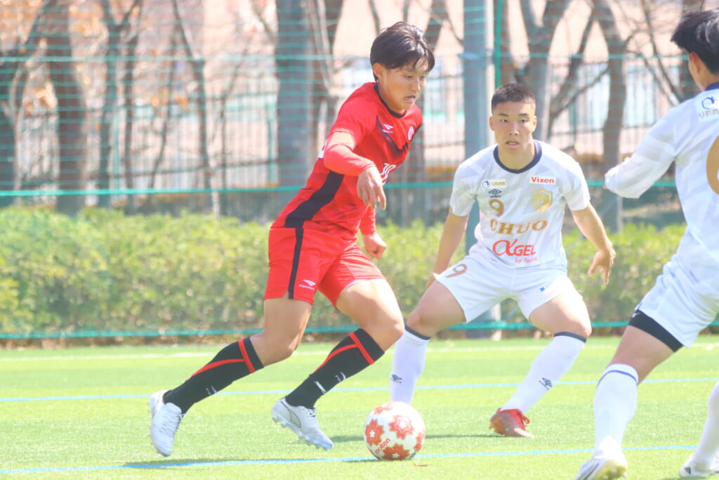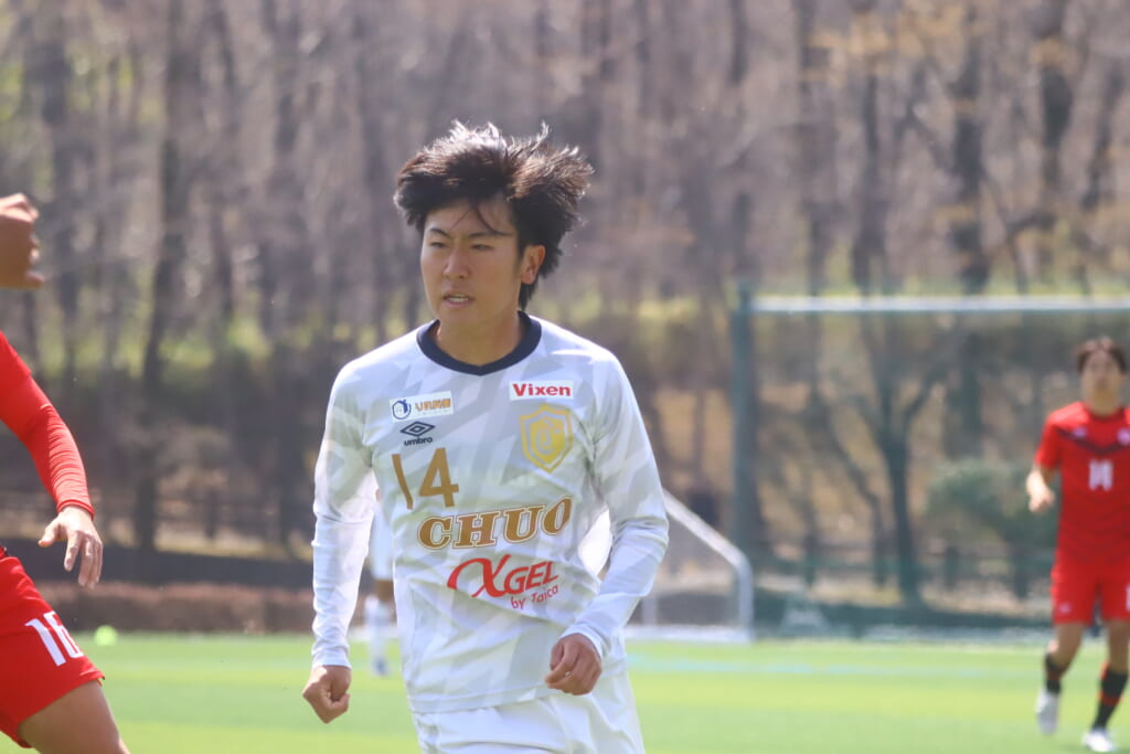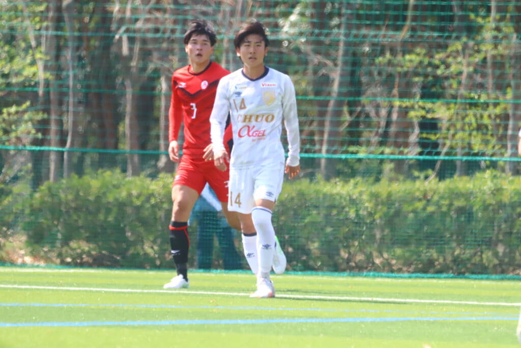 左サイドで岡野一がカット。北浜とのパス交換から高い位置への動き出しを見せていく中央大。
