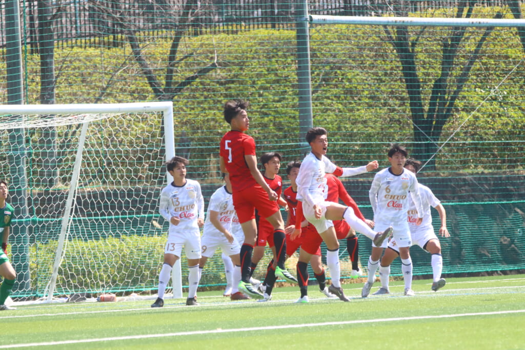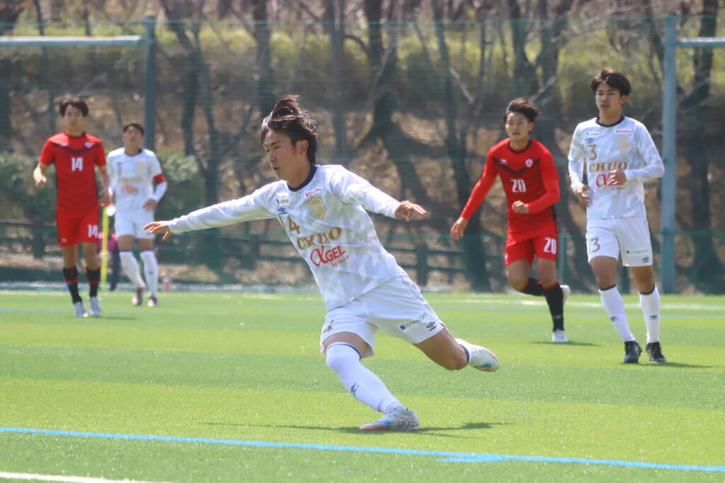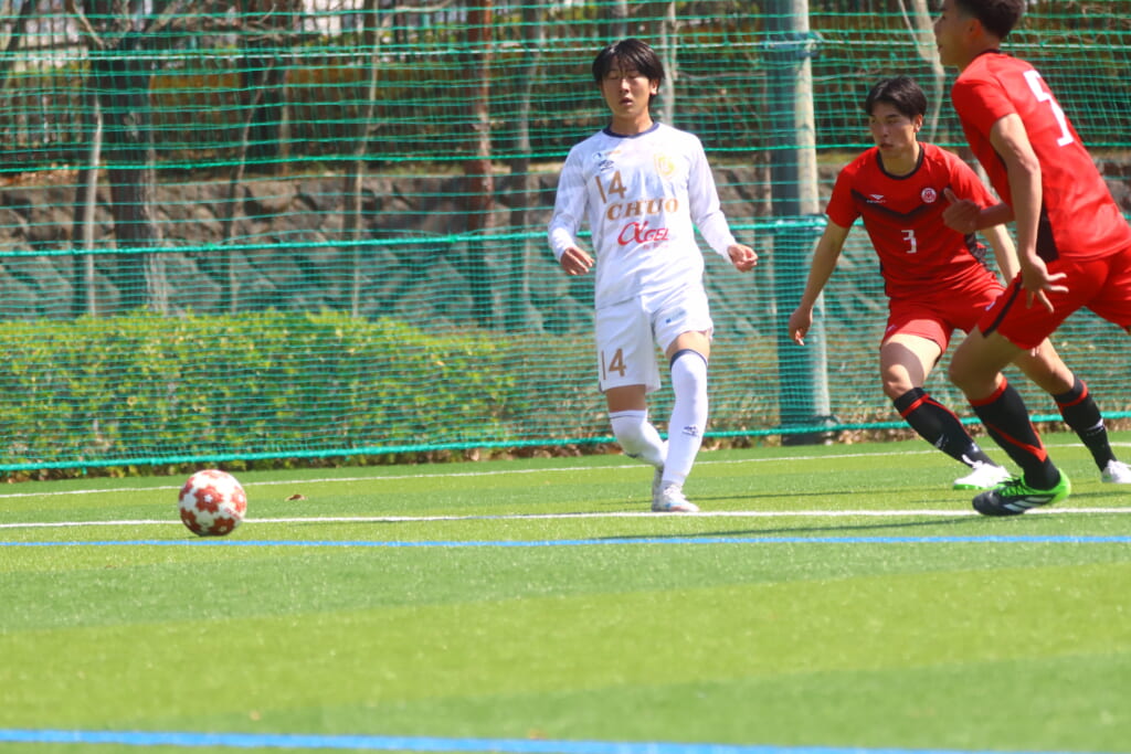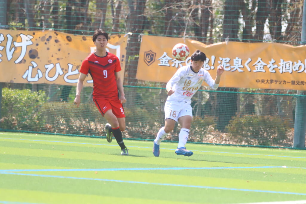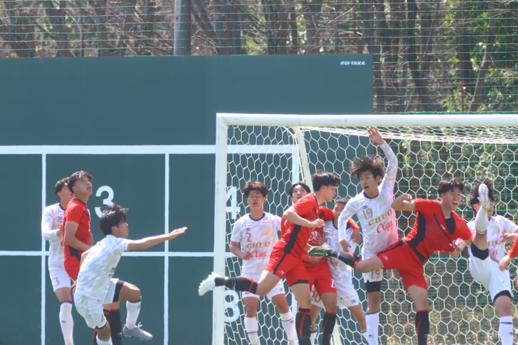 右コーナーキックを得た中央大は、鷹取が左足で入れると、最後はセカンドボールを拾い、エリア外左で尾川がミドルシュート。