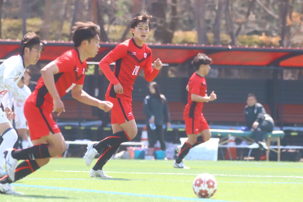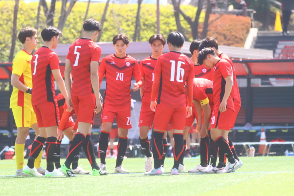 日本大の先発は、GK1ドゥーリー大河、最終ラインは右から5白濵聡二郎、3齋藤航汰、4山内恭輔、ボランチは20矢越幹都、10野澤勇飛、右のウイングバックに16阿部水帆、左のウイングバックに7石川晴大、2シャドーに8関日向多、キャプテンの17平尾勇人、前線には14石橋鞘。
