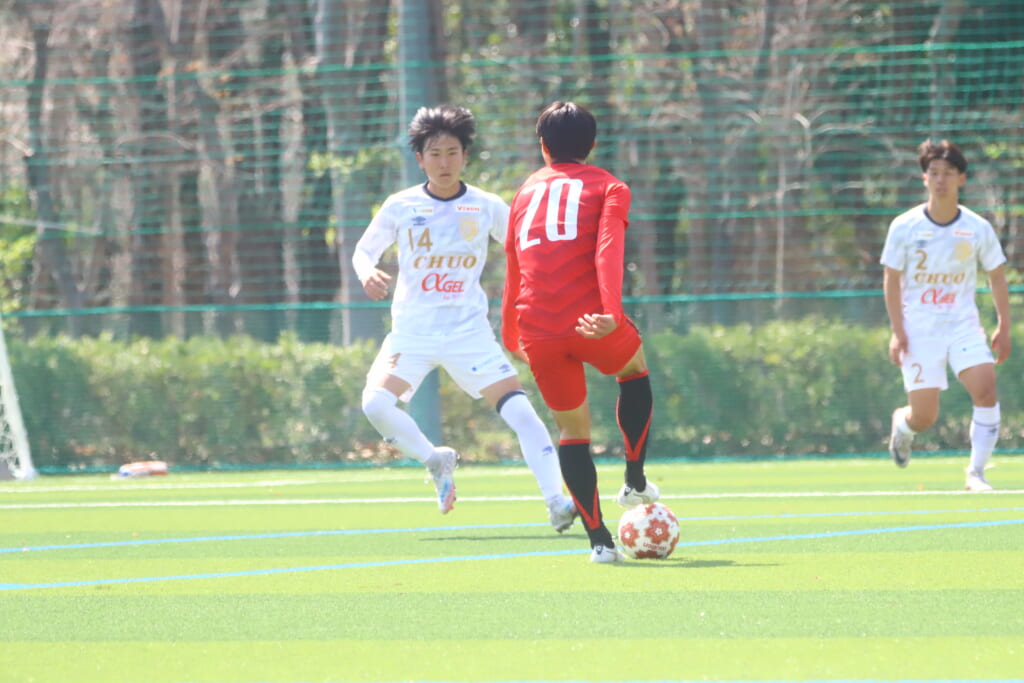 なおも後ろから組み立てていこうとする中央大に対し、前からプレスをかけていくと、15分には、エリア正面で関がカット。
