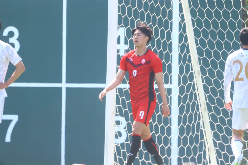 再び左コーナーキックを得た日本大。矢越が遠いサイドに入れると、セカンドボールを拾い、右サイドからのフィードに、齋藤が正面で合わせますが、左に。