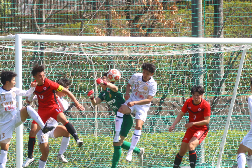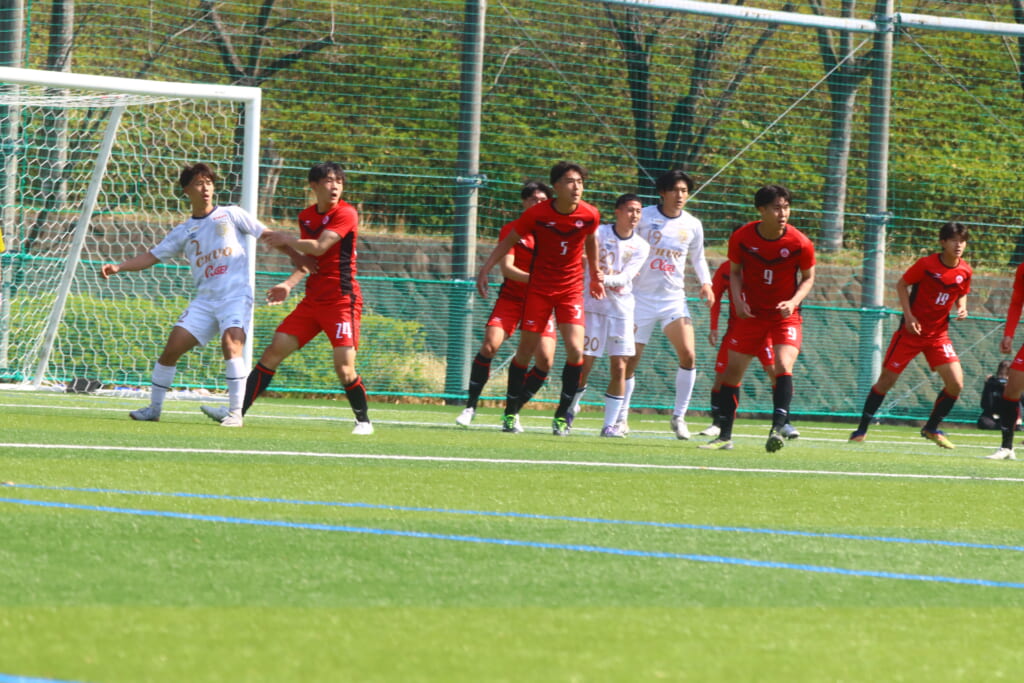 右コーナーキックを得た日本大。キッカー、山内が左足で入れると最後は正面で石橋がシュート。右にそれ、枠をとらえることはできませんでしたが、またもチャンスをつくっていきます。