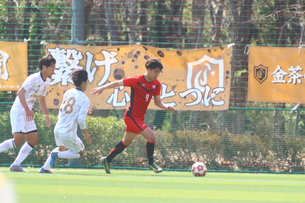 ラインを高め、白濵、齋藤もセンターライン付近まで上がり、矢越や野澤がうまく間で受けながら、ボールをつないでいくと、9分には野澤のパスに石橋がエリア右へ。