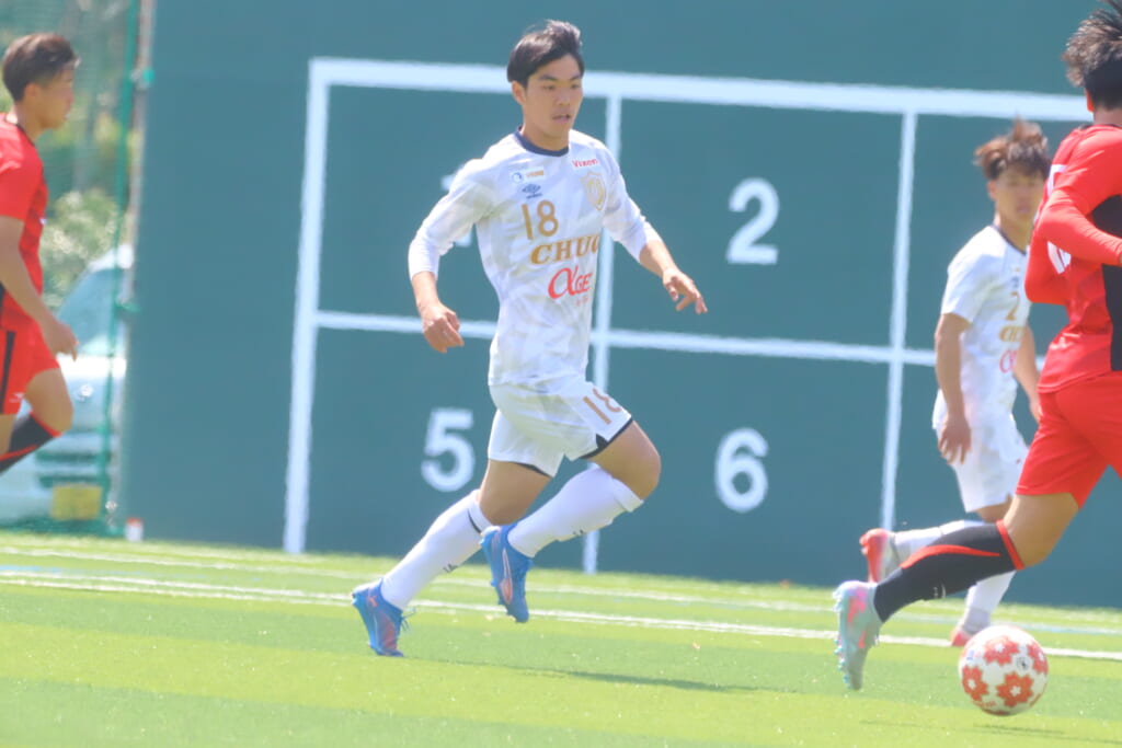 1回戦をシードされ、愛知大との2回戦に臨んだ中京大。齊名は46分から出場。大学のトップチームの選手として、初めての公式戦に。