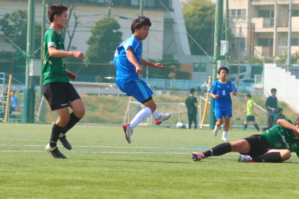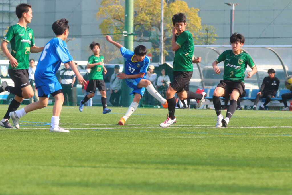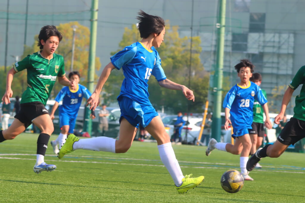 15分には、渡部のパスを、岩田陸叶がうまく間で受け、荻原、岩田陸叶、永田がエリア外正面でかかわって動かしていくと、最後はエリア外正面で我妻がミドルシュート。