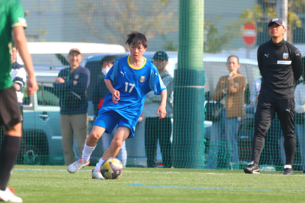 立ち上がり、岩田陸叶や川埜が高い位置からプレス。間で細川がカット。相手陣内でプレーする時間をつくっていくフロンターレ等々力。