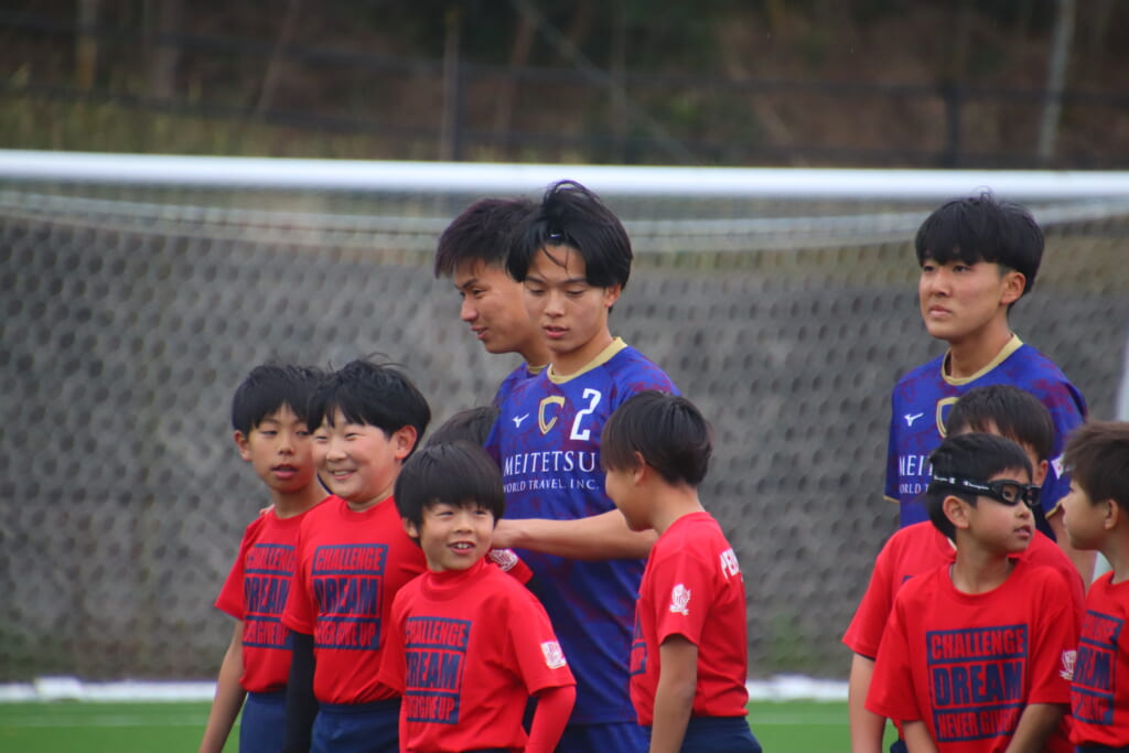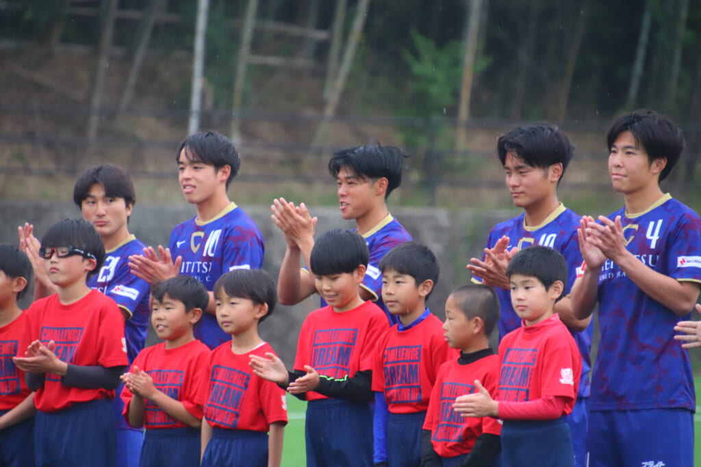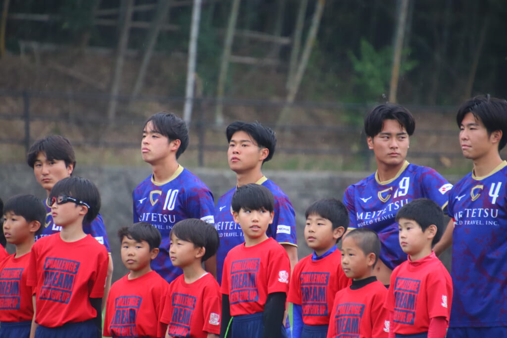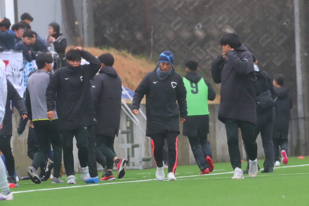 雨の中京大豊田キャンパスサッカー場。それでも、スタンドには多くの両チームの選手の家族、さらに試合前に行われたサッカー教室に参加した小学生たちの姿も。