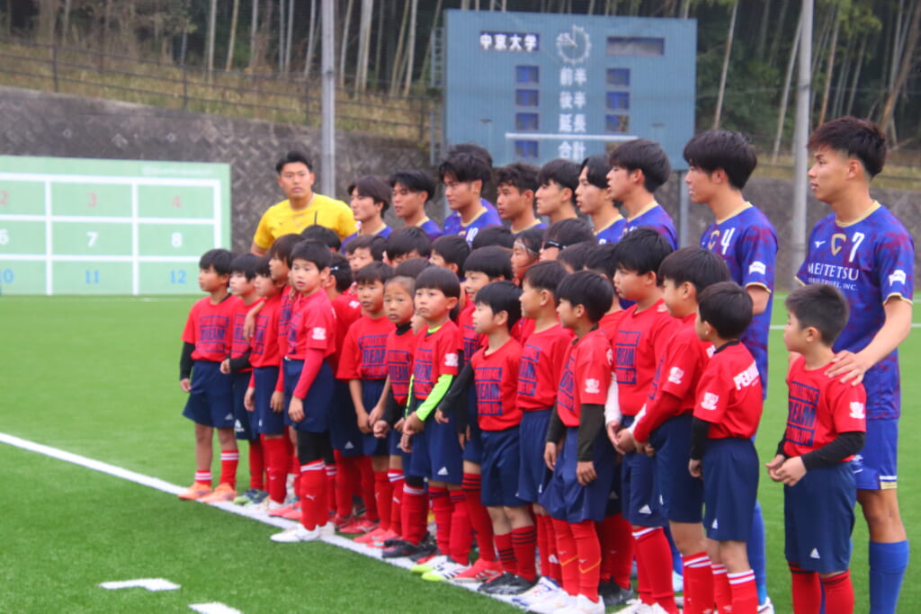 中京大のメンバー外の選手らが幕を出し、チャントを歌う。両チームの選手たちが、エスコートキッズとともに入場する。これから始まるシーズンへの期待が高まる素晴らしい雰囲気の中、キックオフの時を迎えました。