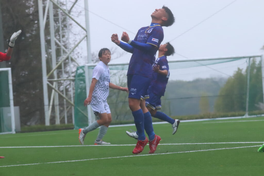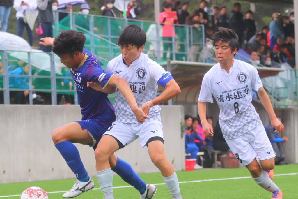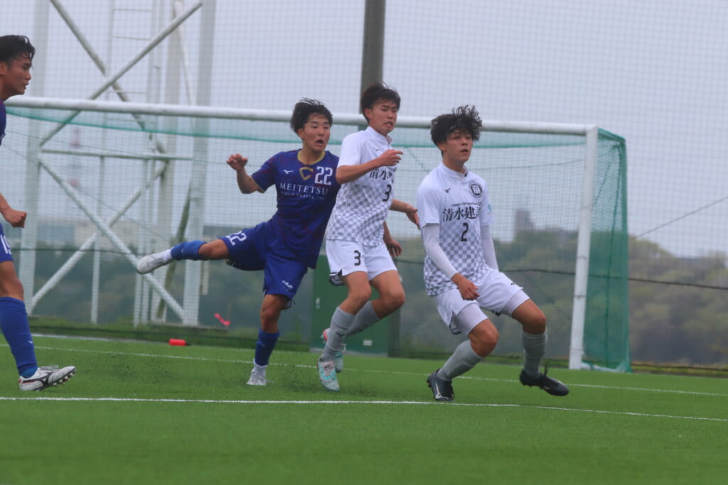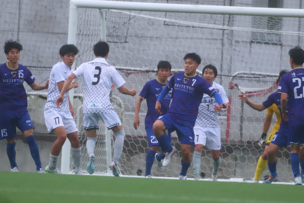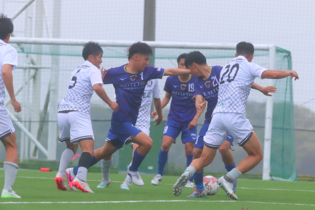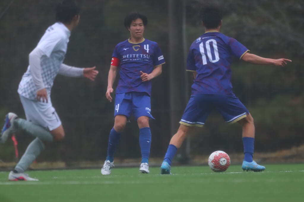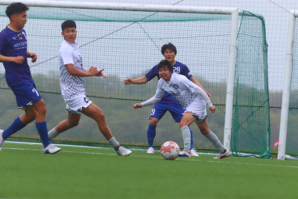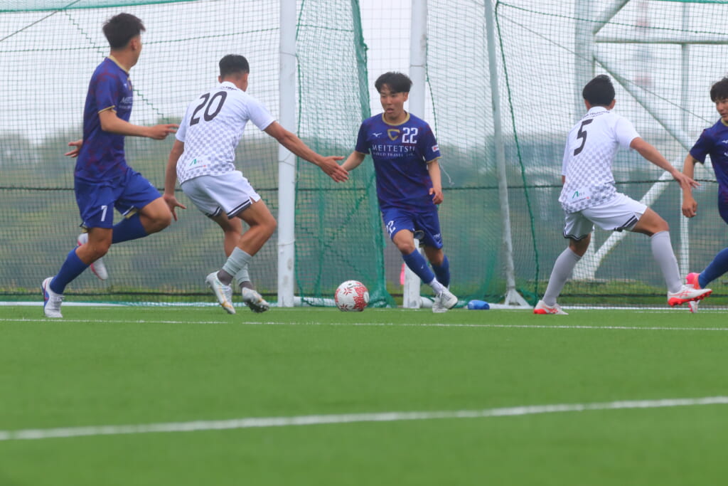 ラインを高め、松本や神谷らがかかわってテンポよくパスをつなぎ、中京大の陣内でプレーする時間をつくり、2分には左サイドから折り返しますが、齊名が正面をカバーしていきます。