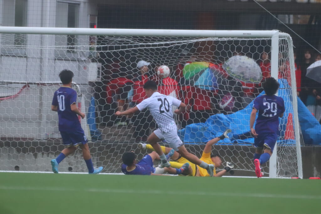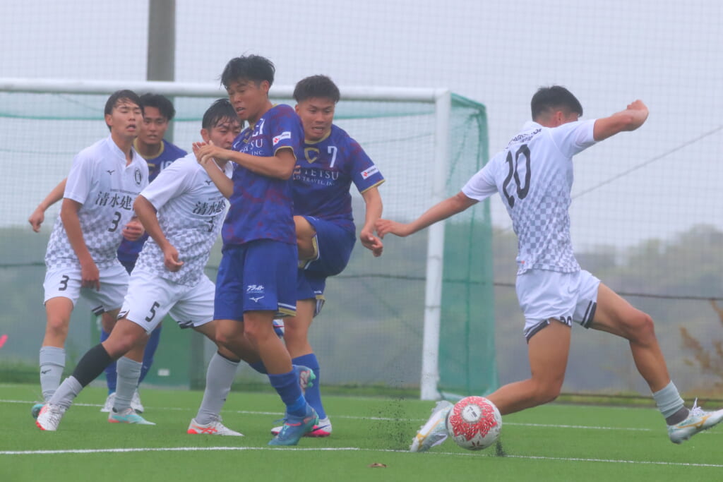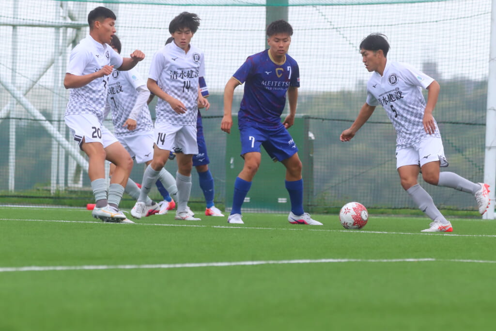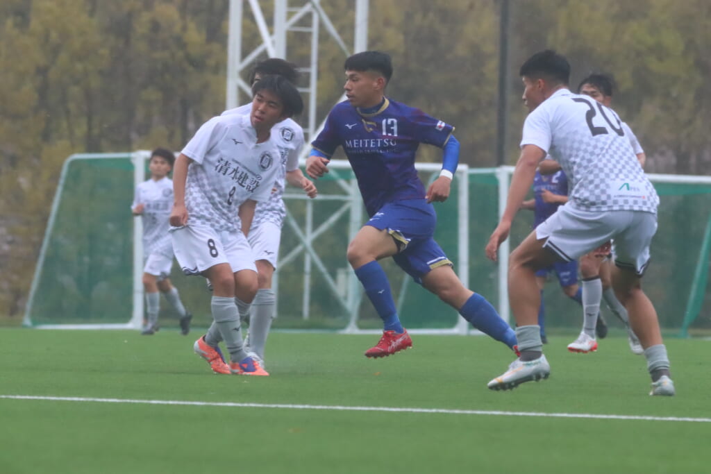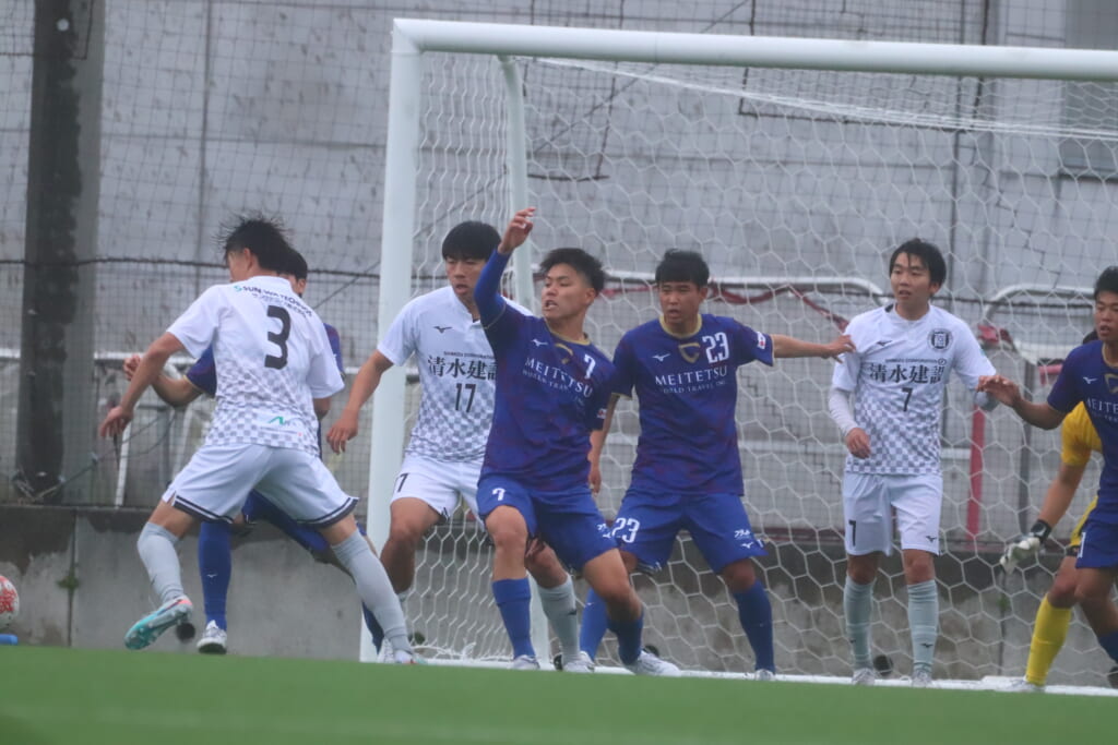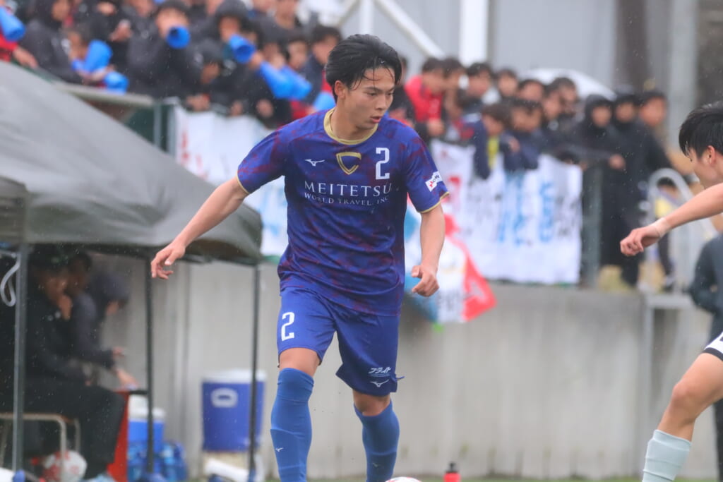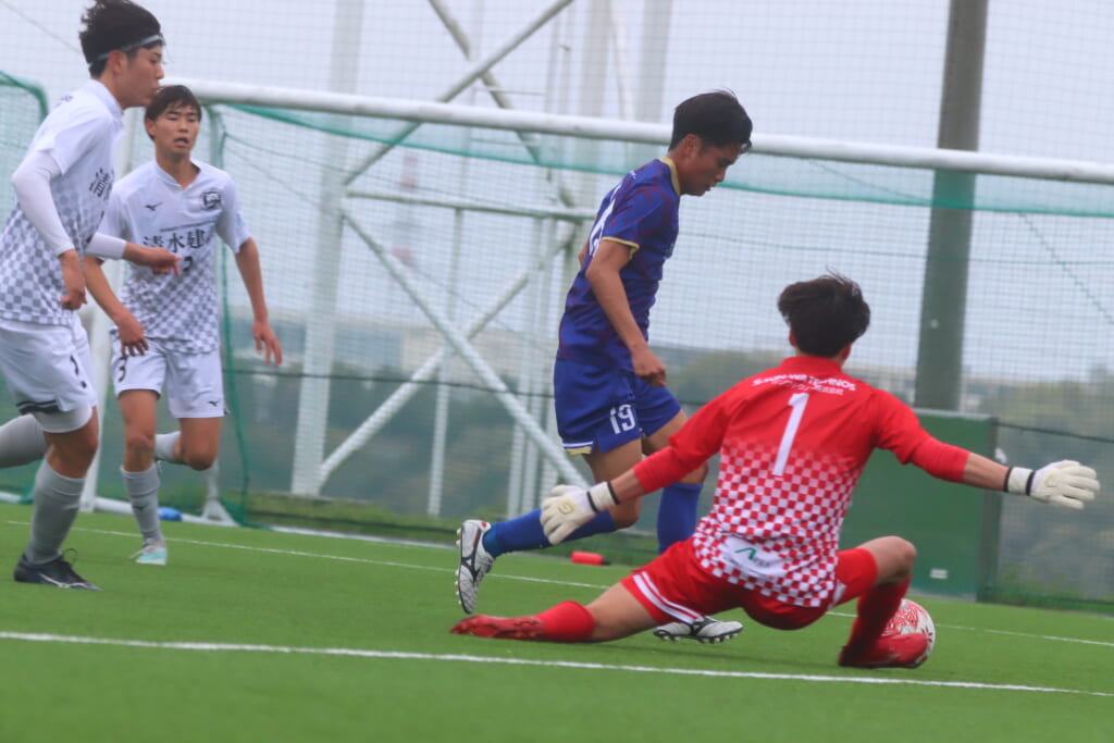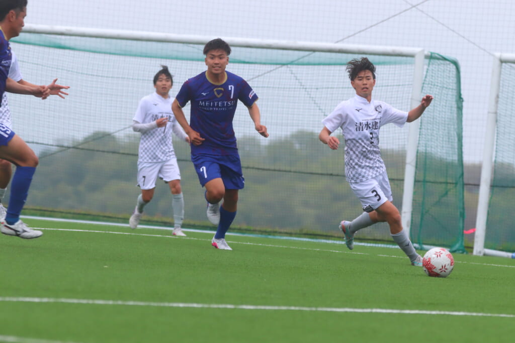 ラインを高め、松本や神谷らがかかわってテンポよくパスをつなぎ、中京大の陣内でプレーする時間をつくり、2分には左サイドから折り返しますが、齊名が正面をカバーしていきます。