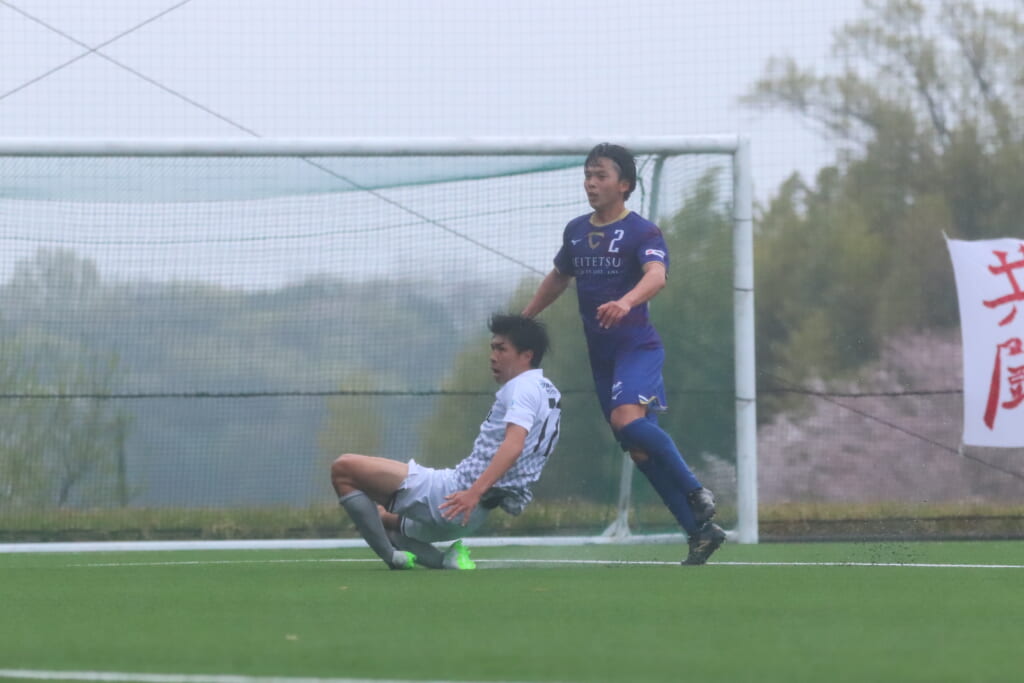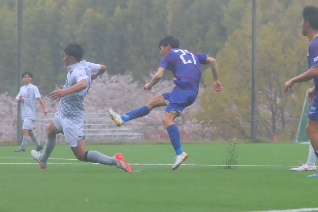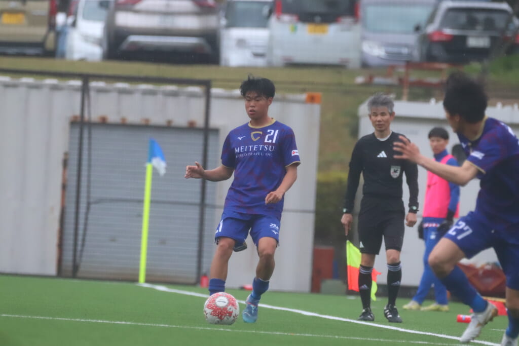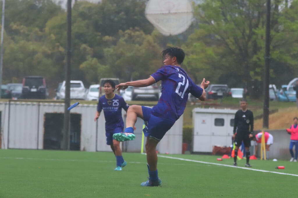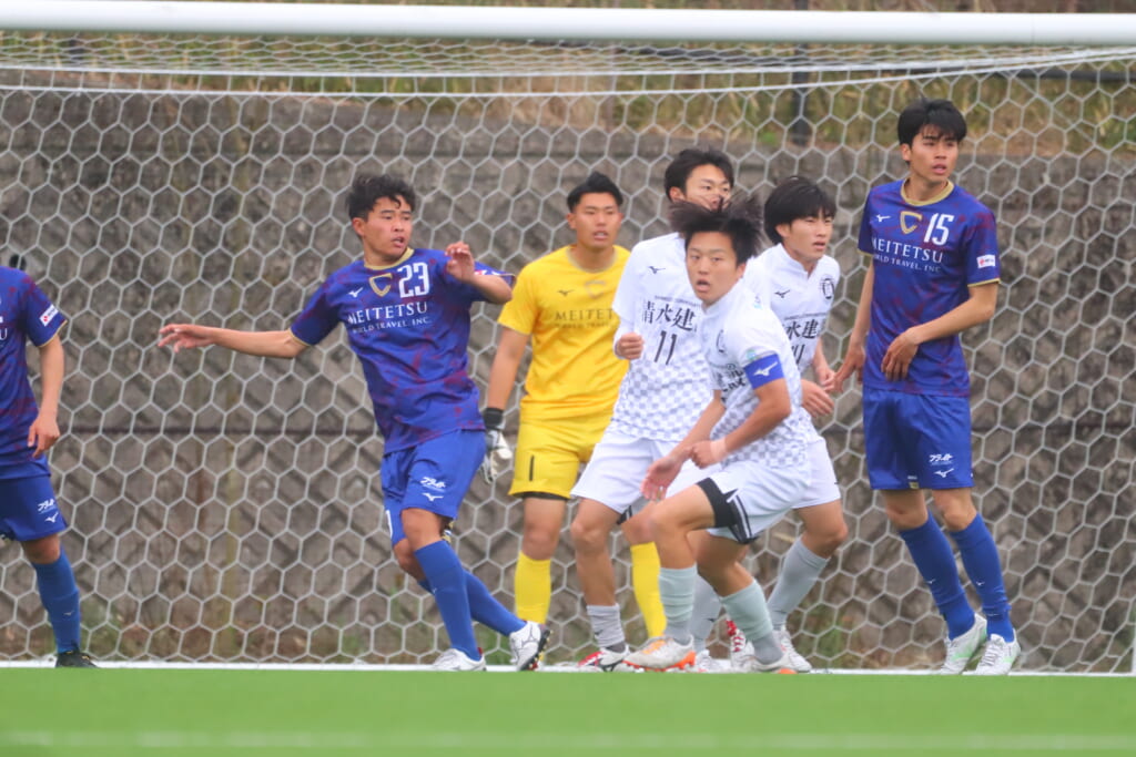 21分には、中部大、松本が左サイドから中央へ持ち込み、左サイドへ展開。青山が折り返すも、エリア内を齊名がカバー。