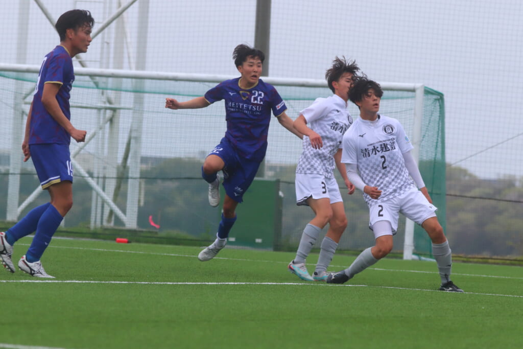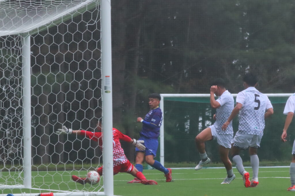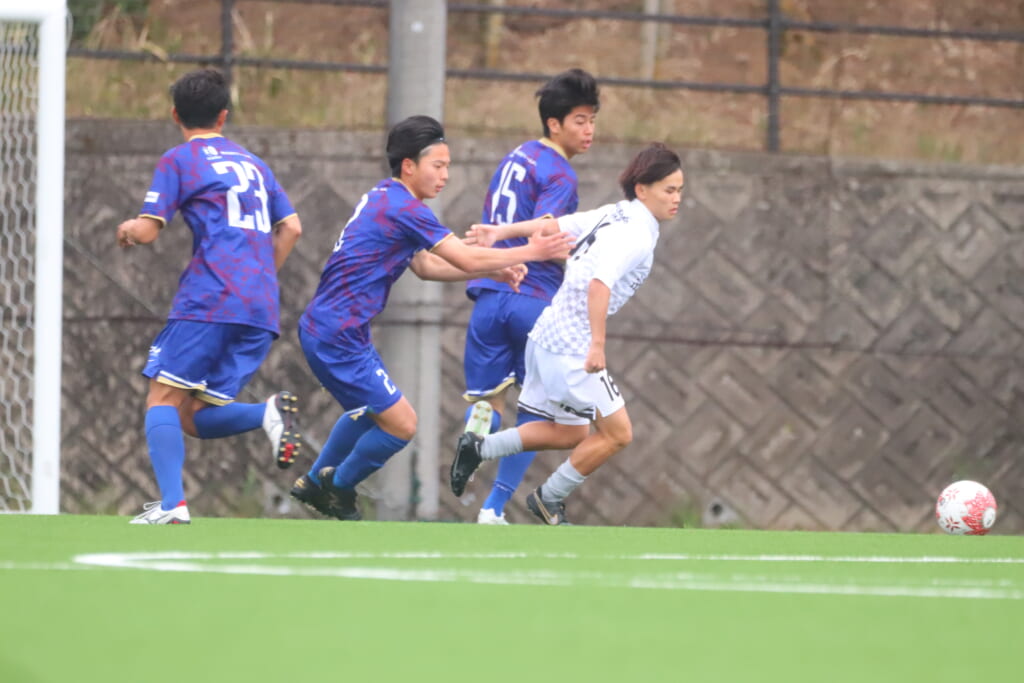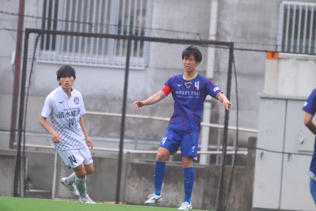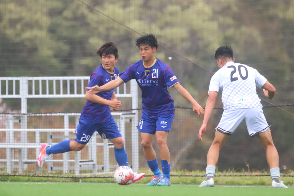 21分には、中部大、松本が左サイドから中央へ持ち込み、左サイドへ展開。青山が折り返すも、エリア内を齊名がカバー。