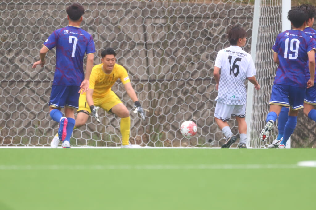 齊名から野中と左サイド、高い位置へつながり、野中のパスに篠田がエリア正面左へ。篠田がGKの山田を引きつけ、シュート。サイドネットをたたき、ゴールとはなりませんでしたが、うまくかかわりながら、中京大がゴールに迫る場面をつくっていきます。