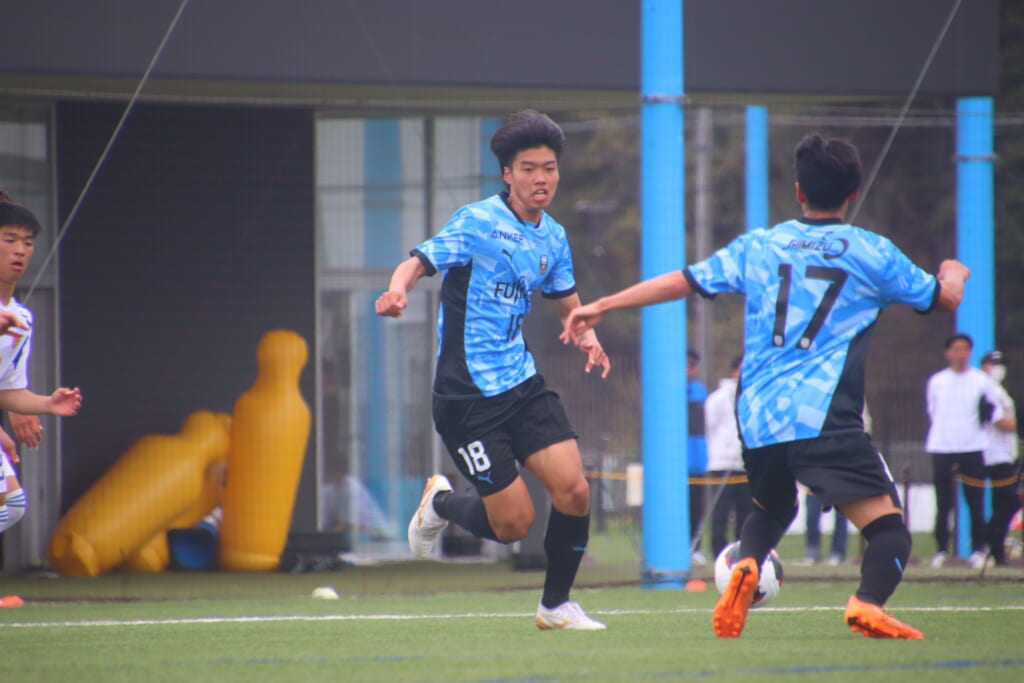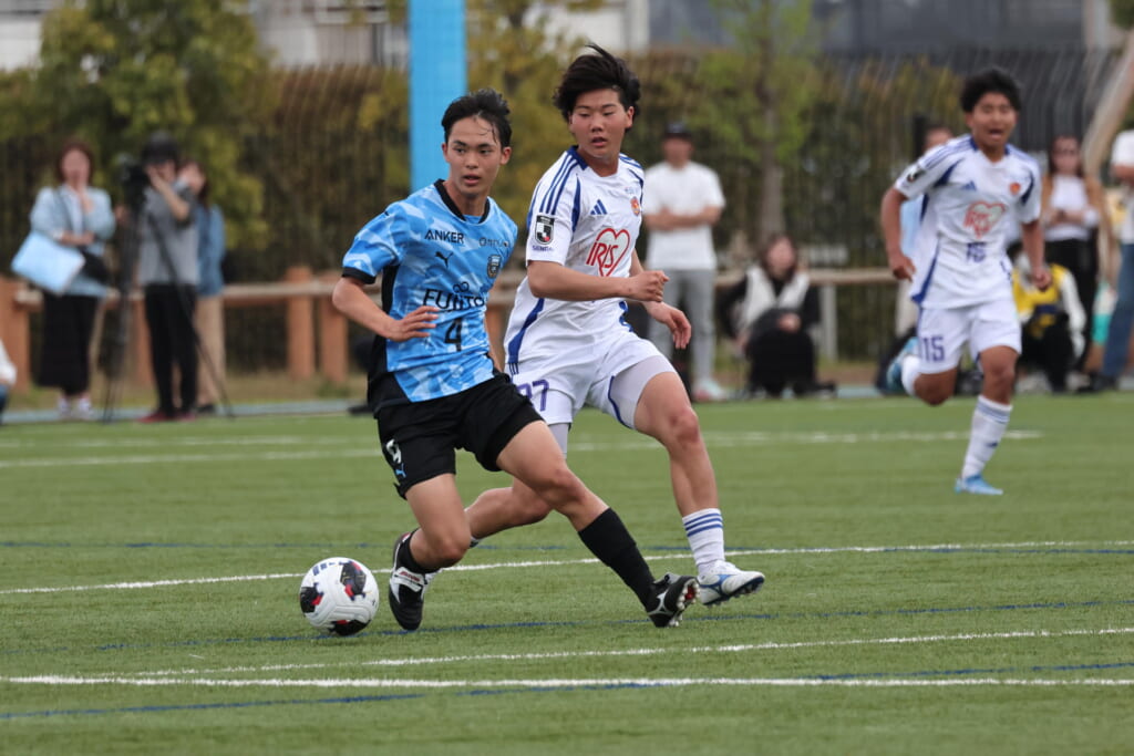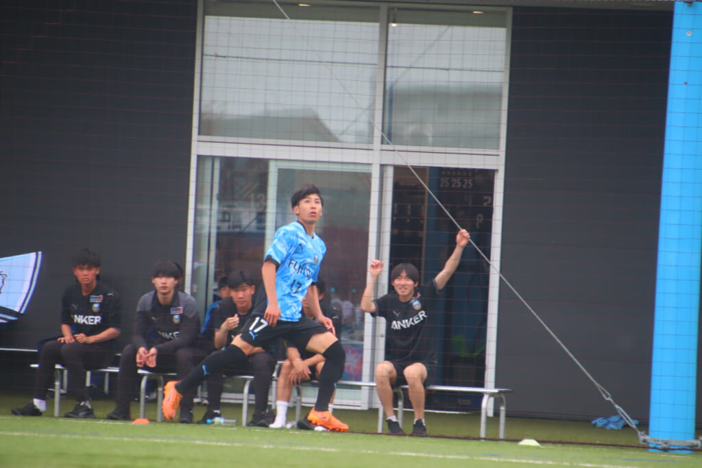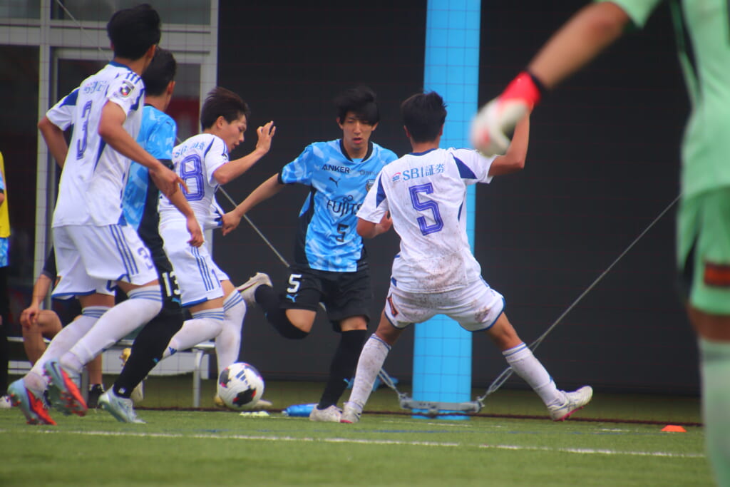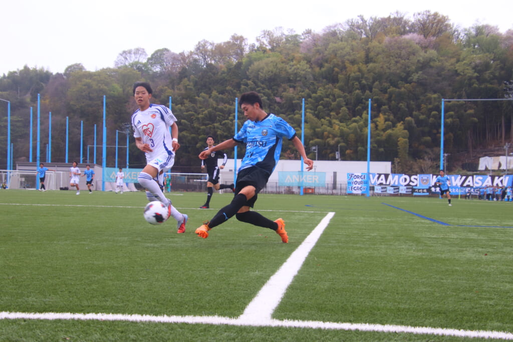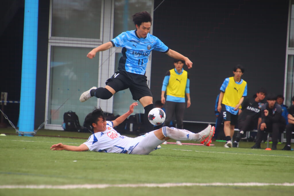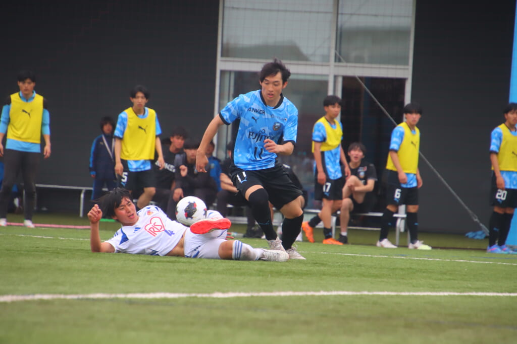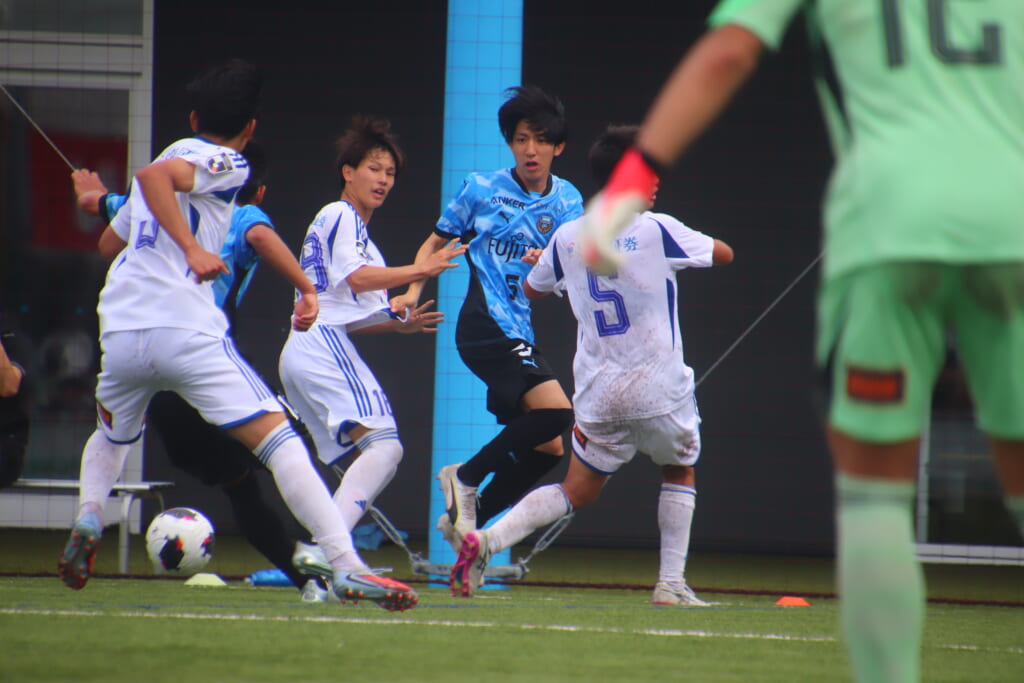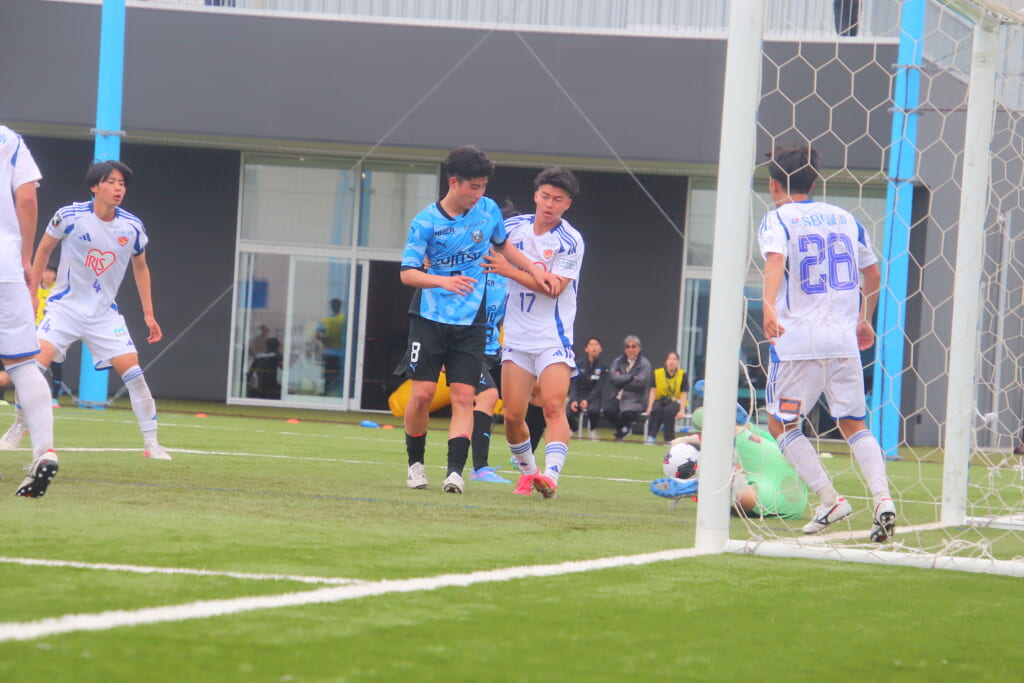 すると2分には、フロンターレ、今廣から左サイド、山川へ。山川から受けた木村が少し前に持ち出し、いったん中央に預け、高い位置へ持ち込み、クロスを上げるとボールはクロスバーを直撃。こぼれ球を拾った木下がエリア内、シュート。しかし、鑓水が体を張り、ブロック。