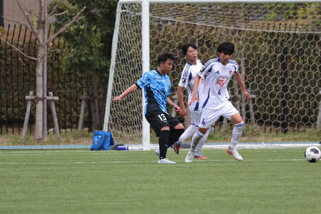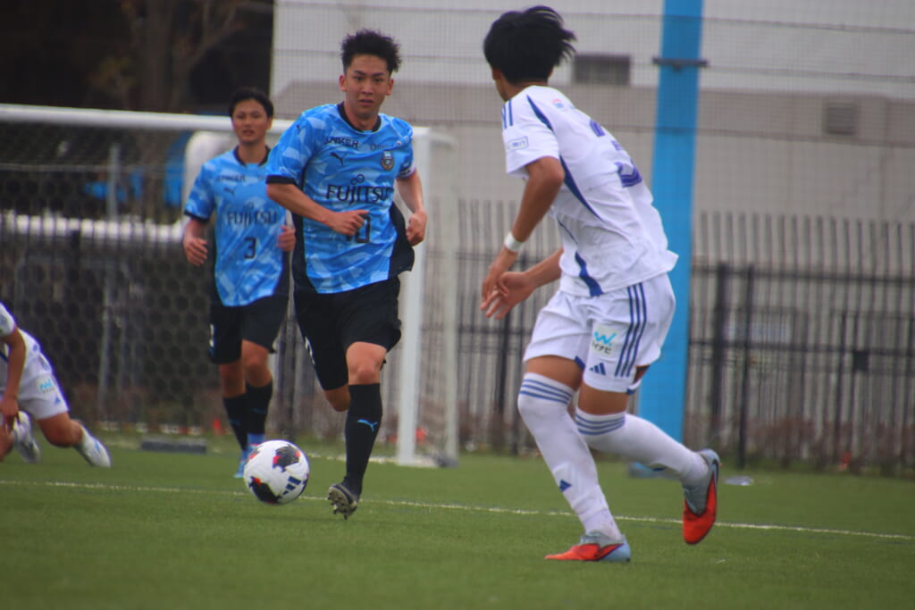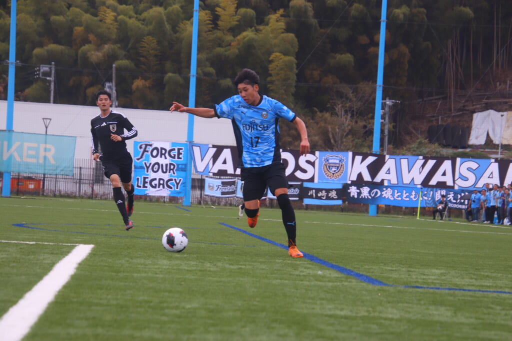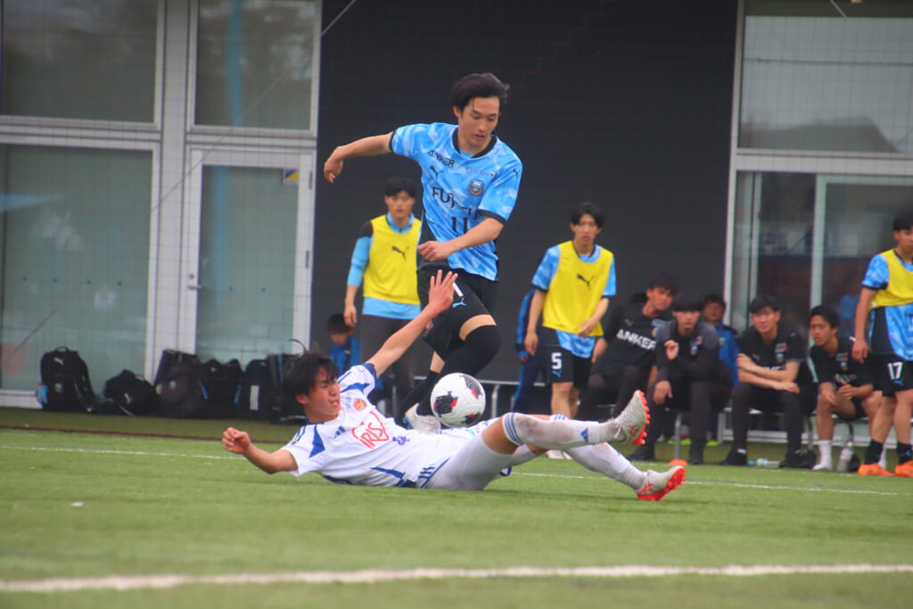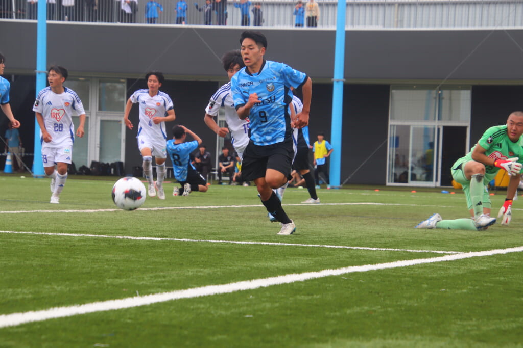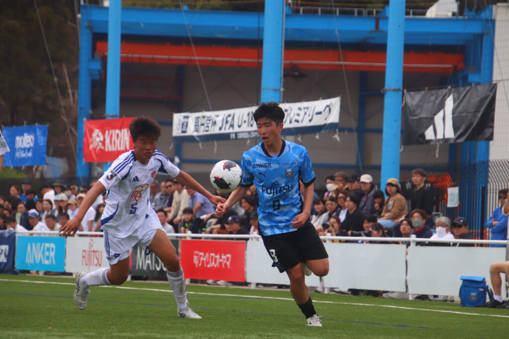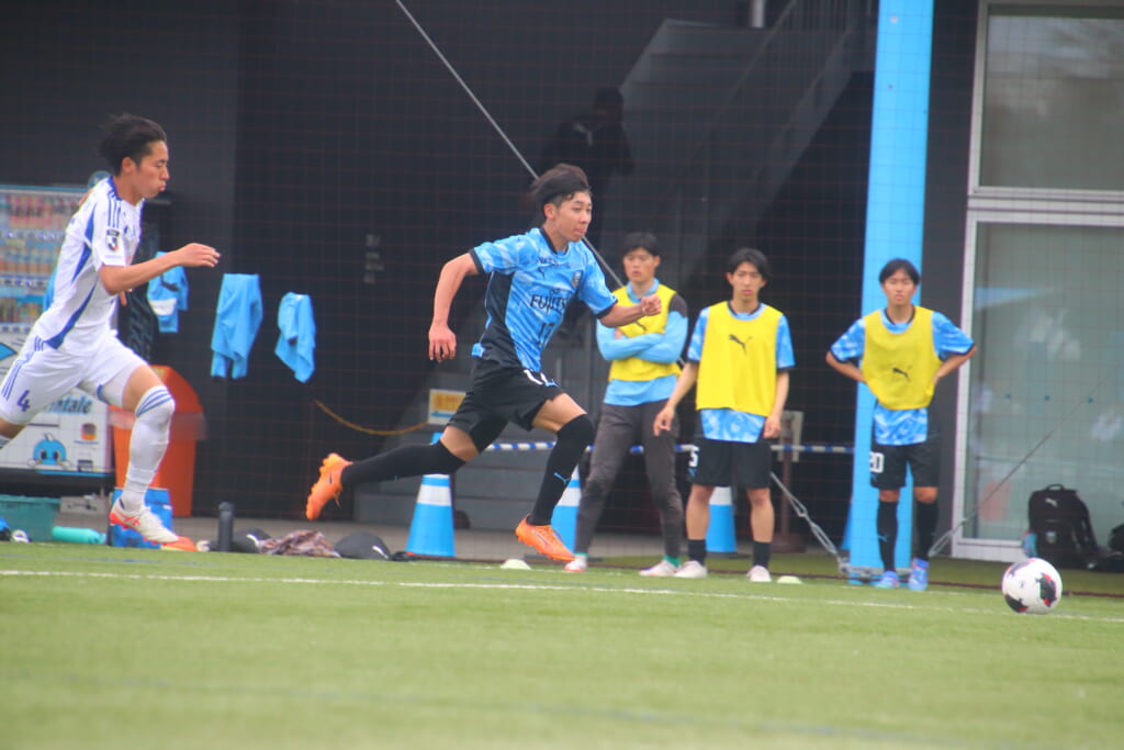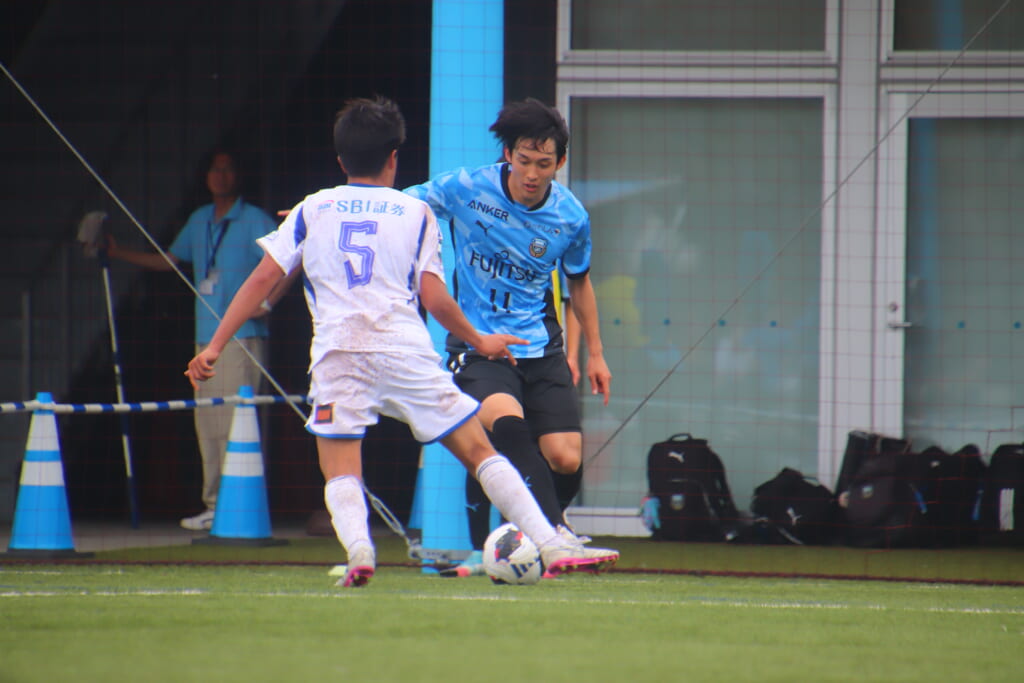 すると2分には、フロンターレ、今廣から左サイド、山川へ。山川から受けた木村が少し前に持ち出し、いったん中央に預け、高い位置へ持ち込み、クロスを上げるとボールはクロスバーを直撃。こぼれ球を拾った木下がエリア内、シュート。しかし、鑓水が体を張り、ブロック。
