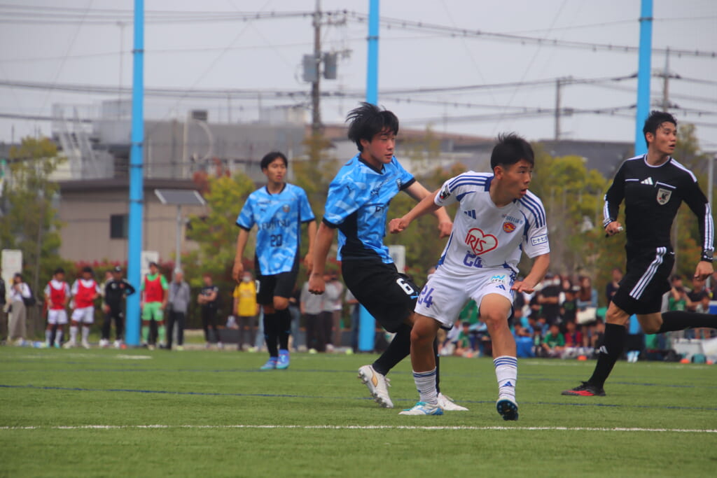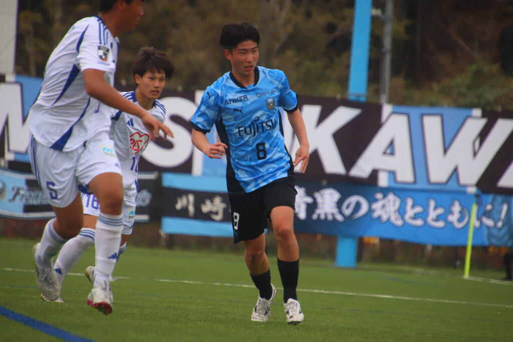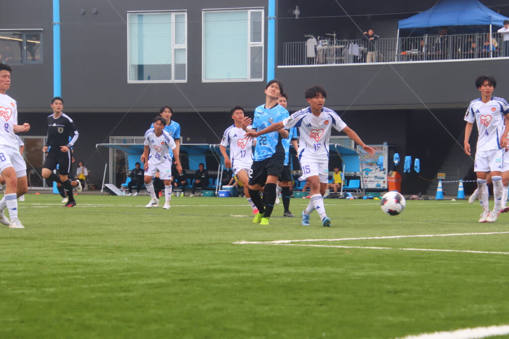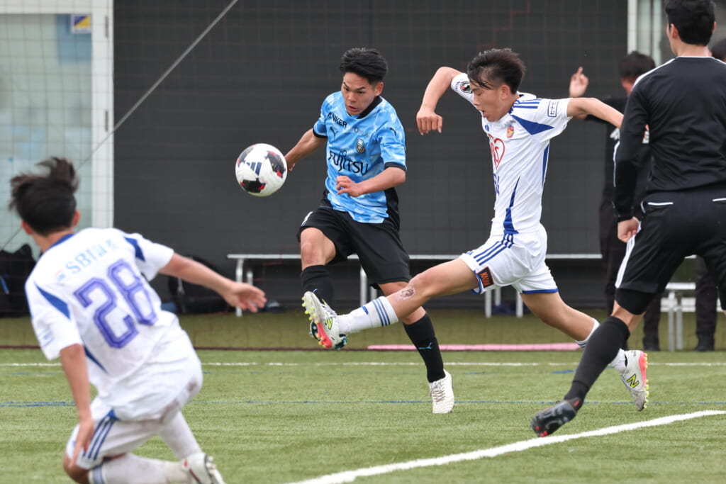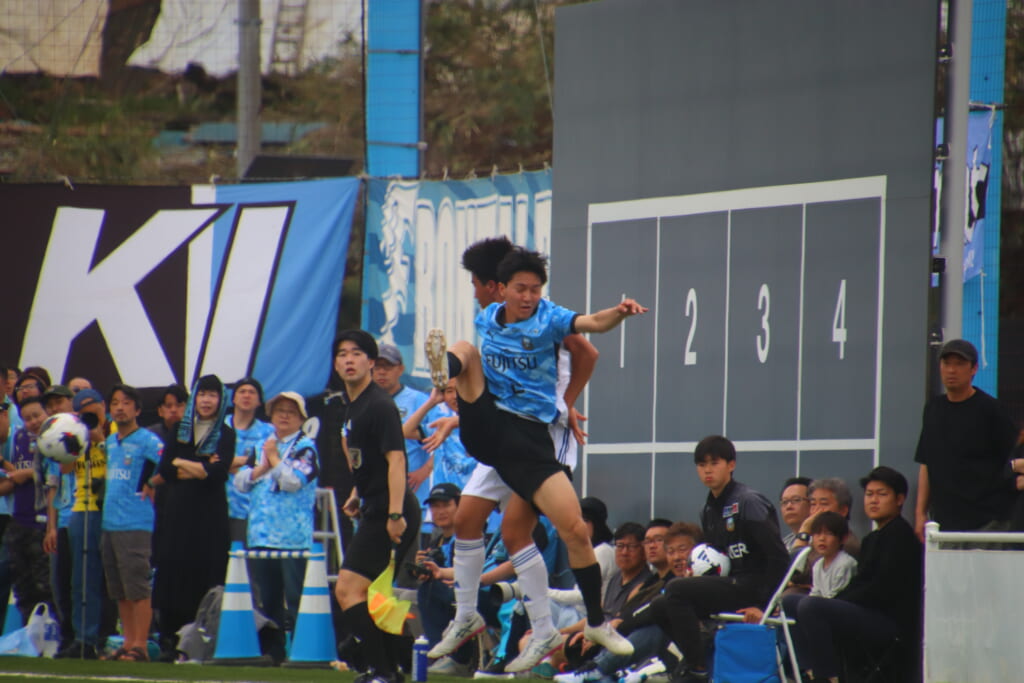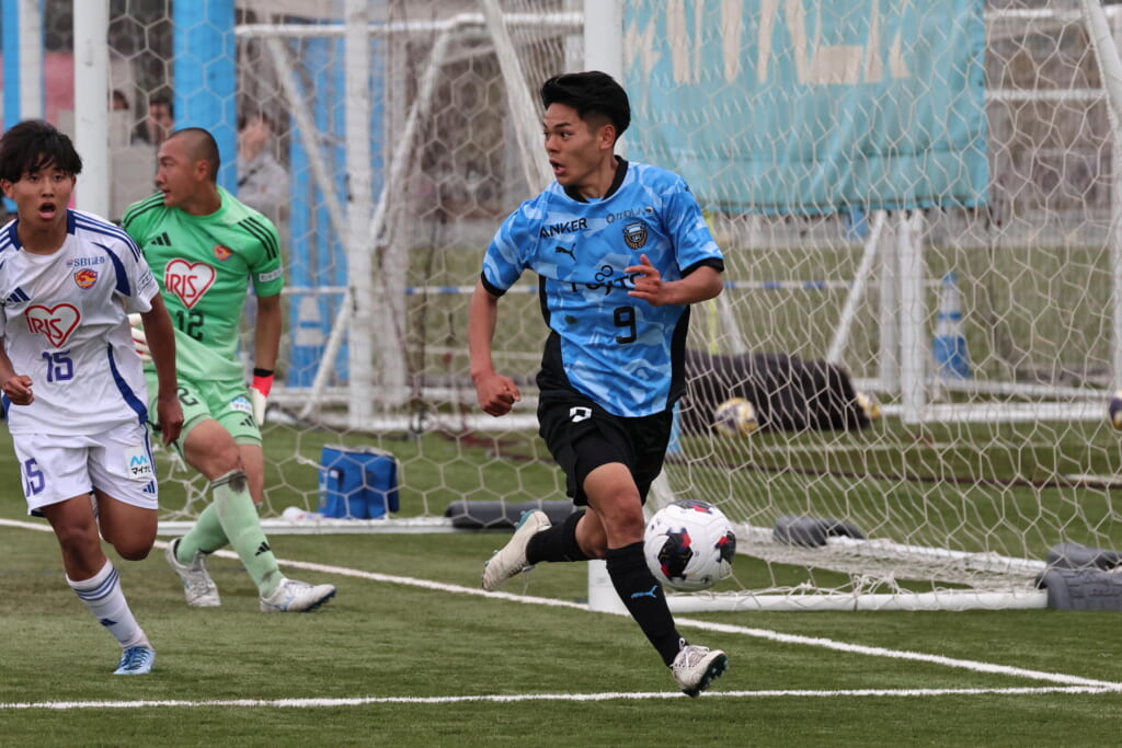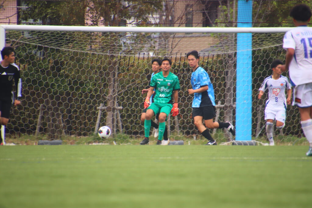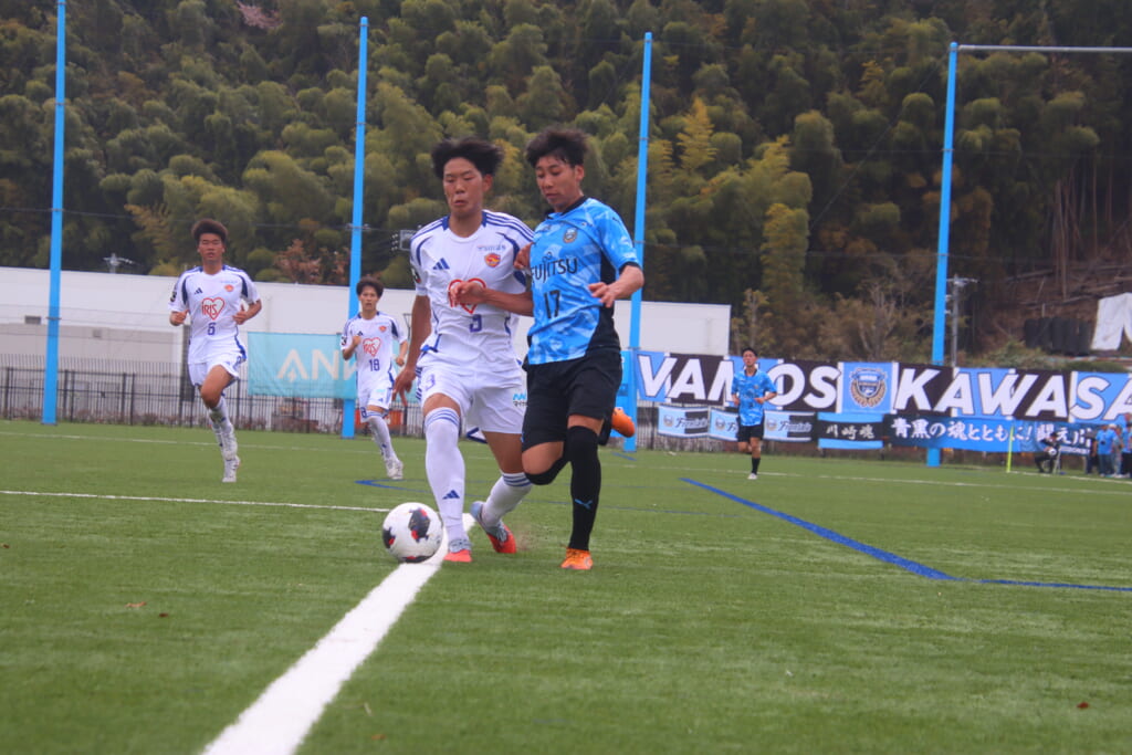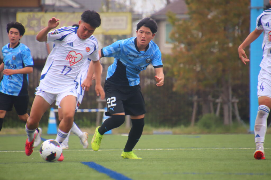 すると2分には、フロンターレ、今廣から左サイド、山川へ。山川から受けた木村が少し前に持ち出し、いったん中央に預け、高い位置へ持ち込み、クロスを上げるとボールはクロスバーを直撃。こぼれ球を拾った木下がエリア内、シュート。しかし、鑓水が体を張り、ブロック。