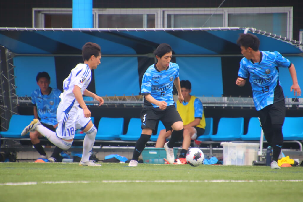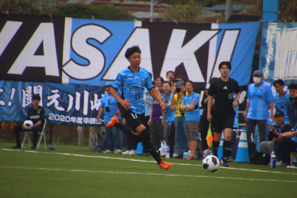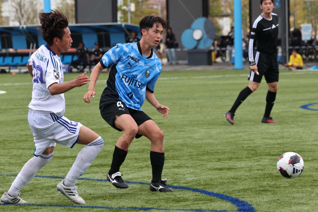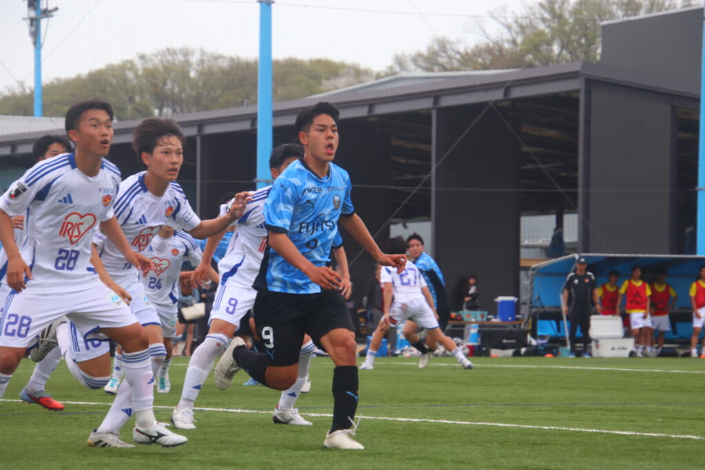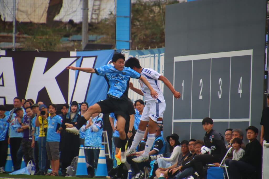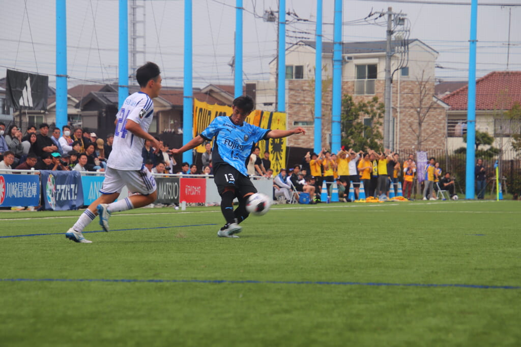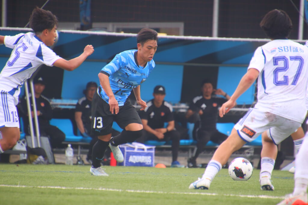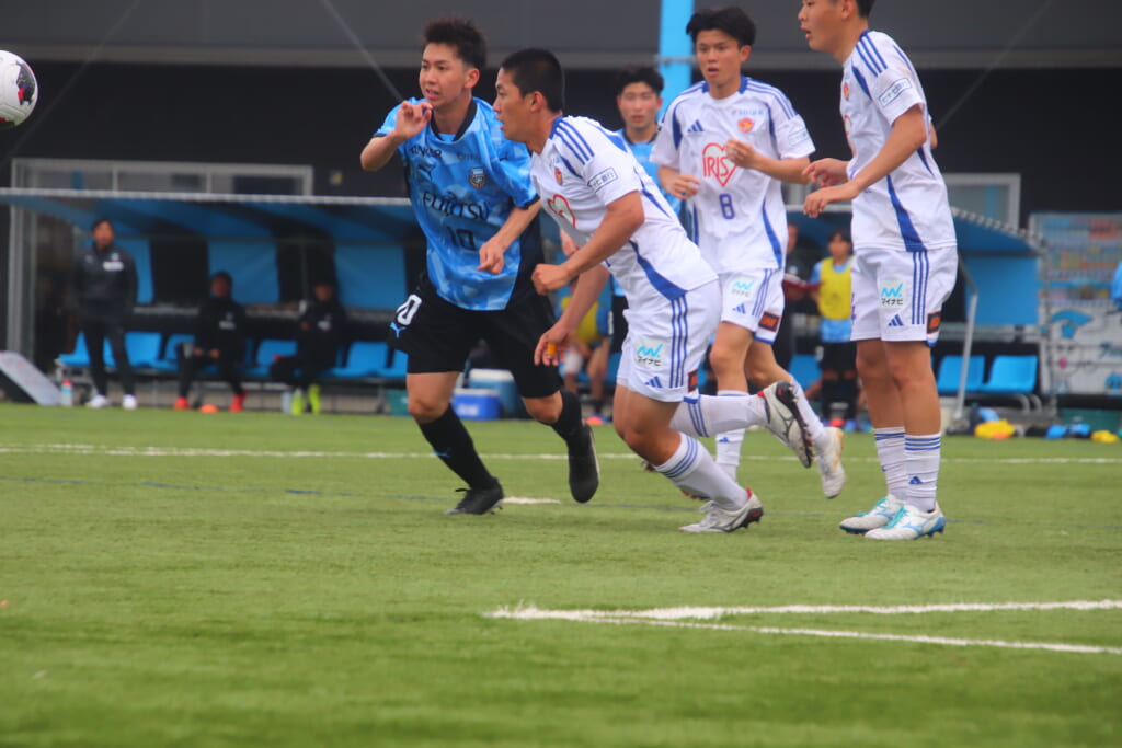 すると2分には、フロンターレ、今廣から左サイド、山川へ。山川から受けた木村が少し前に持ち出し、いったん中央に預け、高い位置へ持ち込み、クロスを上げるとボールはクロスバーを直撃。こぼれ球を拾った木下がエリア内、シュート。しかし、鑓水が体を張り、ブロック。