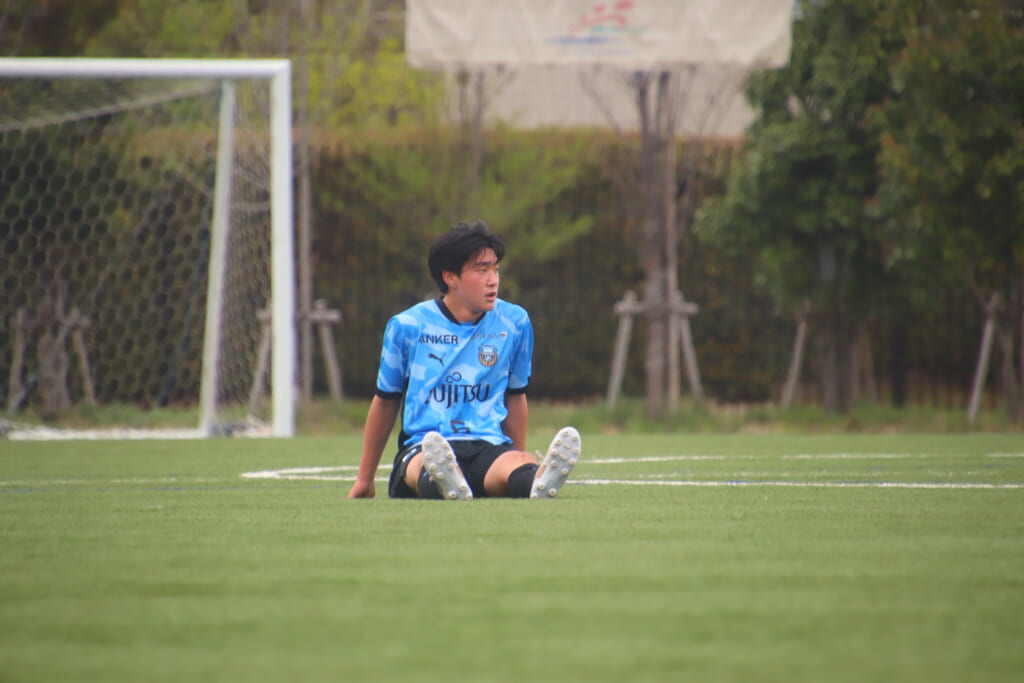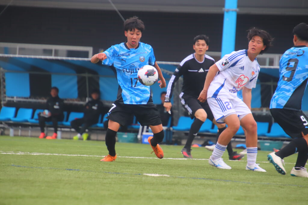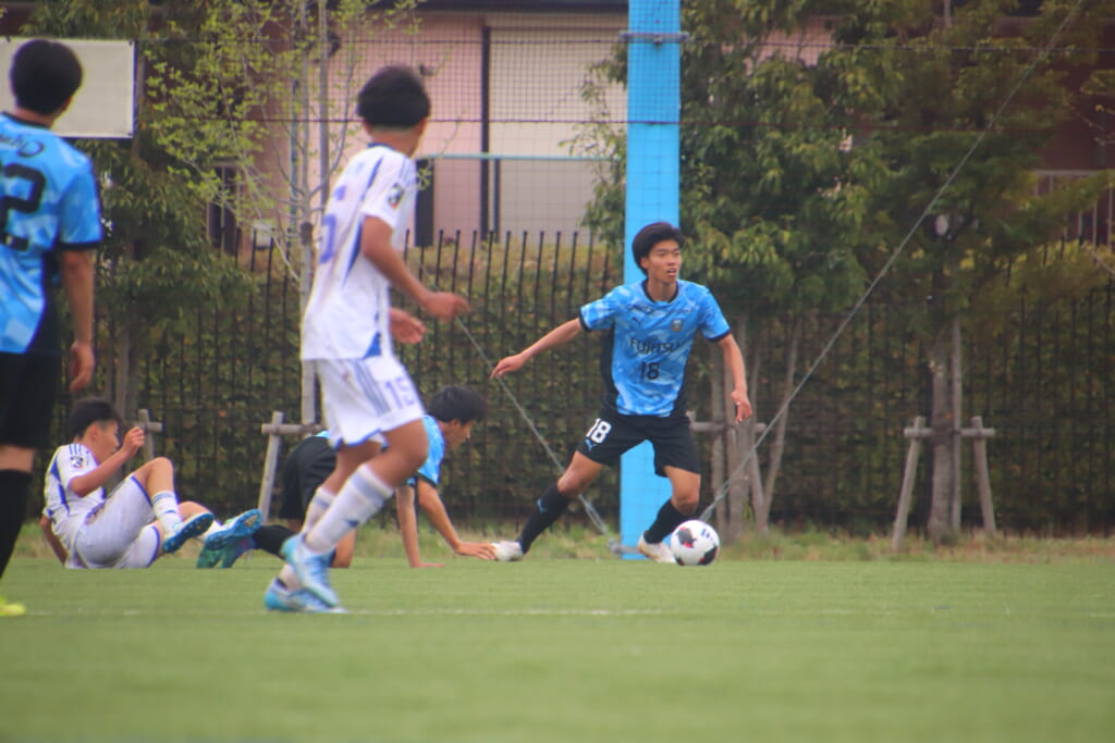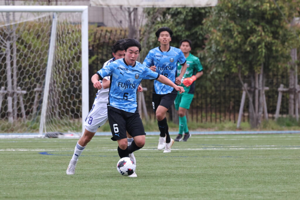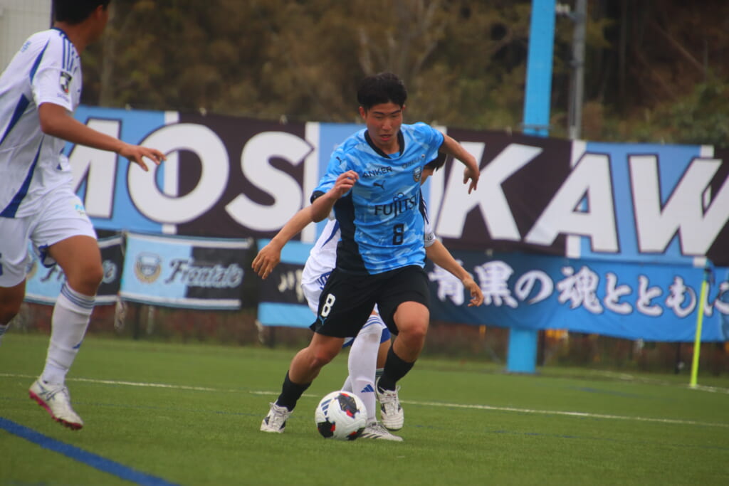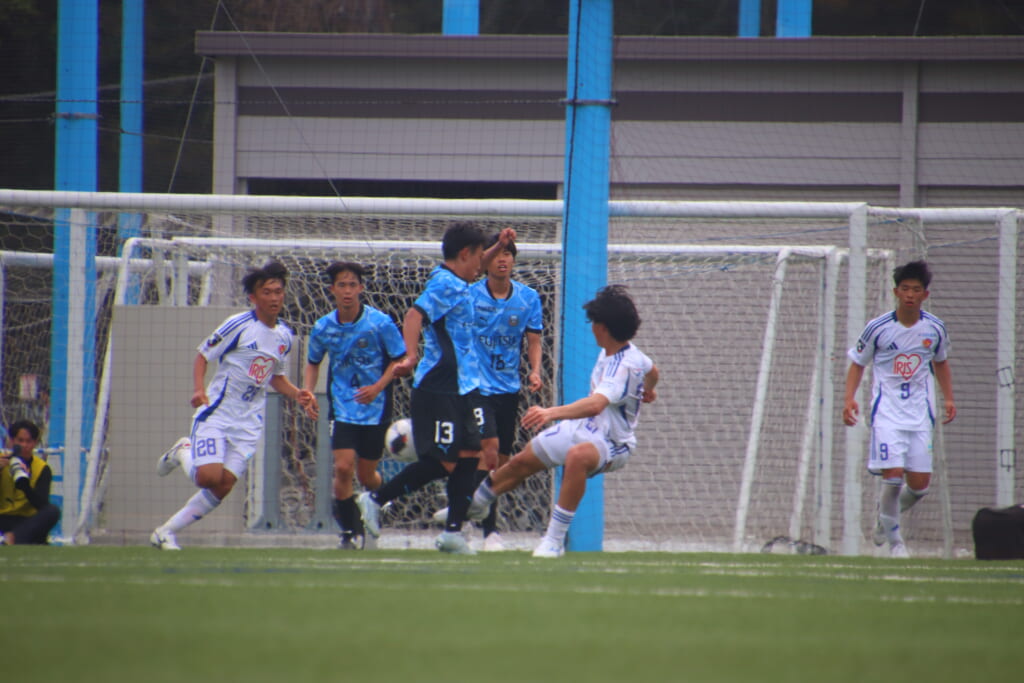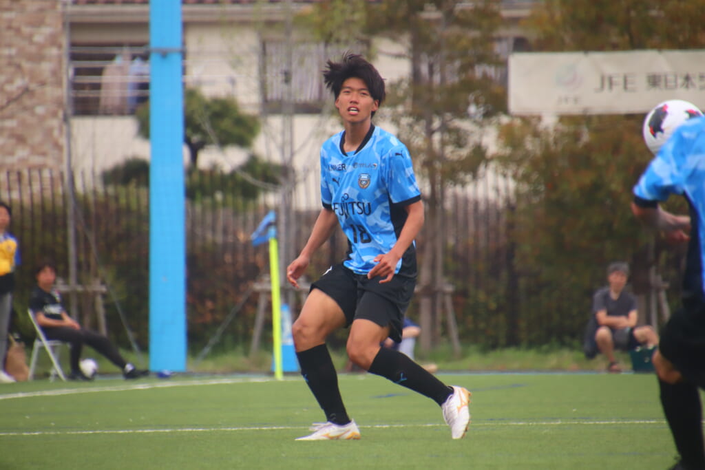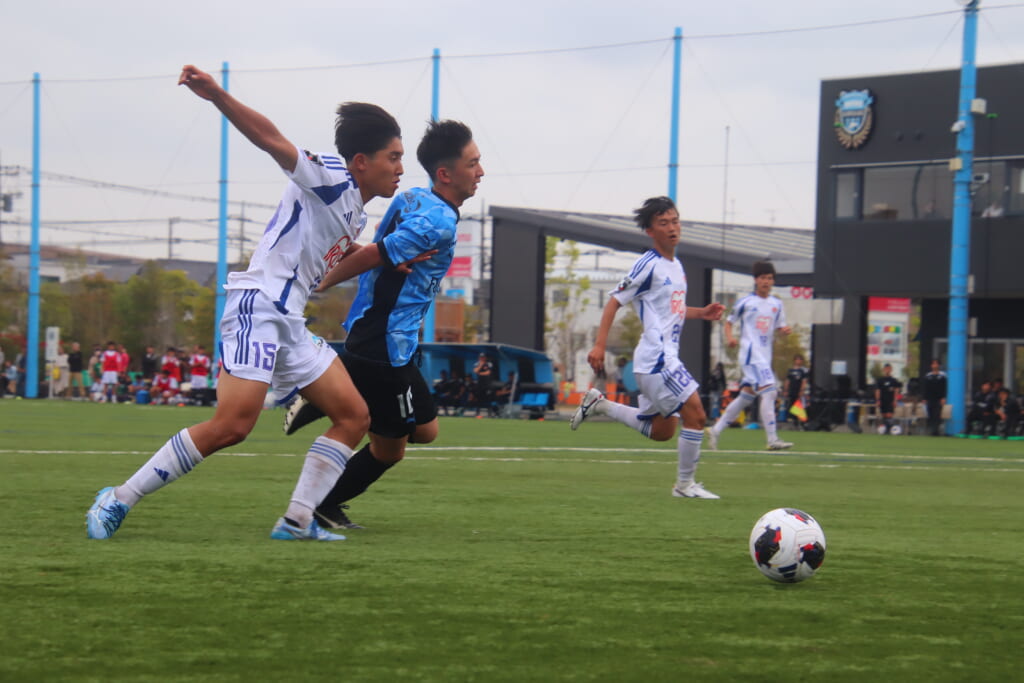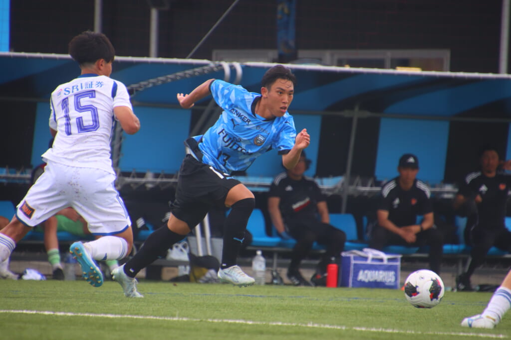 すると2分には、フロンターレ、今廣から左サイド、山川へ。山川から受けた木村が少し前に持ち出し、いったん中央に預け、高い位置へ持ち込み、クロスを上げるとボールはクロスバーを直撃。こぼれ球を拾った木下がエリア内、シュート。しかし、鑓水が体を張り、ブロック。