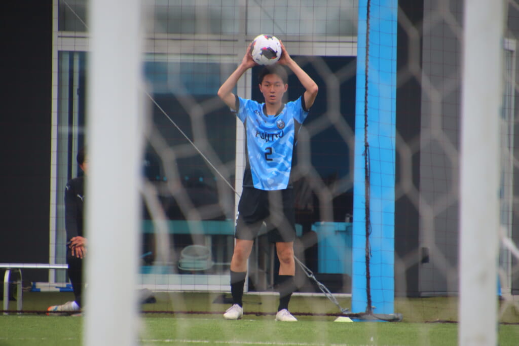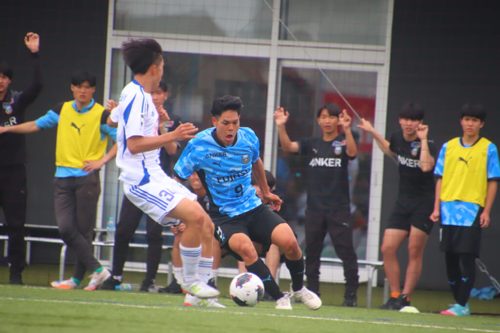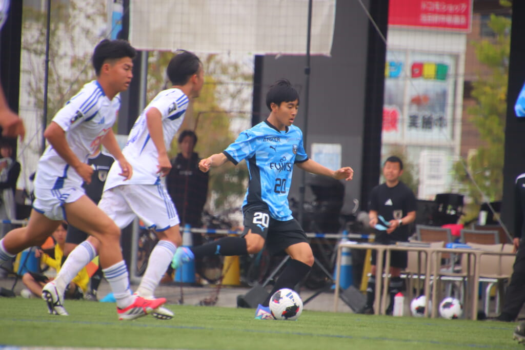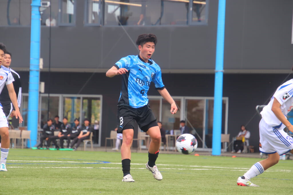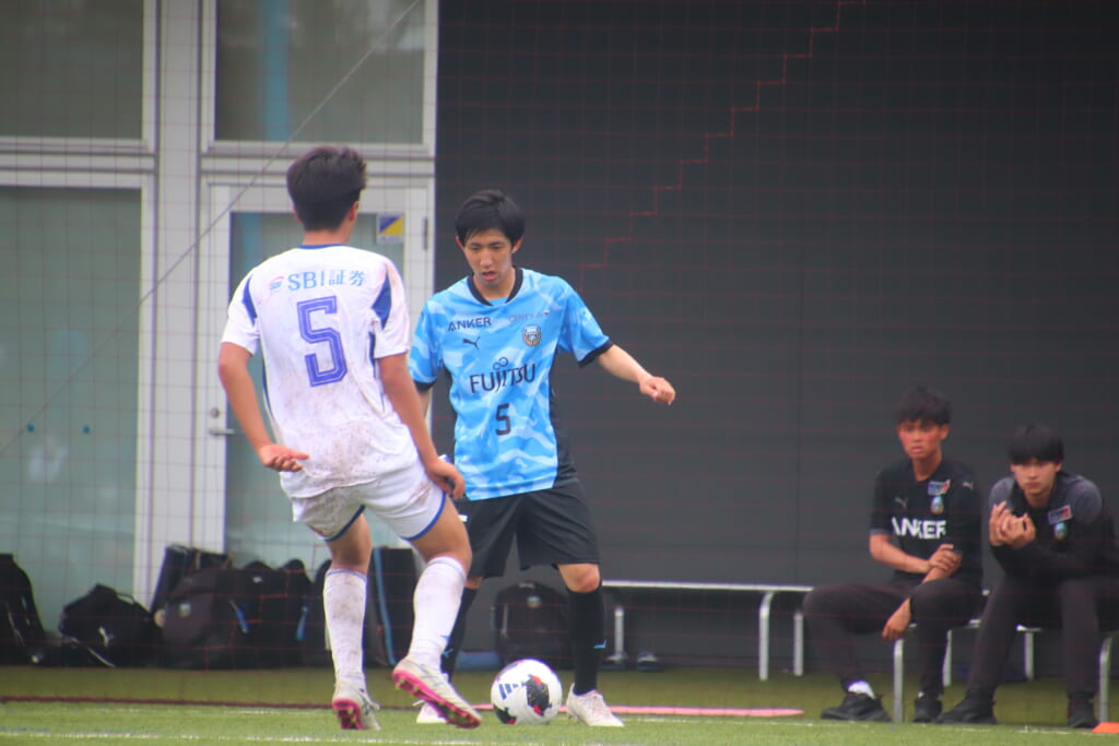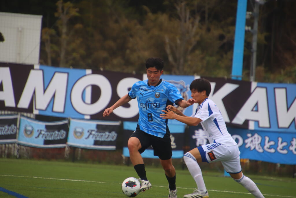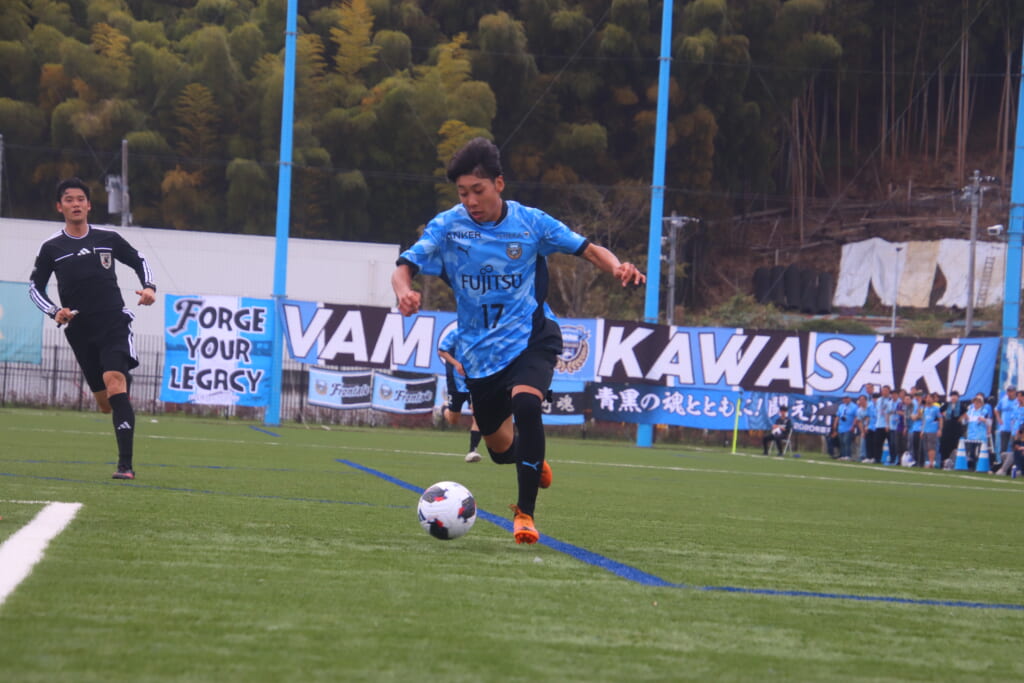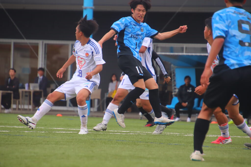 すると2分には、フロンターレ、今廣から左サイド、山川へ。山川から受けた木村が少し前に持ち出し、いったん中央に預け、高い位置へ持ち込み、クロスを上げるとボールはクロスバーを直撃。こぼれ球を拾った木下がエリア内、シュート。しかし、鑓水が体を張り、ブロック。