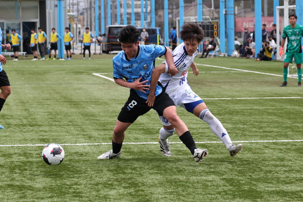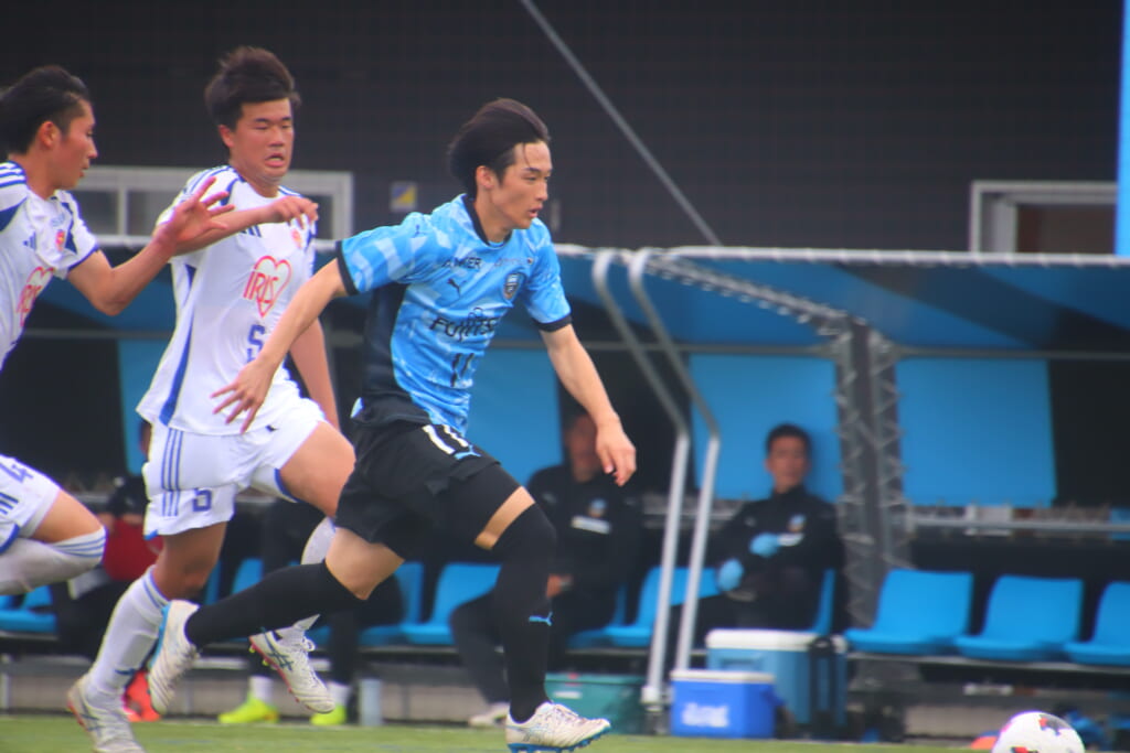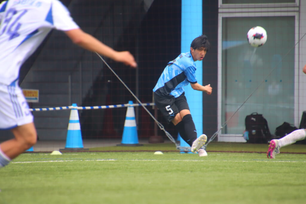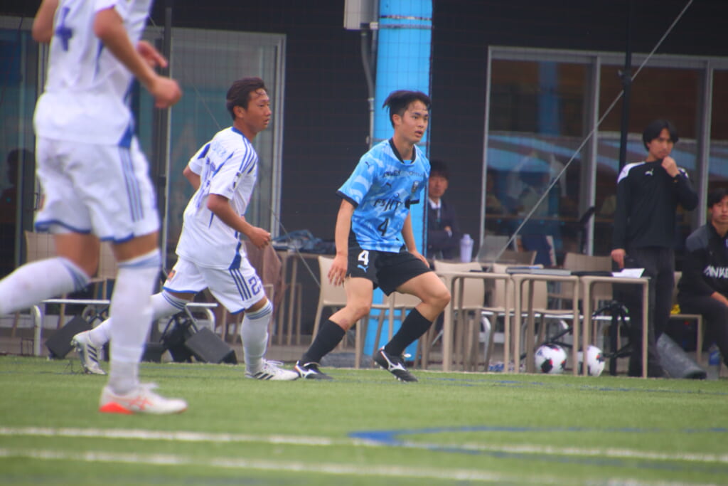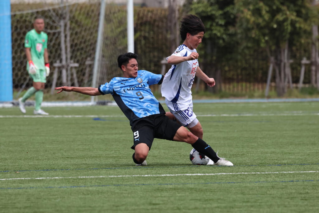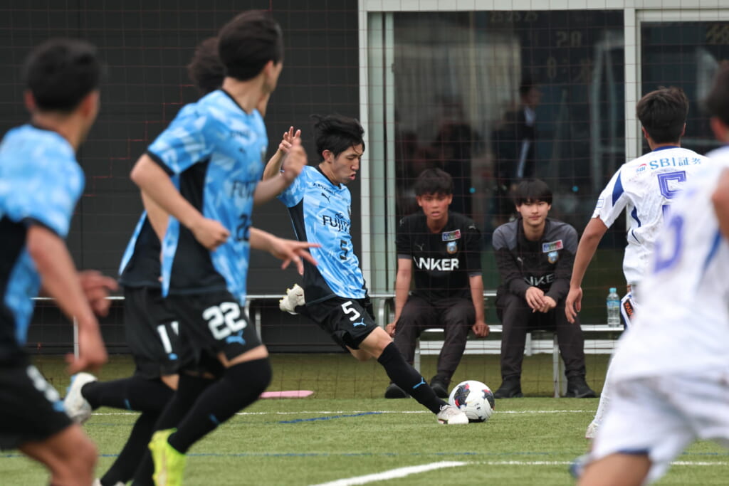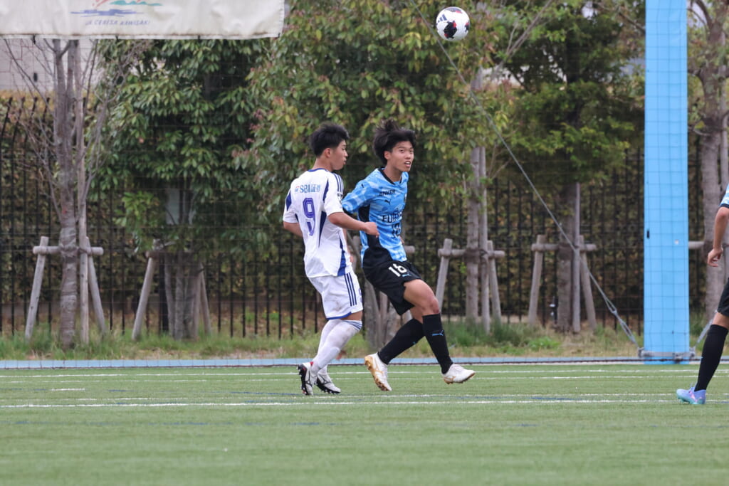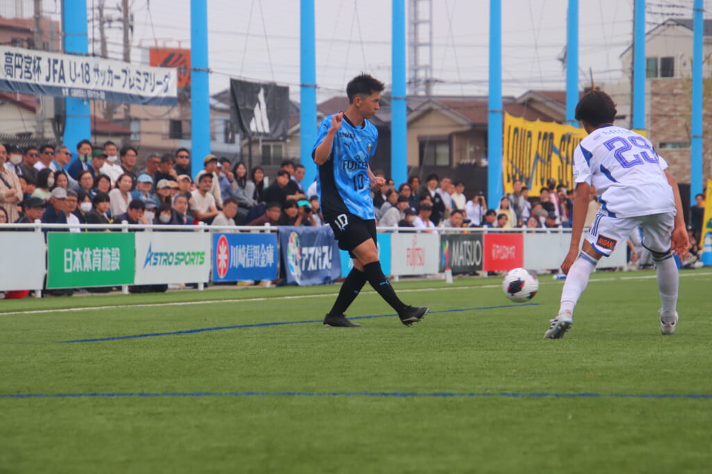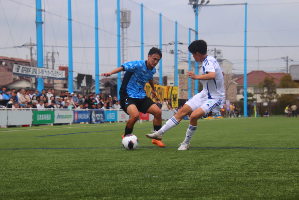 すると2分には、フロンターレ、今廣から左サイド、山川へ。山川から受けた木村が少し前に持ち出し、いったん中央に預け、高い位置へ持ち込み、クロスを上げるとボールはクロスバーを直撃。こぼれ球を拾った木下がエリア内、シュート。しかし、鑓水が体を張り、ブロック。