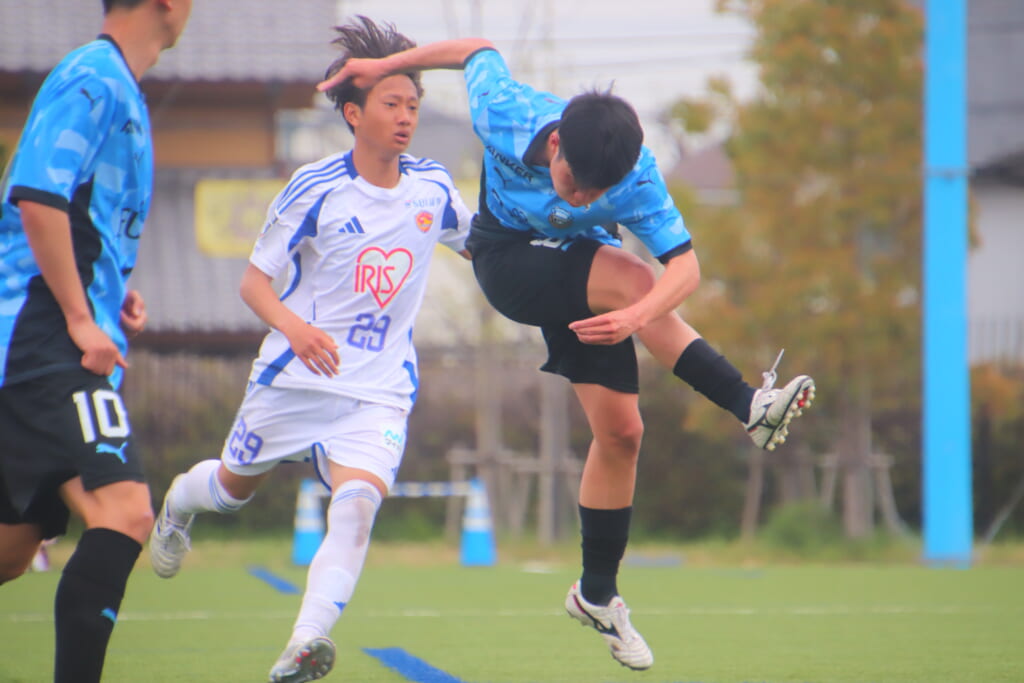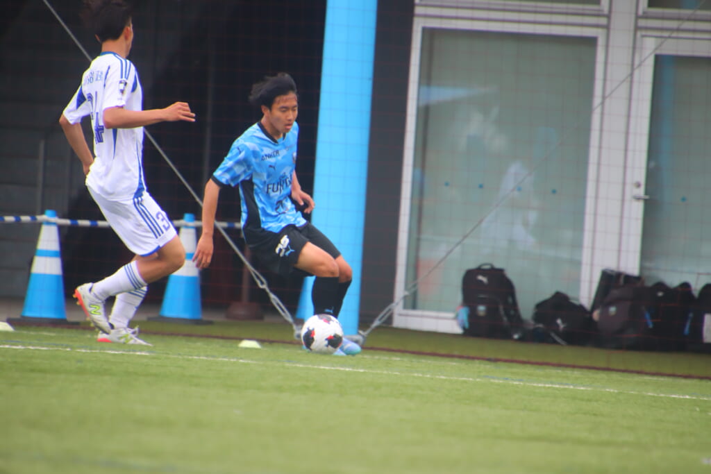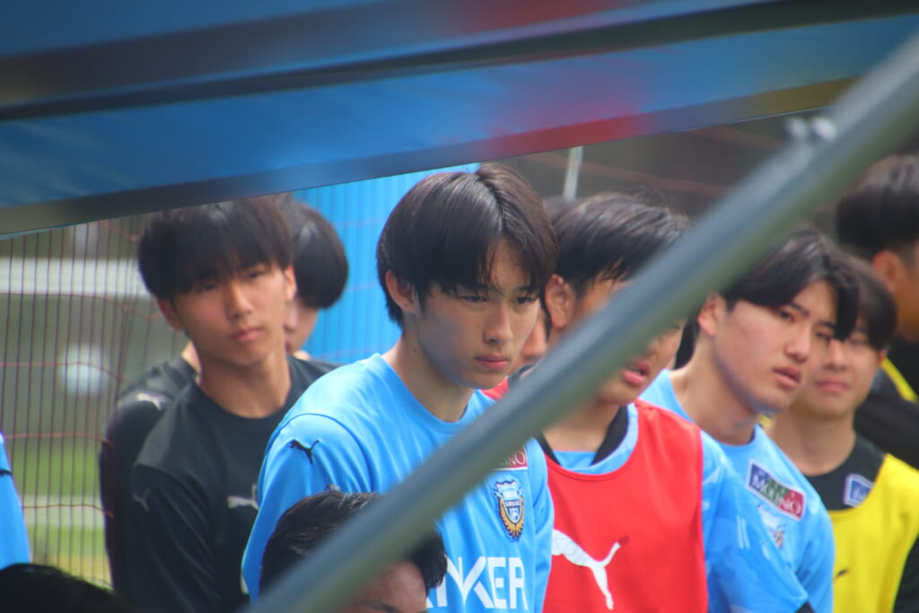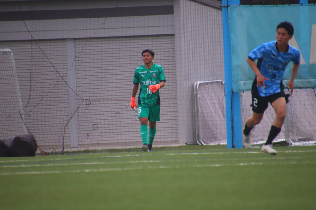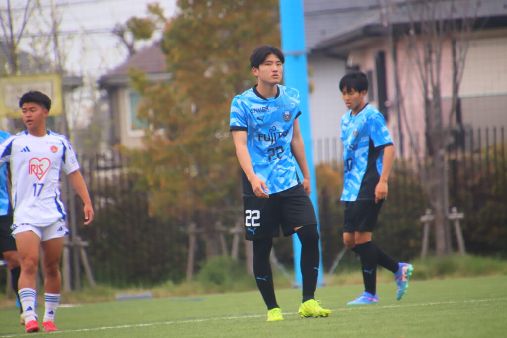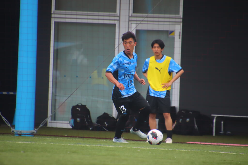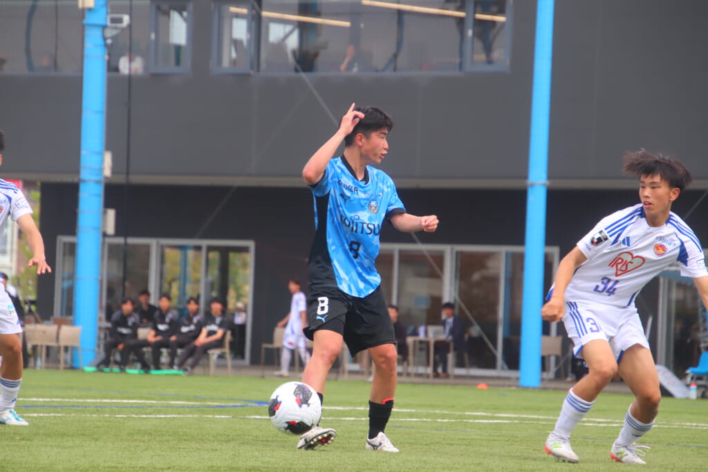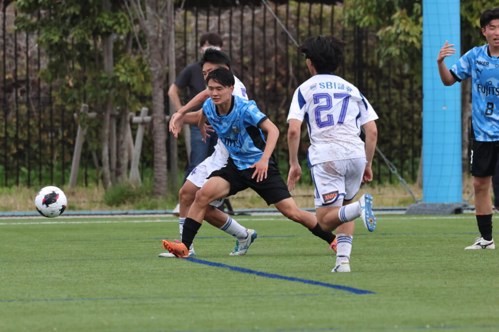 すると2分には、フロンターレ、今廣から左サイド、山川へ。山川から受けた木村が少し前に持ち出し、いったん中央に預け、高い位置へ持ち込み、クロスを上げるとボールはクロスバーを直撃。こぼれ球を拾った木下がエリア内、シュート。しかし、鑓水が体を張り、ブロック。