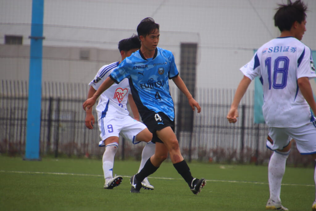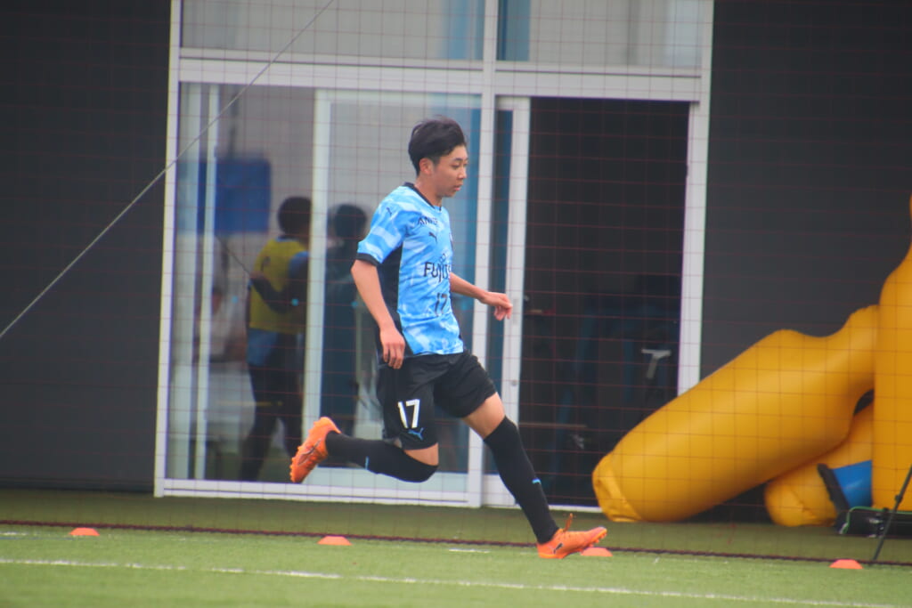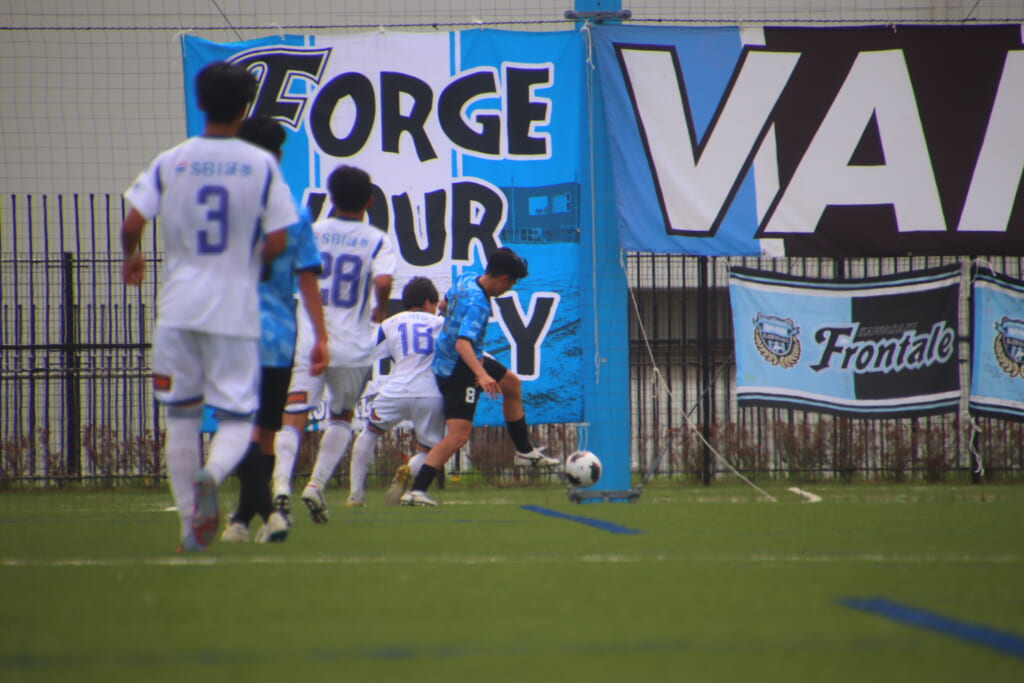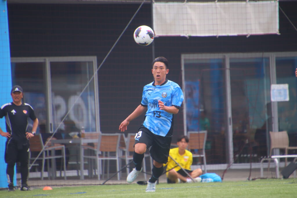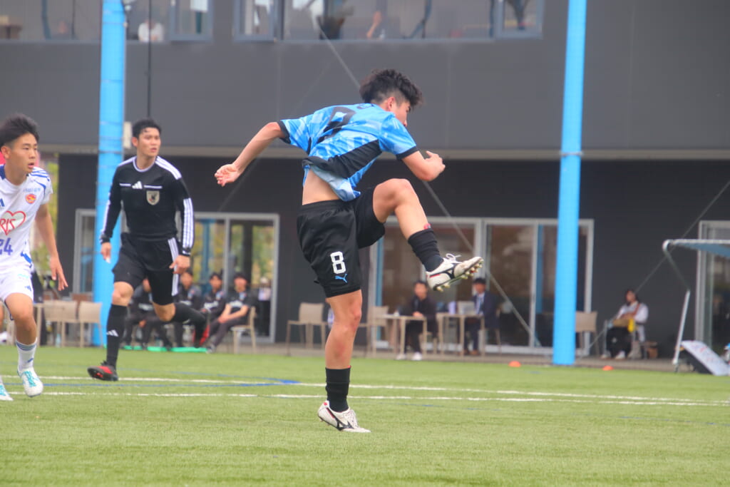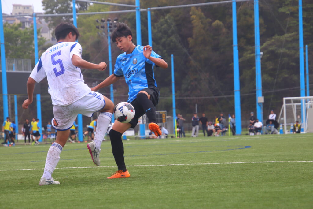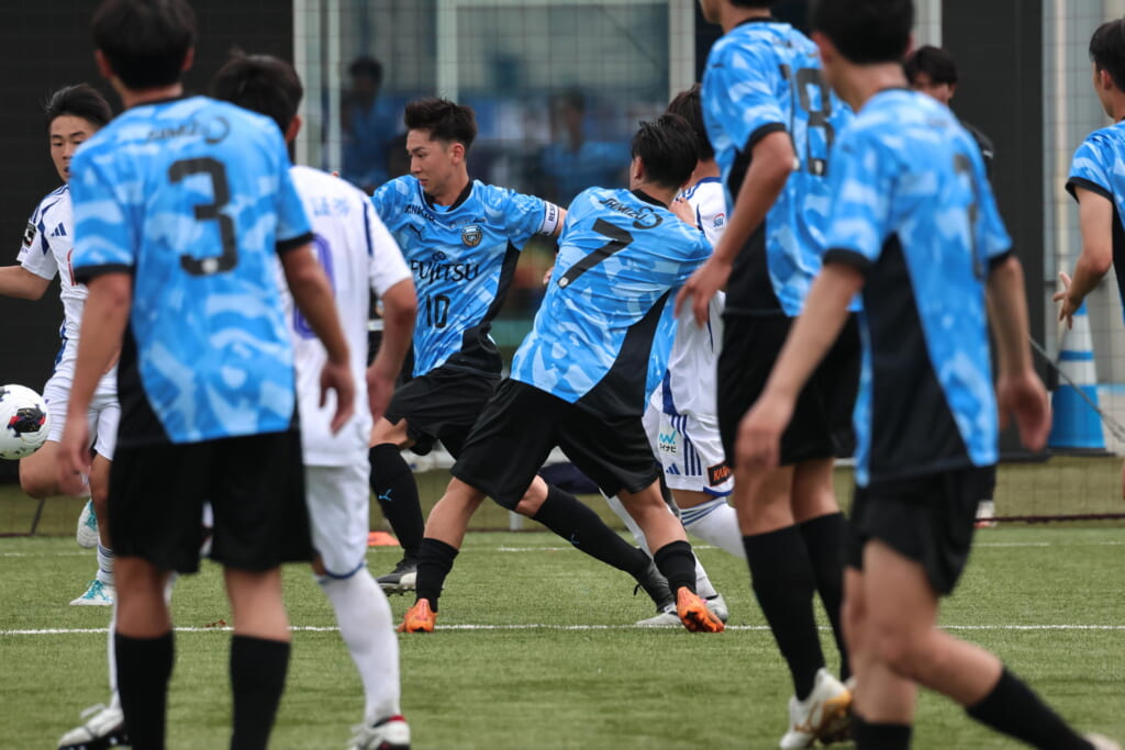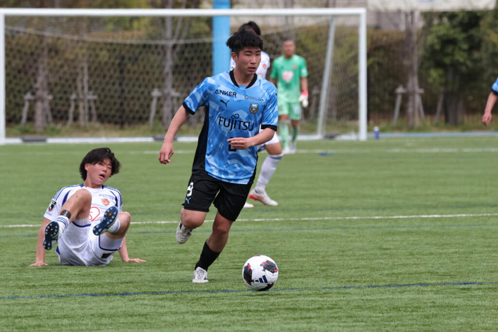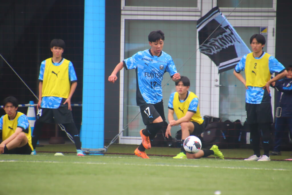 すると2分には、フロンターレ、今廣から左サイド、山川へ。山川から受けた木村が少し前に持ち出し、いったん中央に預け、高い位置へ持ち込み、クロスを上げるとボールはクロスバーを直撃。こぼれ球を拾った木下がエリア内、シュート。しかし、鑓水が体を張り、ブロック。