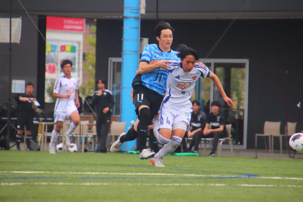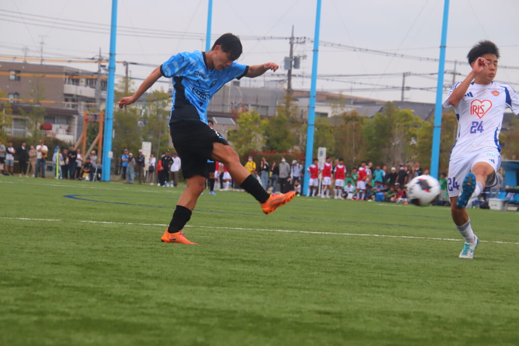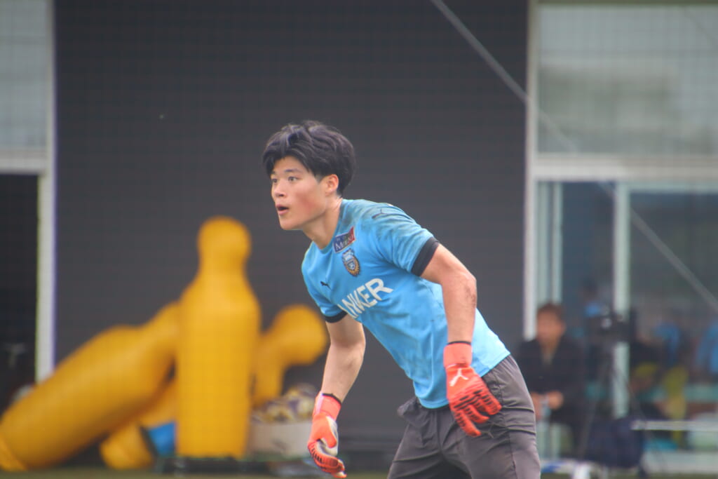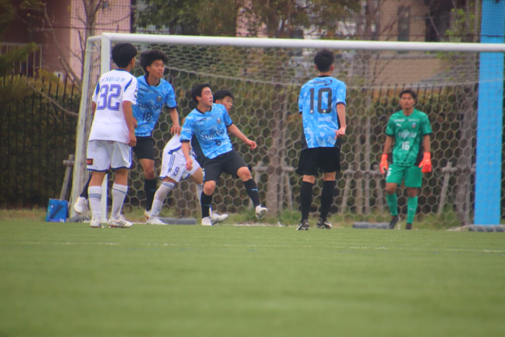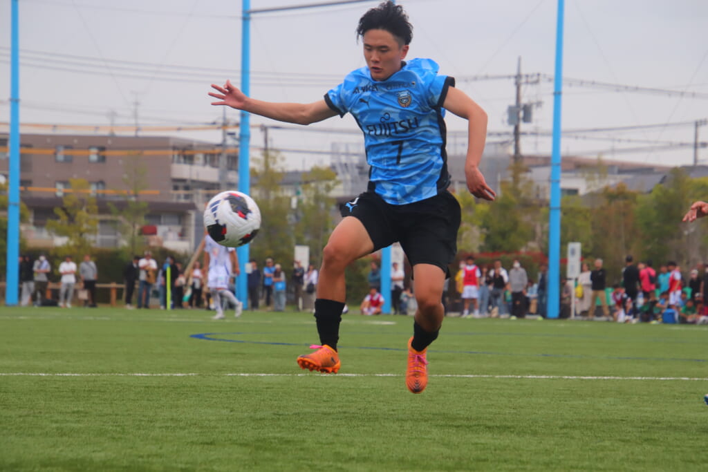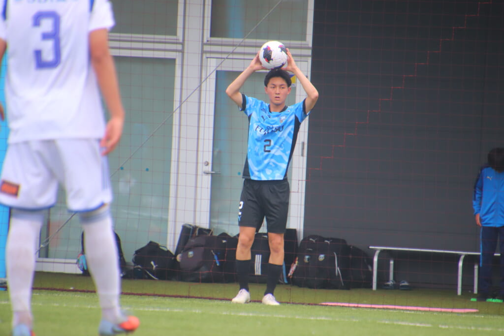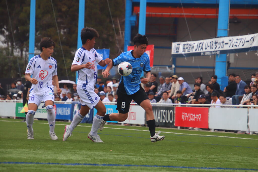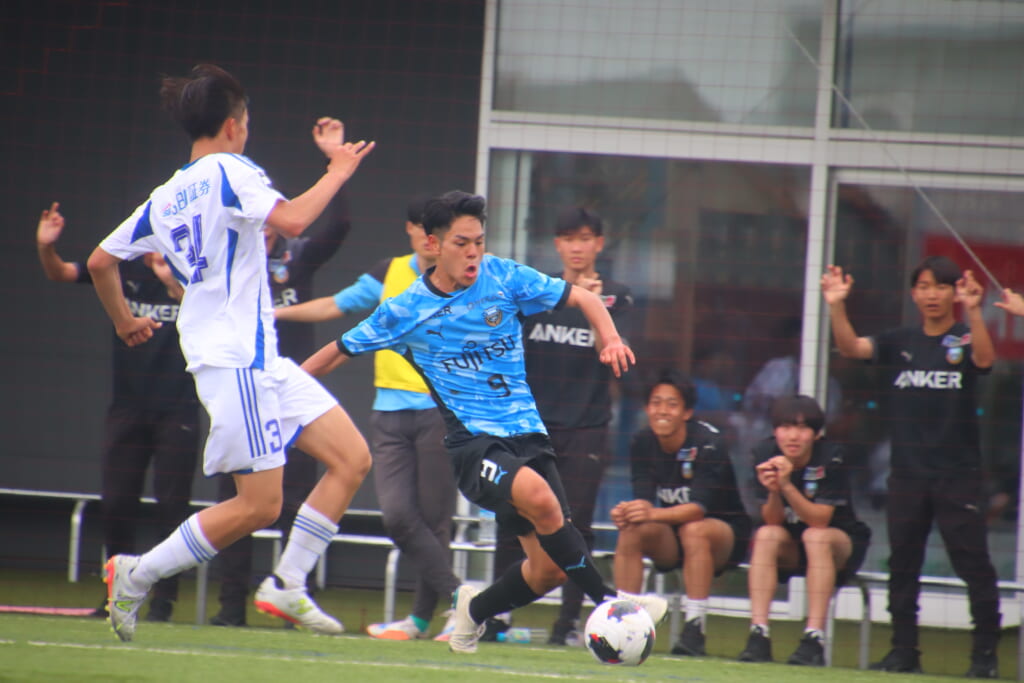 すると2分には、フロンターレ、今廣から左サイド、山川へ。山川から受けた木村が少し前に持ち出し、いったん中央に預け、高い位置へ持ち込み、クロスを上げるとボールはクロスバーを直撃。こぼれ球を拾った木下がエリア内、シュート。しかし、鑓水が体を張り、ブロック。