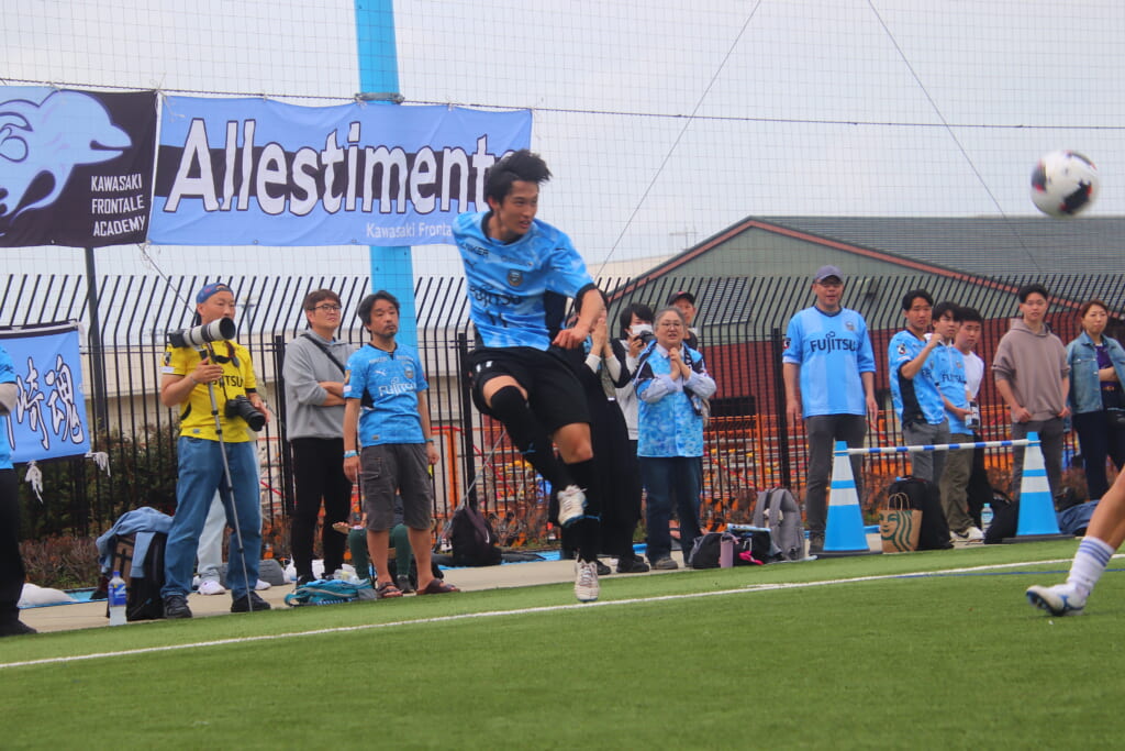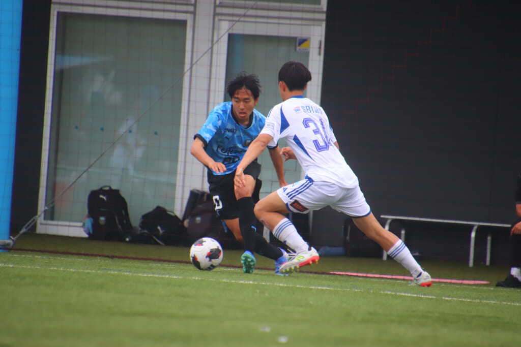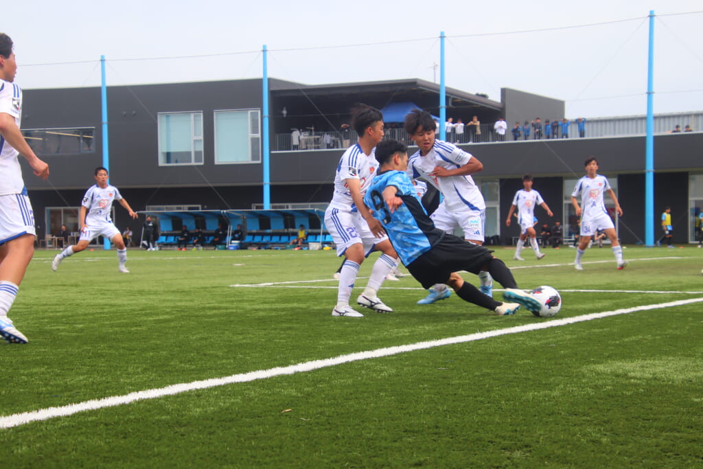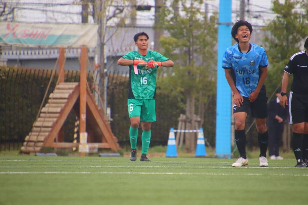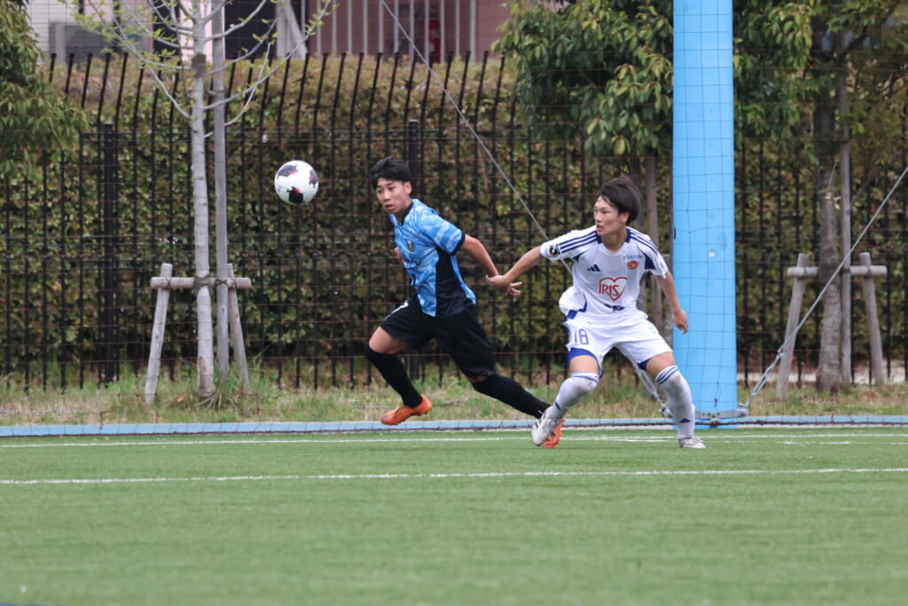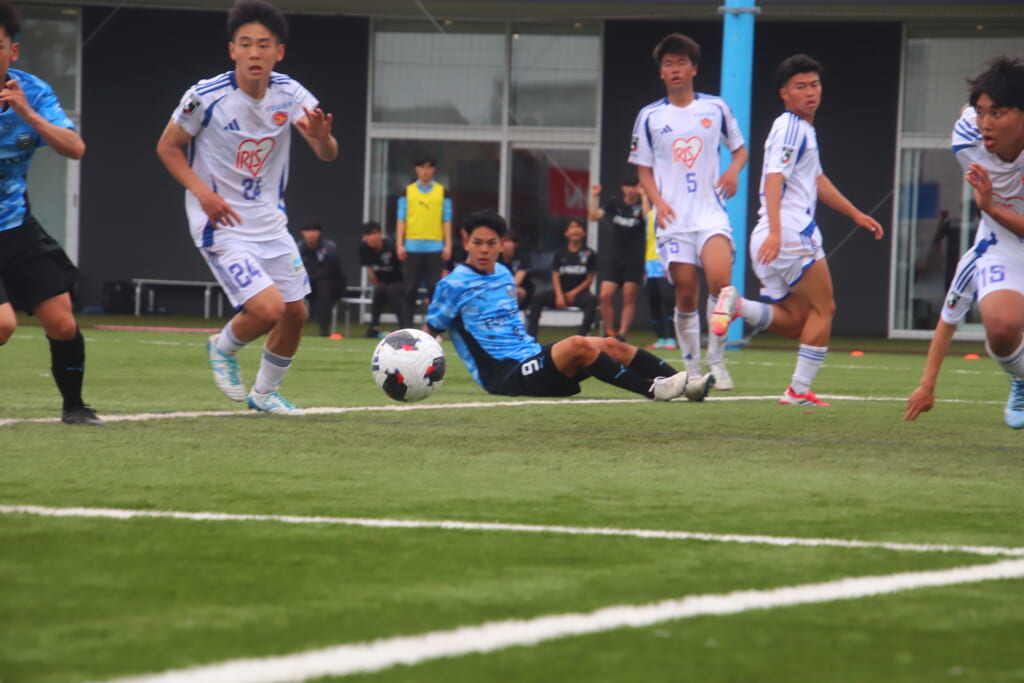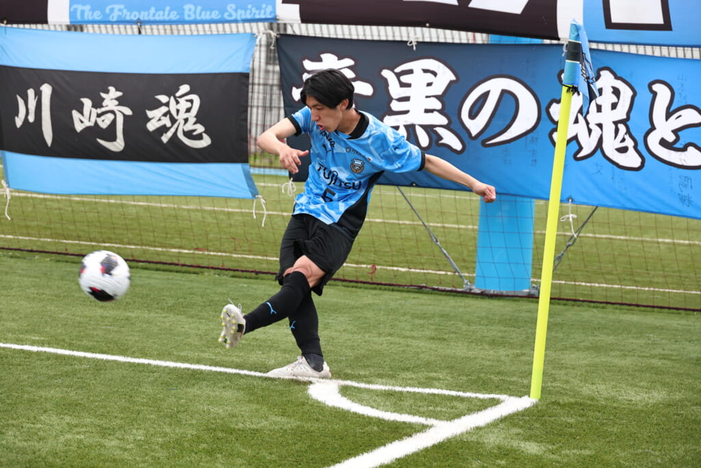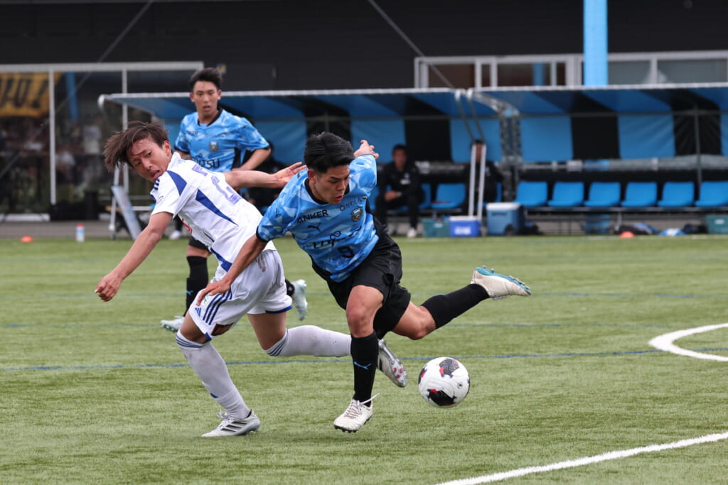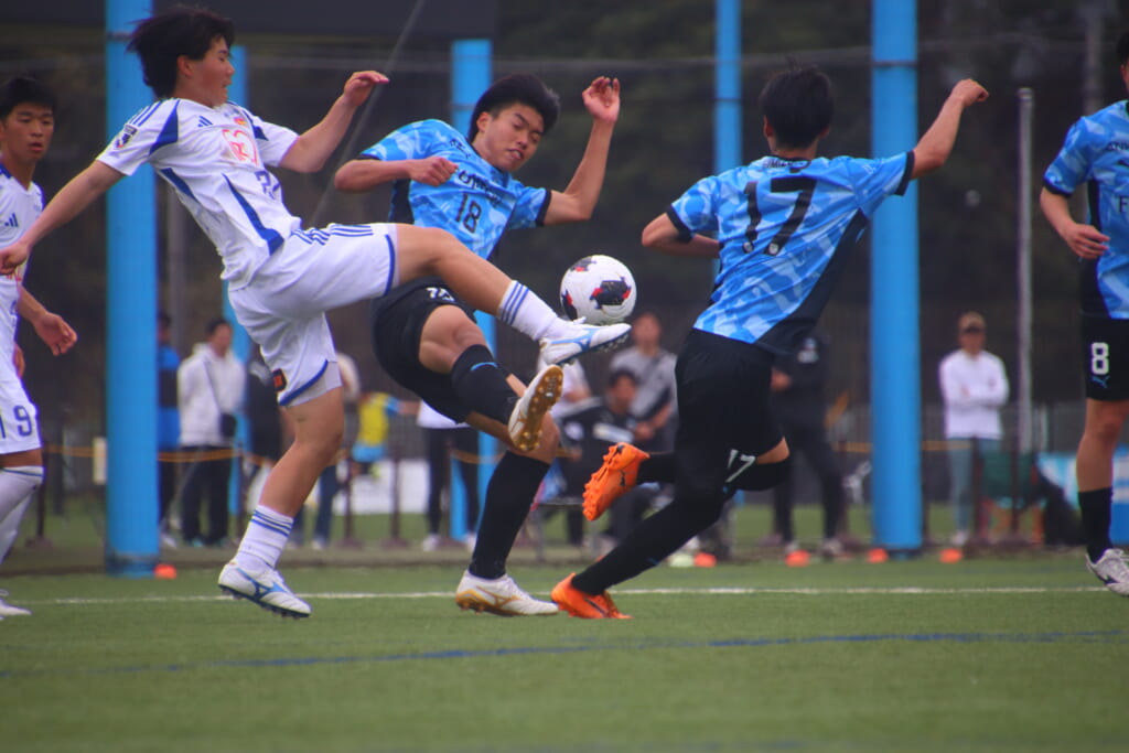 すると2分には、フロンターレ、今廣から左サイド、山川へ。山川から受けた木村が少し前に持ち出し、いったん中央に預け、高い位置へ持ち込み、クロスを上げるとボールはクロスバーを直撃。こぼれ球を拾った木下がエリア内、シュート。しかし、鑓水が体を張り、ブロック。