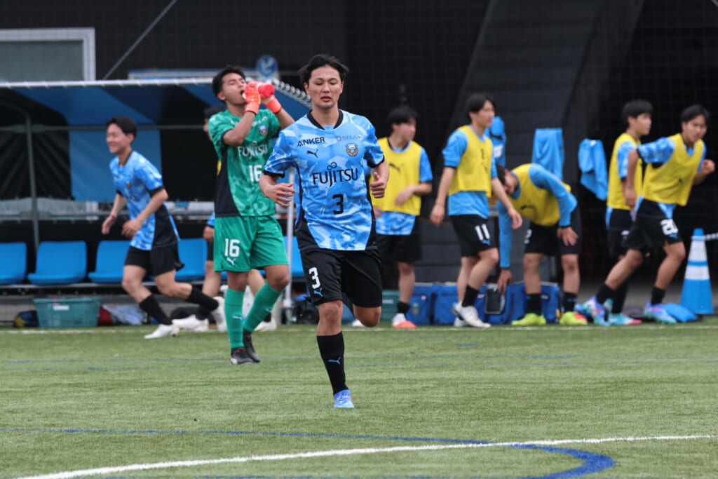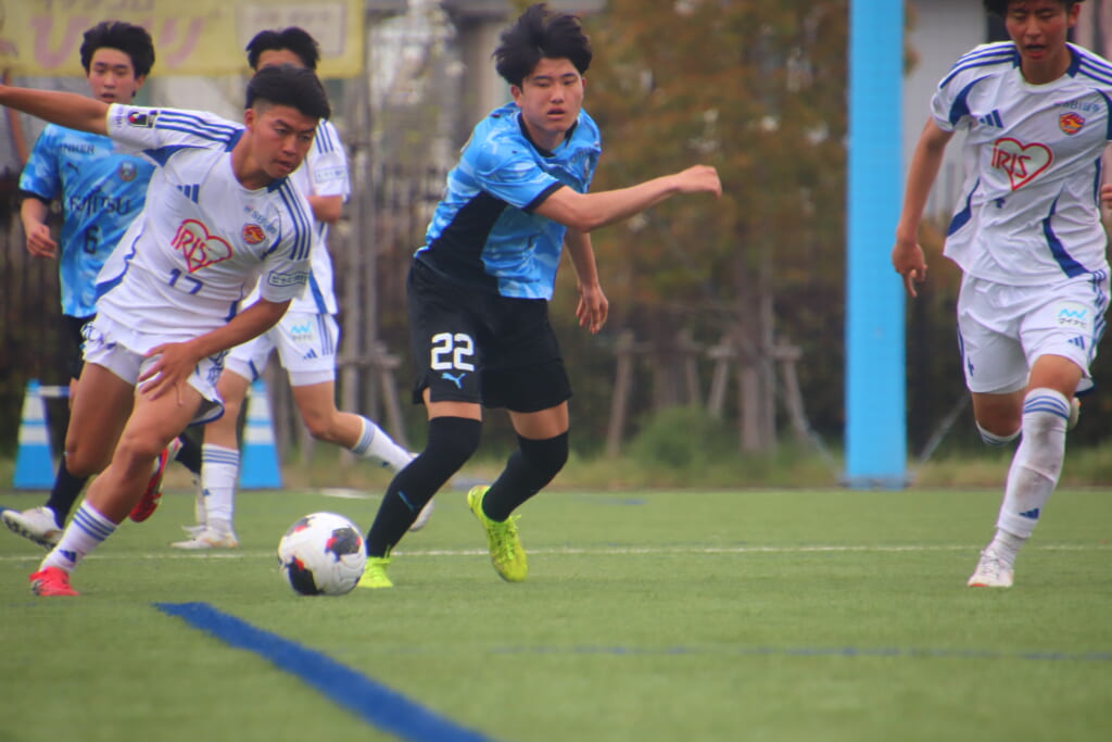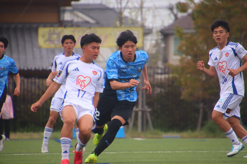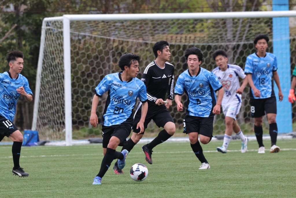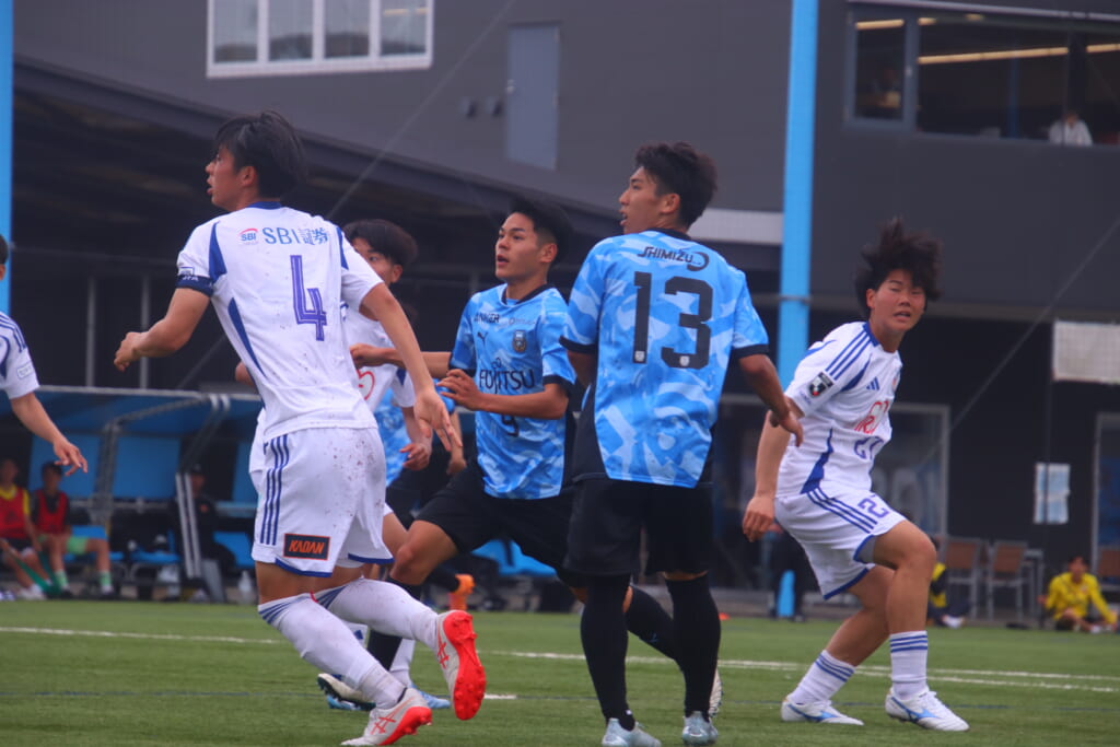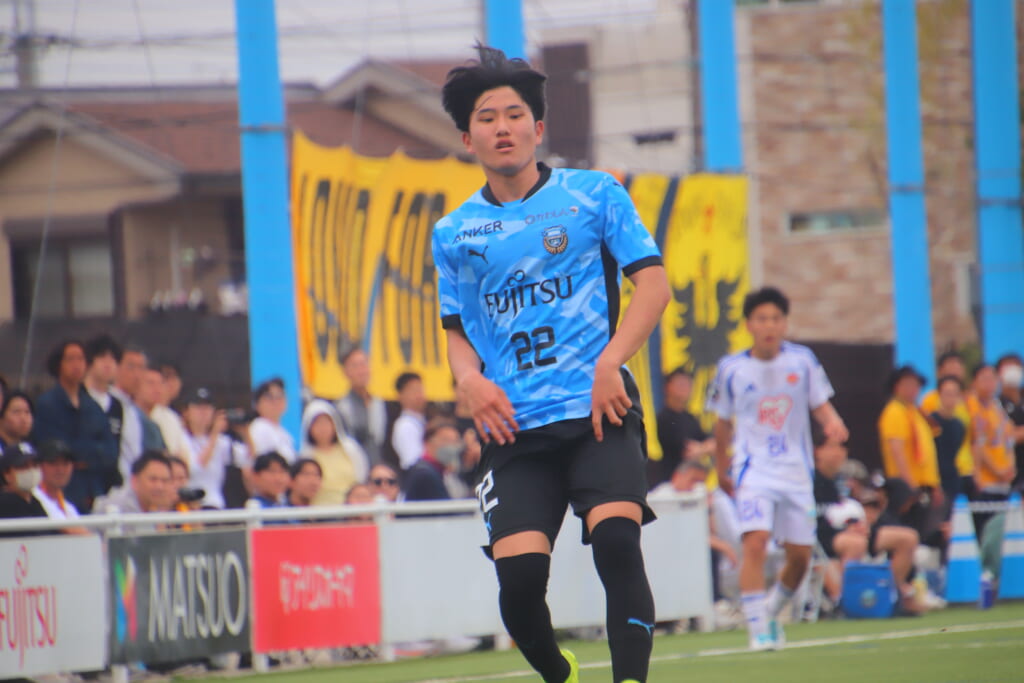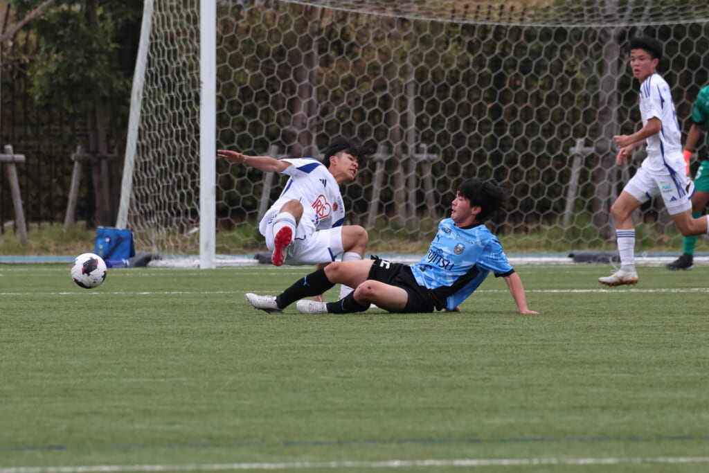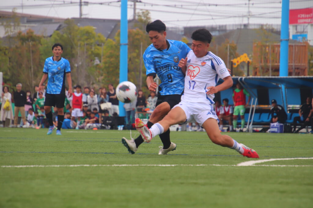 すると2分には、フロンターレ、今廣から左サイド、山川へ。山川から受けた木村が少し前に持ち出し、いったん中央に預け、高い位置へ持ち込み、クロスを上げるとボールはクロスバーを直撃。こぼれ球を拾った木下がエリア内、シュート。しかし、鑓水が体を張り、ブロック。