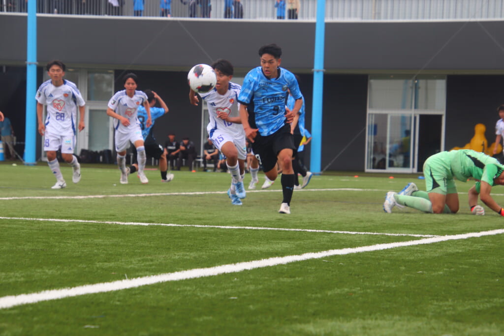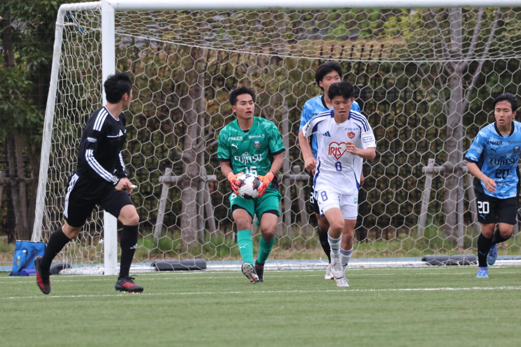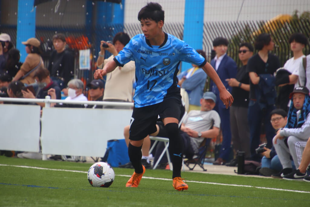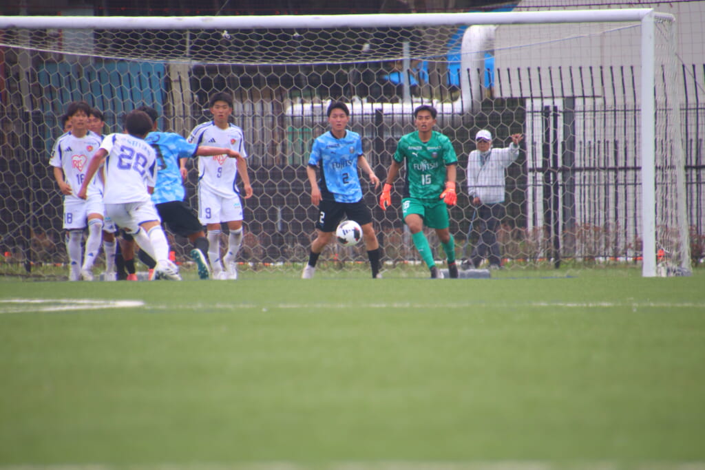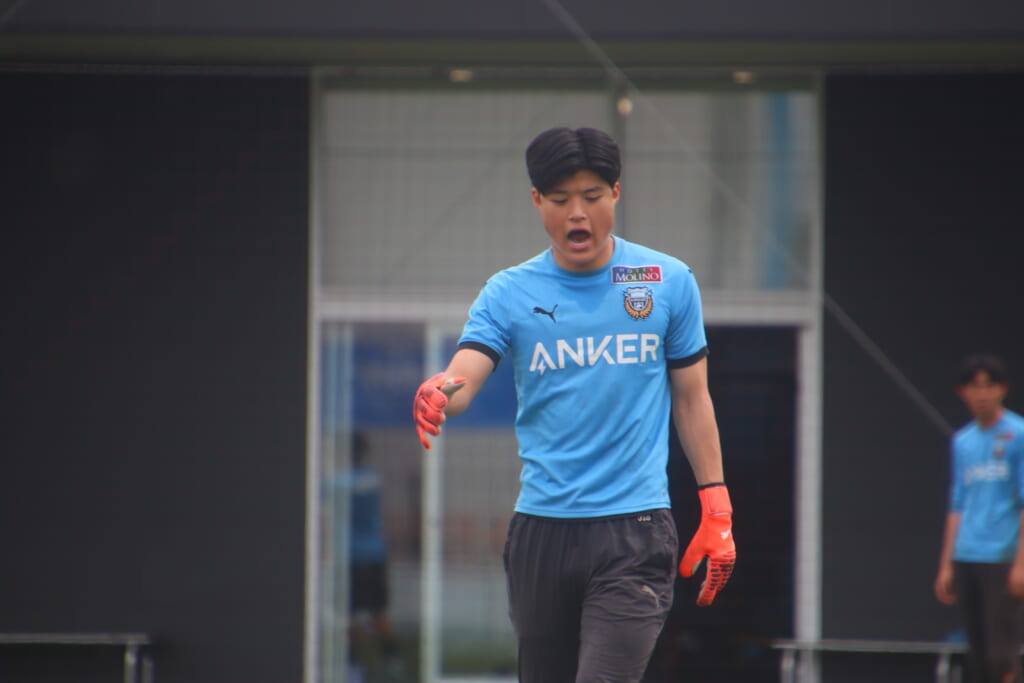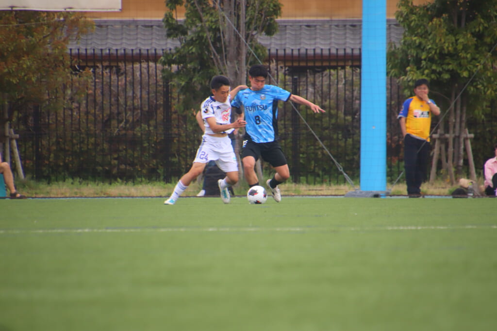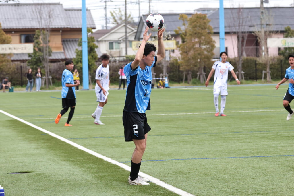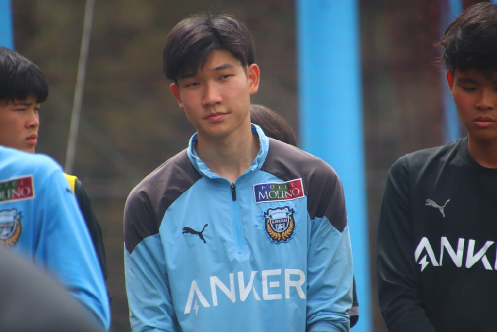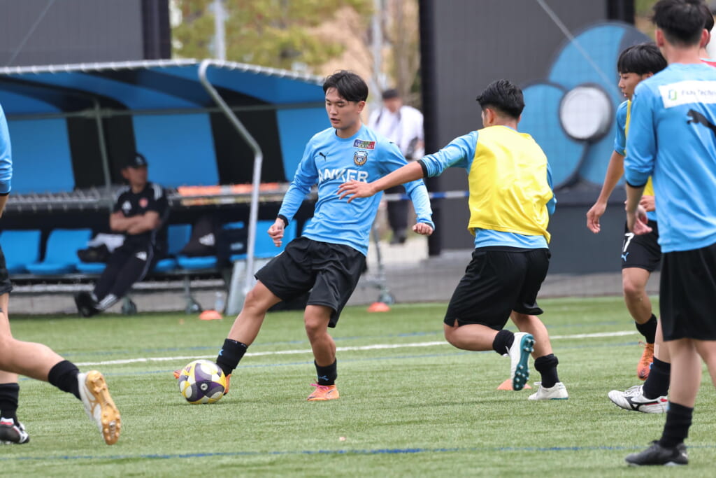 すると2分には、フロンターレ、今廣から左サイド、山川へ。山川から受けた木村が少し前に持ち出し、いったん中央に預け、高い位置へ持ち込み、クロスを上げるとボールはクロスバーを直撃。こぼれ球を拾った木下がエリア内、シュート。しかし、鑓水が体を張り、ブロック。