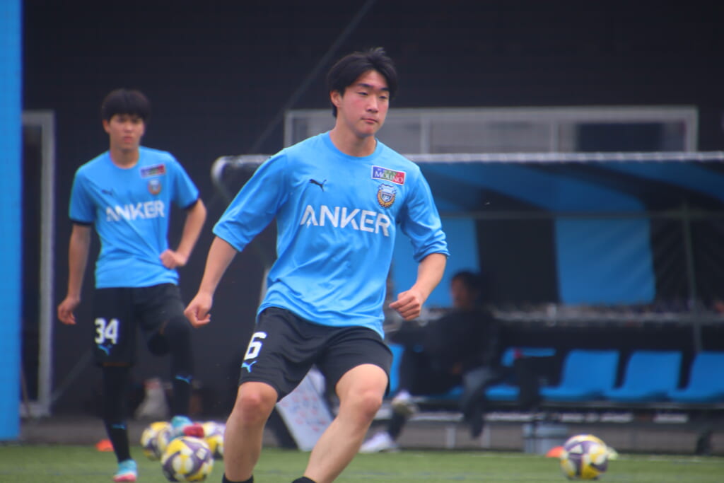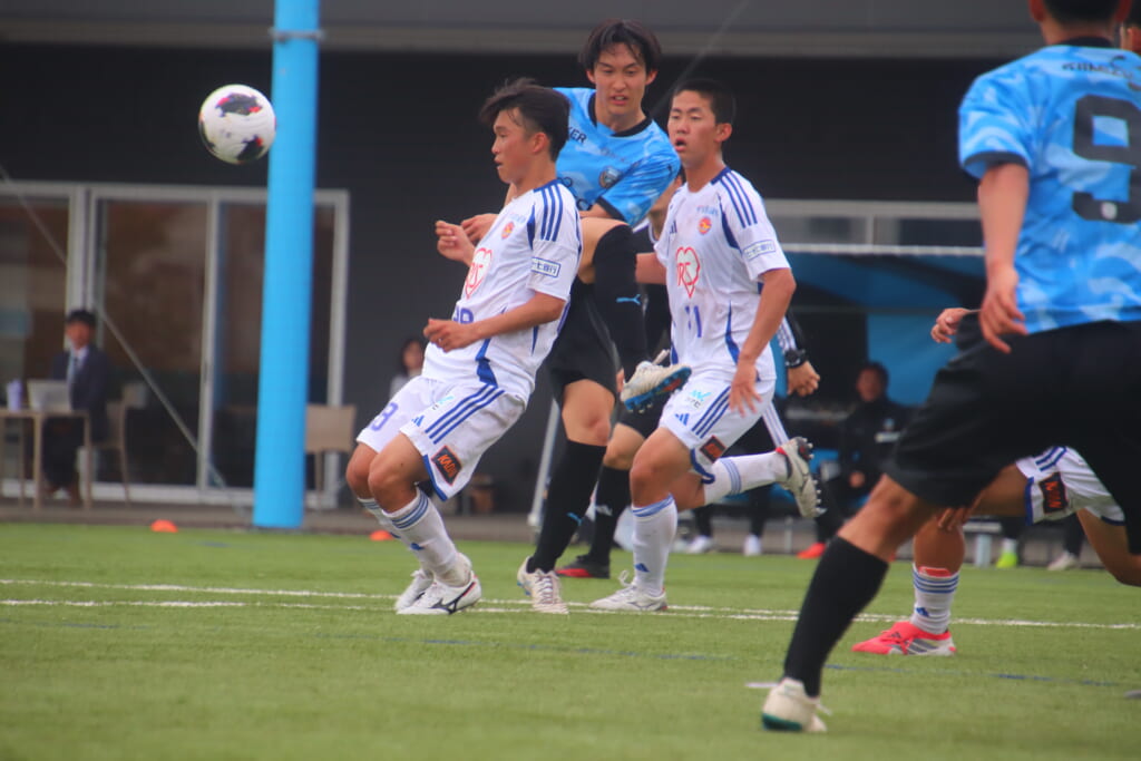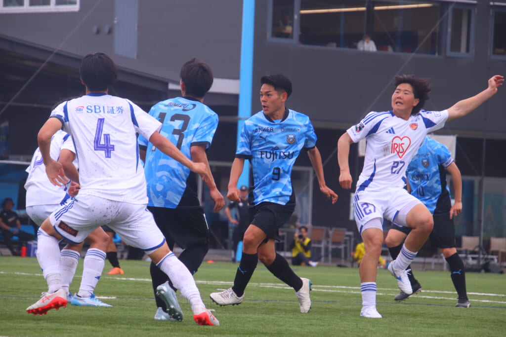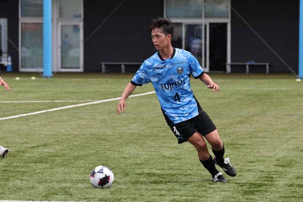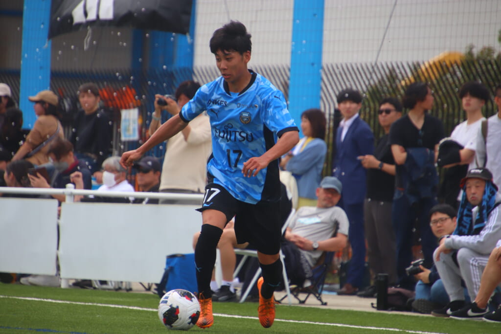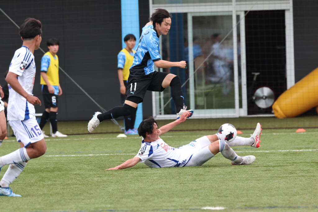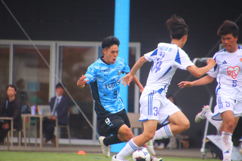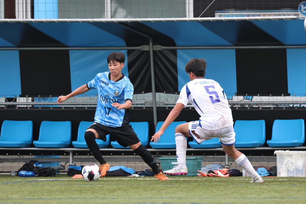 すると2分には、フロンターレ、今廣から左サイド、山川へ。山川から受けた木村が少し前に持ち出し、いったん中央に預け、高い位置へ持ち込み、クロスを上げるとボールはクロスバーを直撃。こぼれ球を拾った木下がエリア内、シュート。しかし、鑓水が体を張り、ブロック。