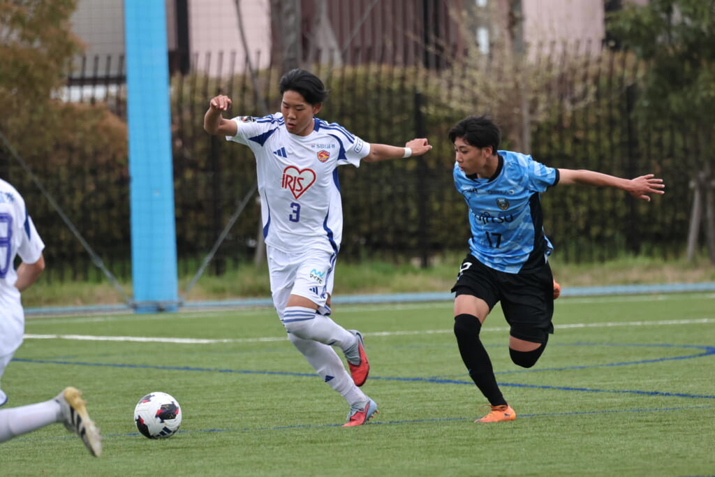 3分には、少し前に持ち出した石原のパスに抜け出した徳永が右クロス。しかし、エリア内を小川翔太がカバーしていきます。