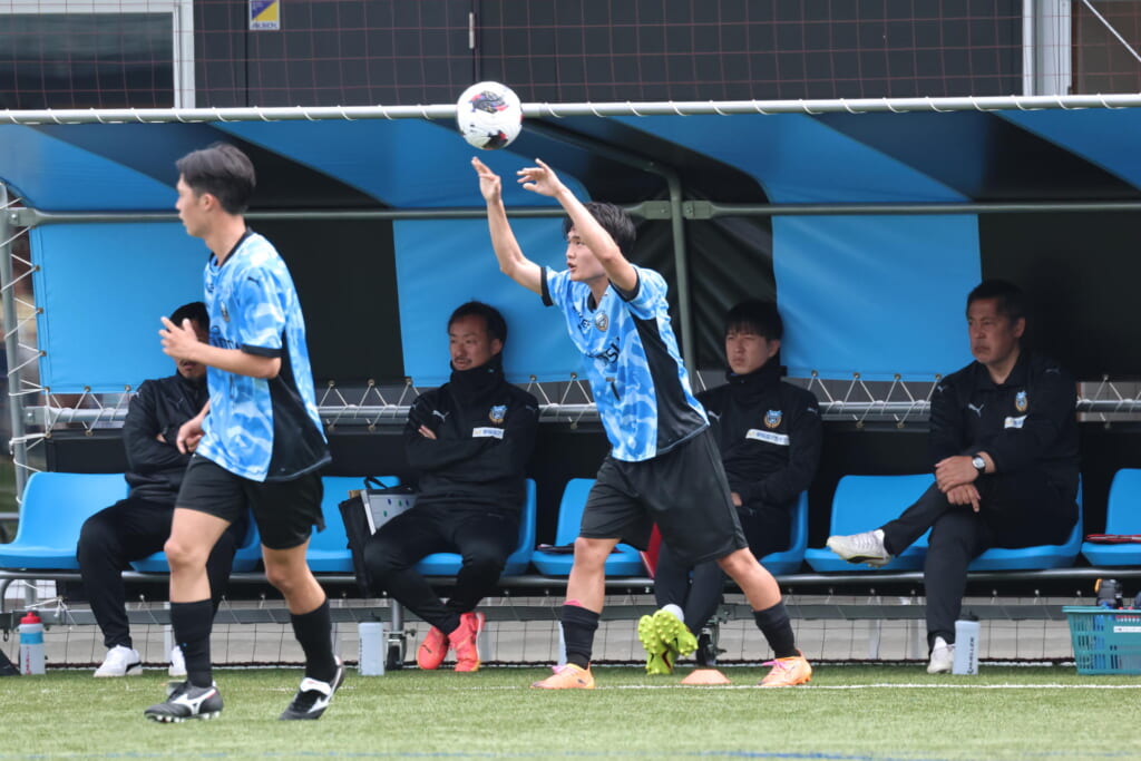 下がり目に川村が下り、川村から受けた小川尋斗が左サイドを持ち上がり、スローインを得るなど相手陣内でプレーする時間をつくっていくフロンターレ。