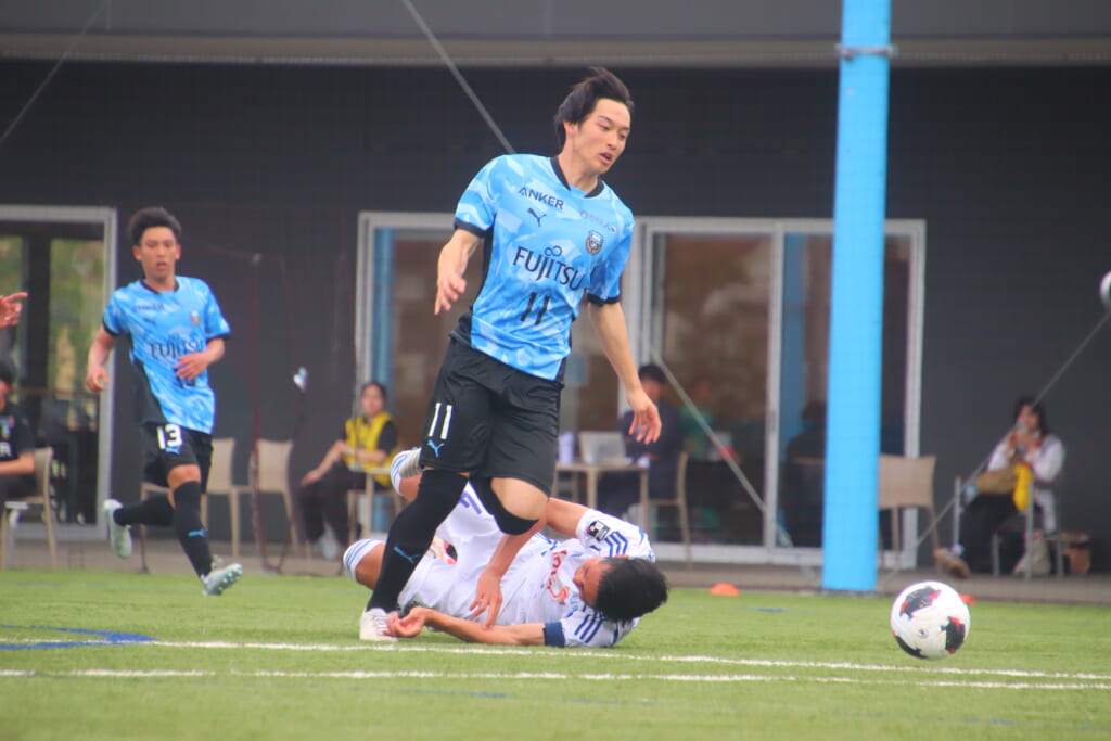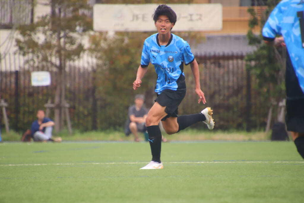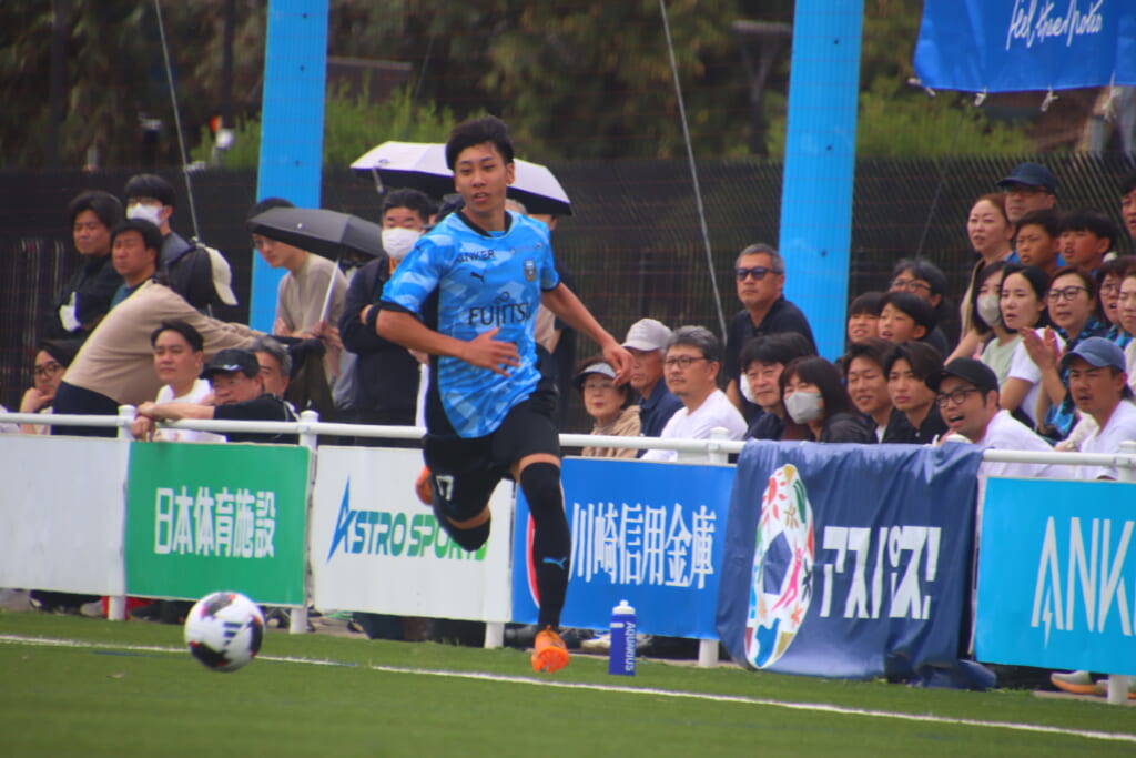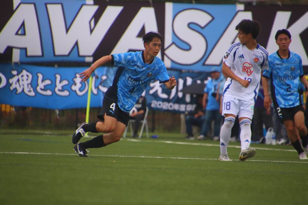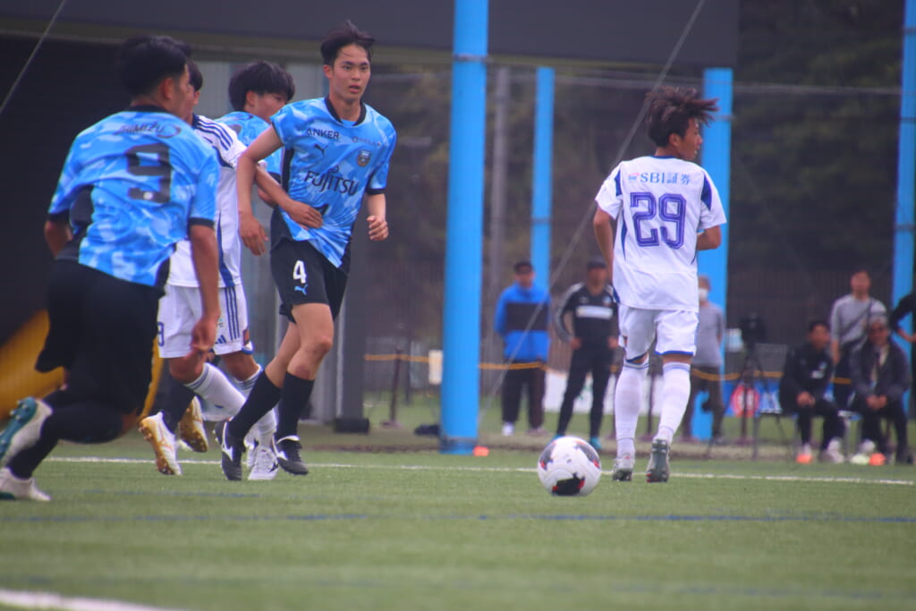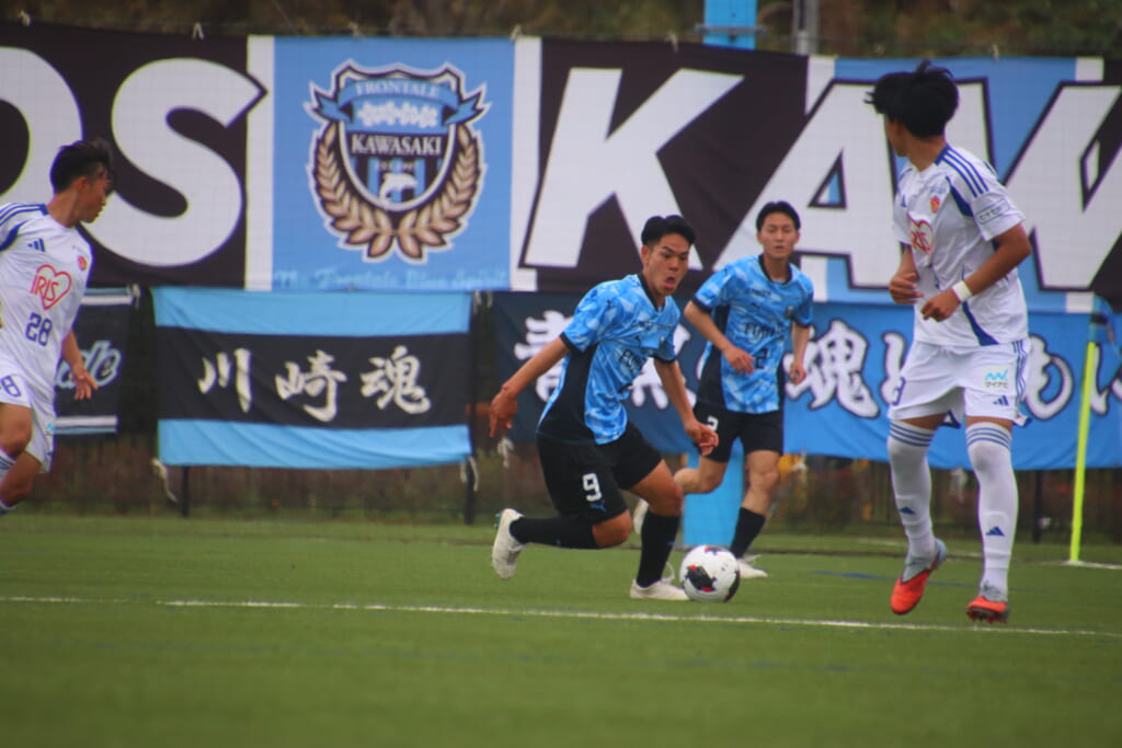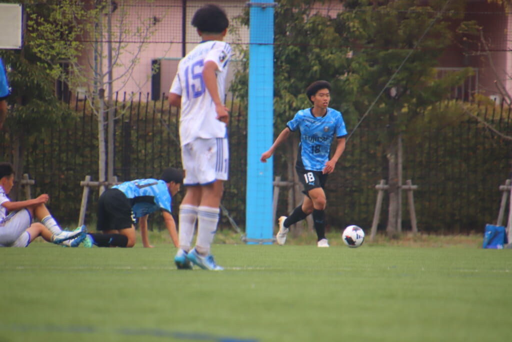 すると32分には、フロンターレ、小田から木下、木下から十河と右サイドでつながり、間で受けた小川尋斗から左サイド、廣瀬へ。