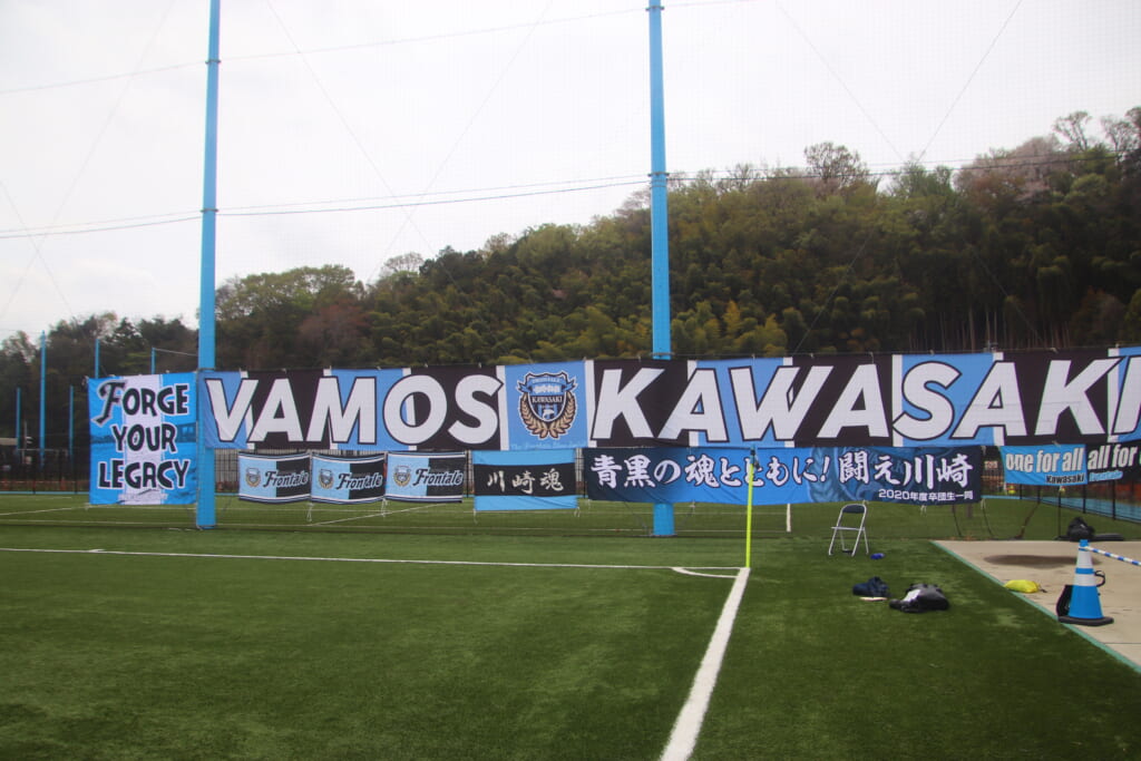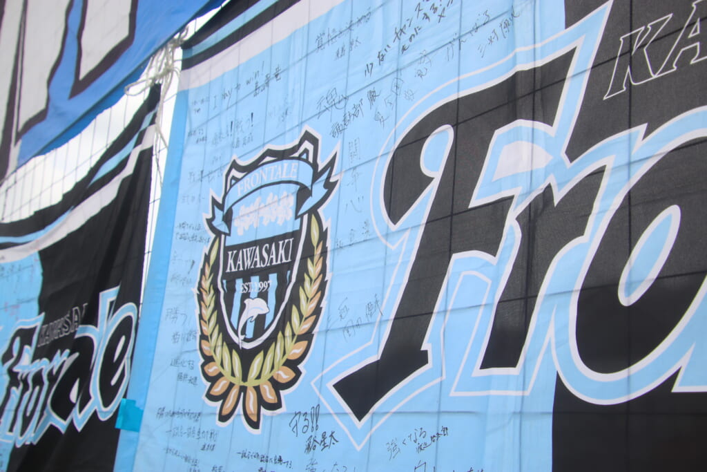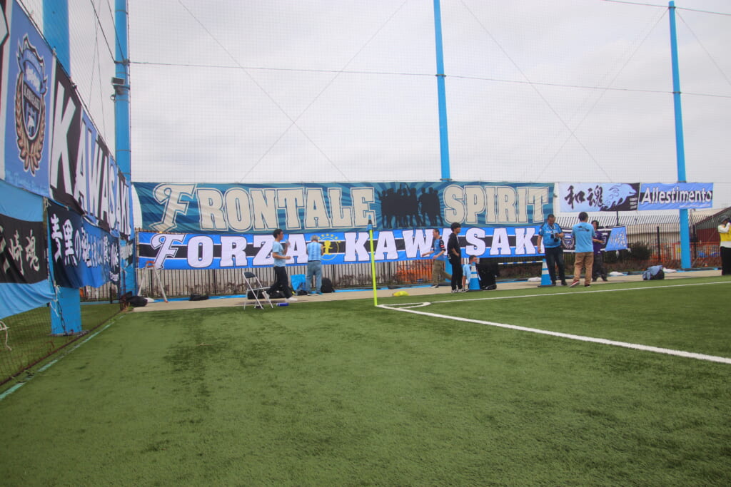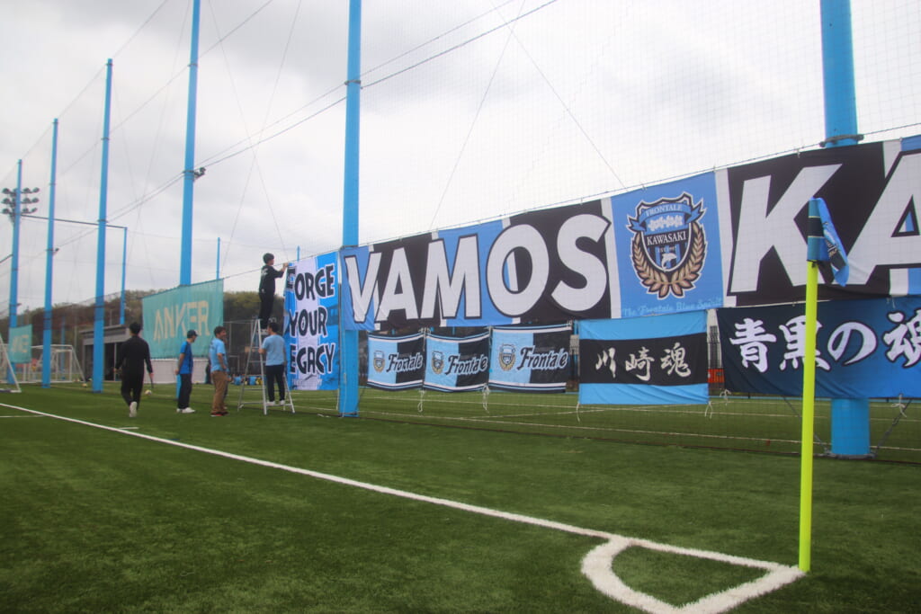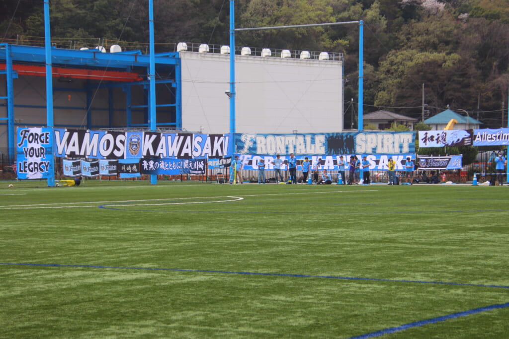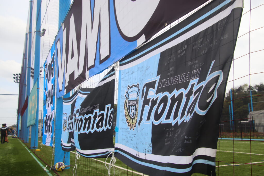 うっすらと雲が広がっているものの、気温が上がり少し汗ばむような気候のAnker フロンタウン生田。両チームの選手の家族らに加え、フロンターレもベガルタも多くのサポーターが集結。フロンターレのサポーターが多くの青い幕を出せば、ベガルタのサポーターも金色の幕を出し、手拍子で選手たちを励ます。
