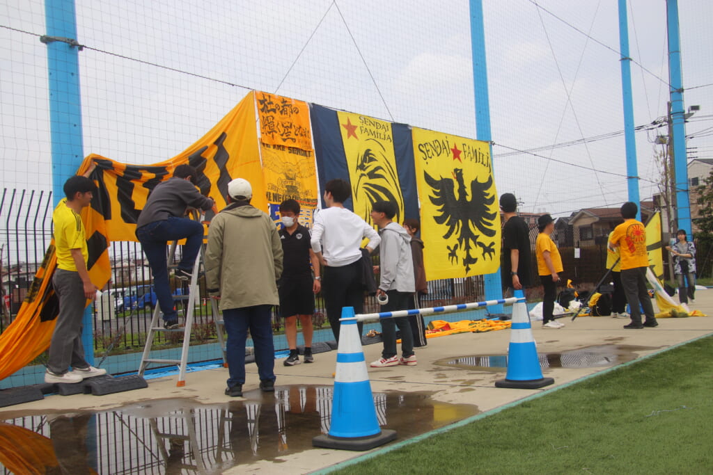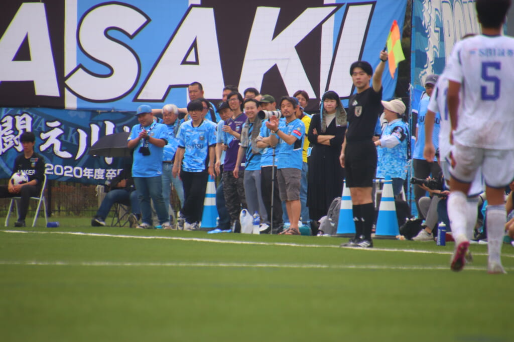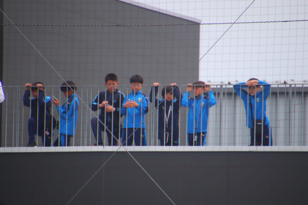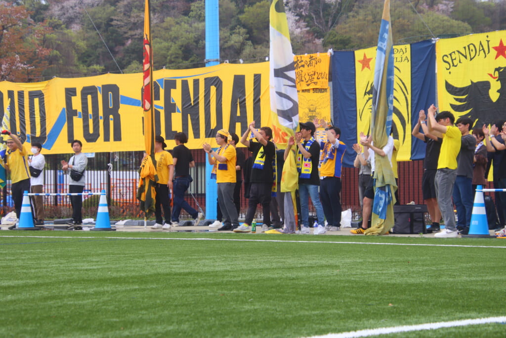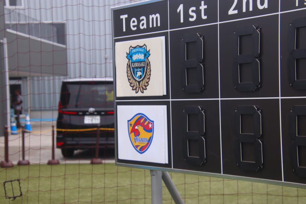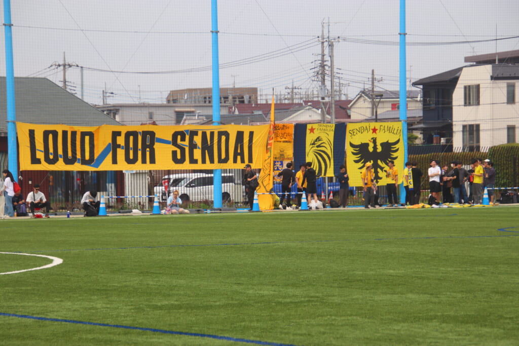 うっすらと雲が広がっているものの、気温が上がり少し汗ばむような気候のAnker フロンタウン生田。両チームの選手の家族らに加え、フロンターレもベガルタも多くのサポーターが集結。フロンターレのサポーターが多くの青い幕を出せば、ベガルタのサポーターも金色の幕を出し、手拍子で選手たちを励ます。